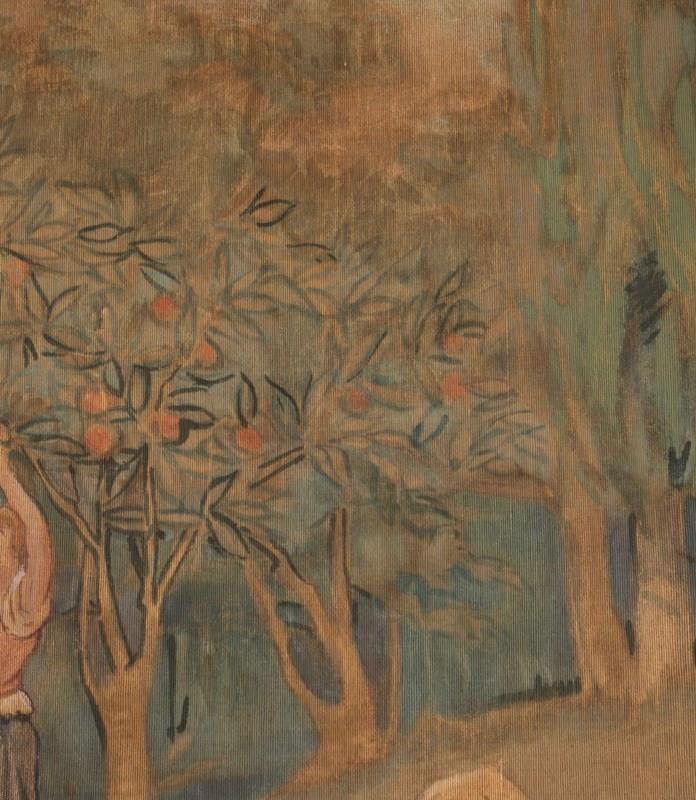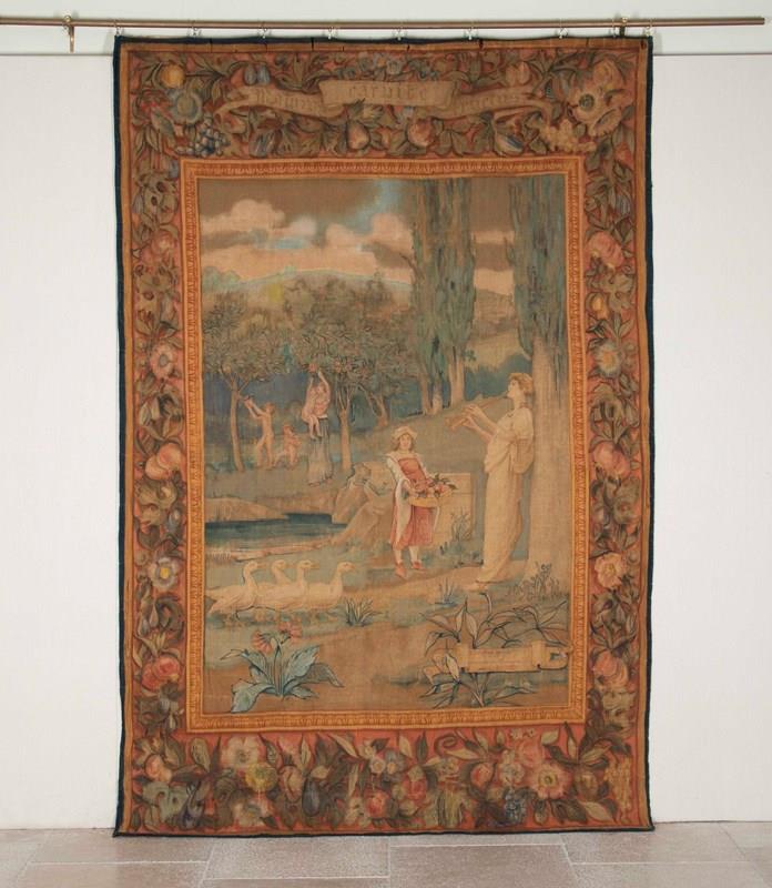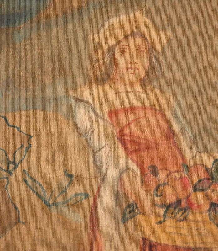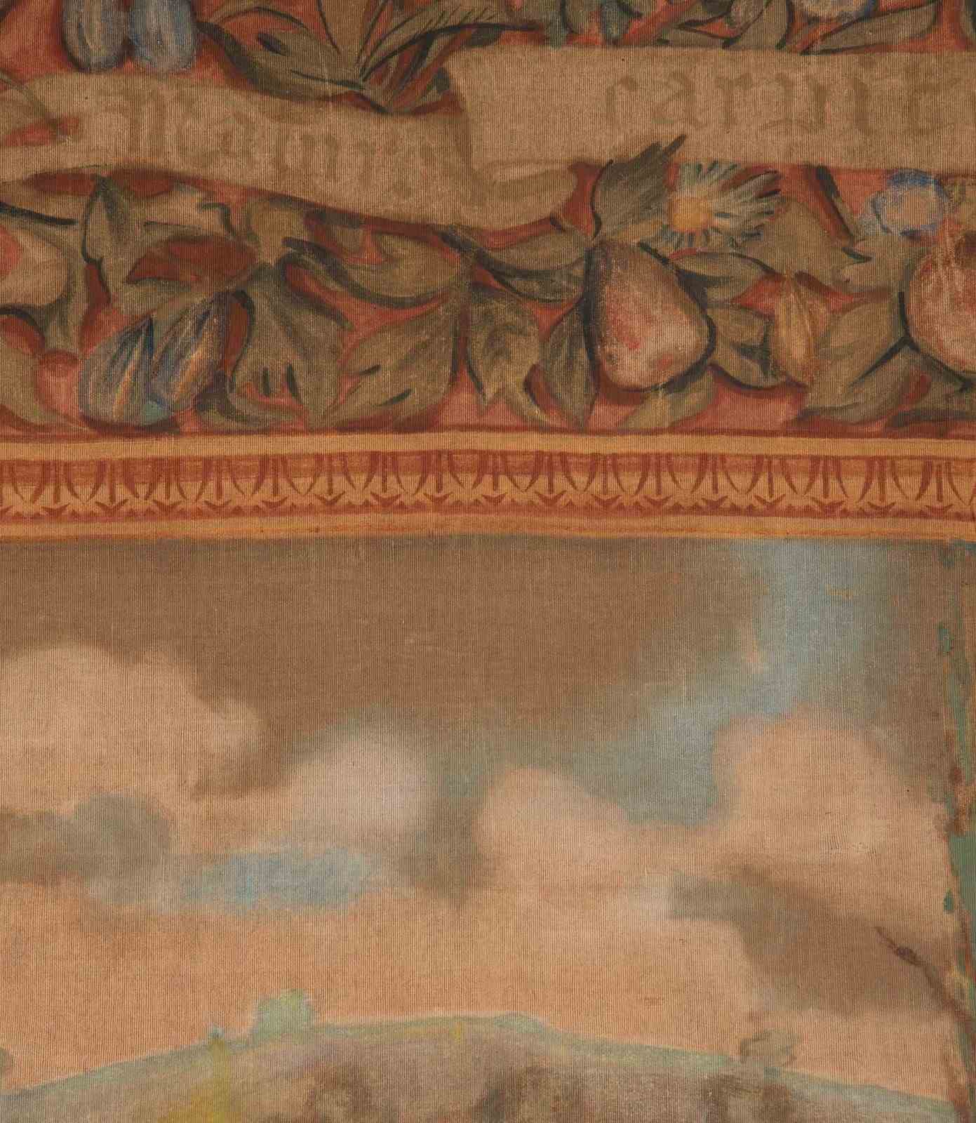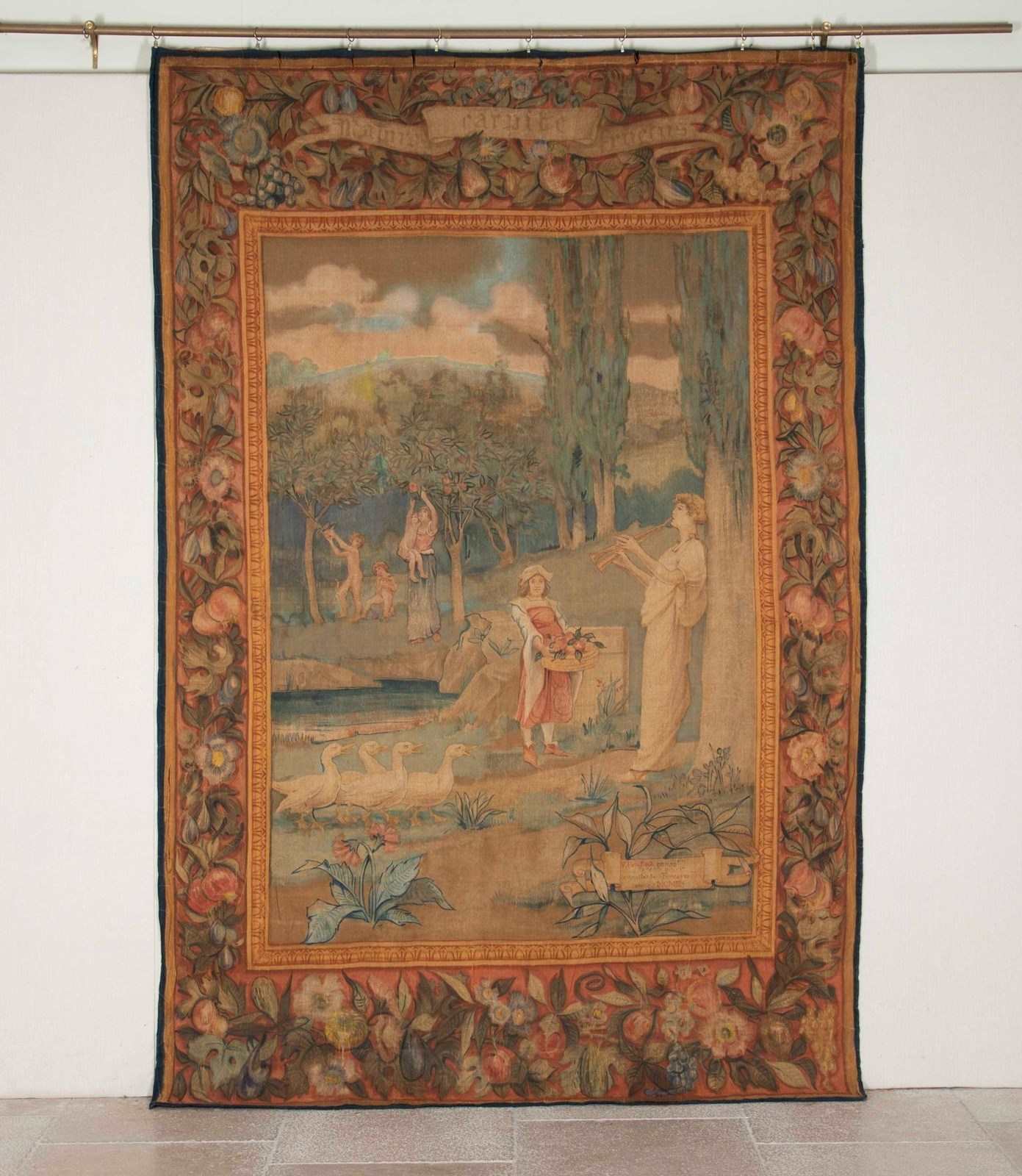 A second scroll at the lower right contains the artist’s signature and inscription. Likely created as a wall hanging or decorative overdoor panel, the piece reflects the early-20th-century Italian fascination with neo-Renaissance ornament and Arcadian subject matter. The subtle wear and patination of the textile lend it a soft, atmospheric character. Signed: V. Peratius Bonon. Tarenti pinxit, committente Ferrario, anno MCMIII Origin: Italy (Taranto / Bologna).