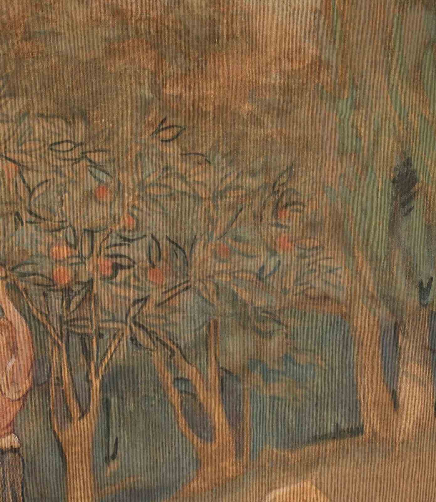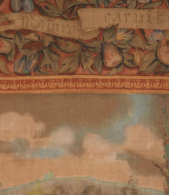 Dated MCMIII (1903). Executed in Taranto under the commission of Ferrario, the work combines early 20th Century decorative painting with strong Renaissance revival influences. The central panel shows an idyllic rural landscape: a flautist stands beneath tall cypress trees, serenading a young woman carrying a basket of freshly gathered fruit. In the middle distance, children climb and play amongst fruit trees, while a small group of geese wander peacefully beside a stream — all rendered in soft, harmonious tones that evoke a calm, timeless countryside. Surrounding the scene is an elaborate fruiting border painted in warm autumnal colours, densely filled with pomegranates, figs, flowers, and vine work. At the top runs a faded Latin scroll reading “carpite fructus” alongside an earlier word now partially obscured — a classical pastoral motto translating to “pluck the fruits,” reinforcing the theme of abundance and the joys of rural life.