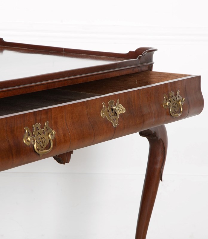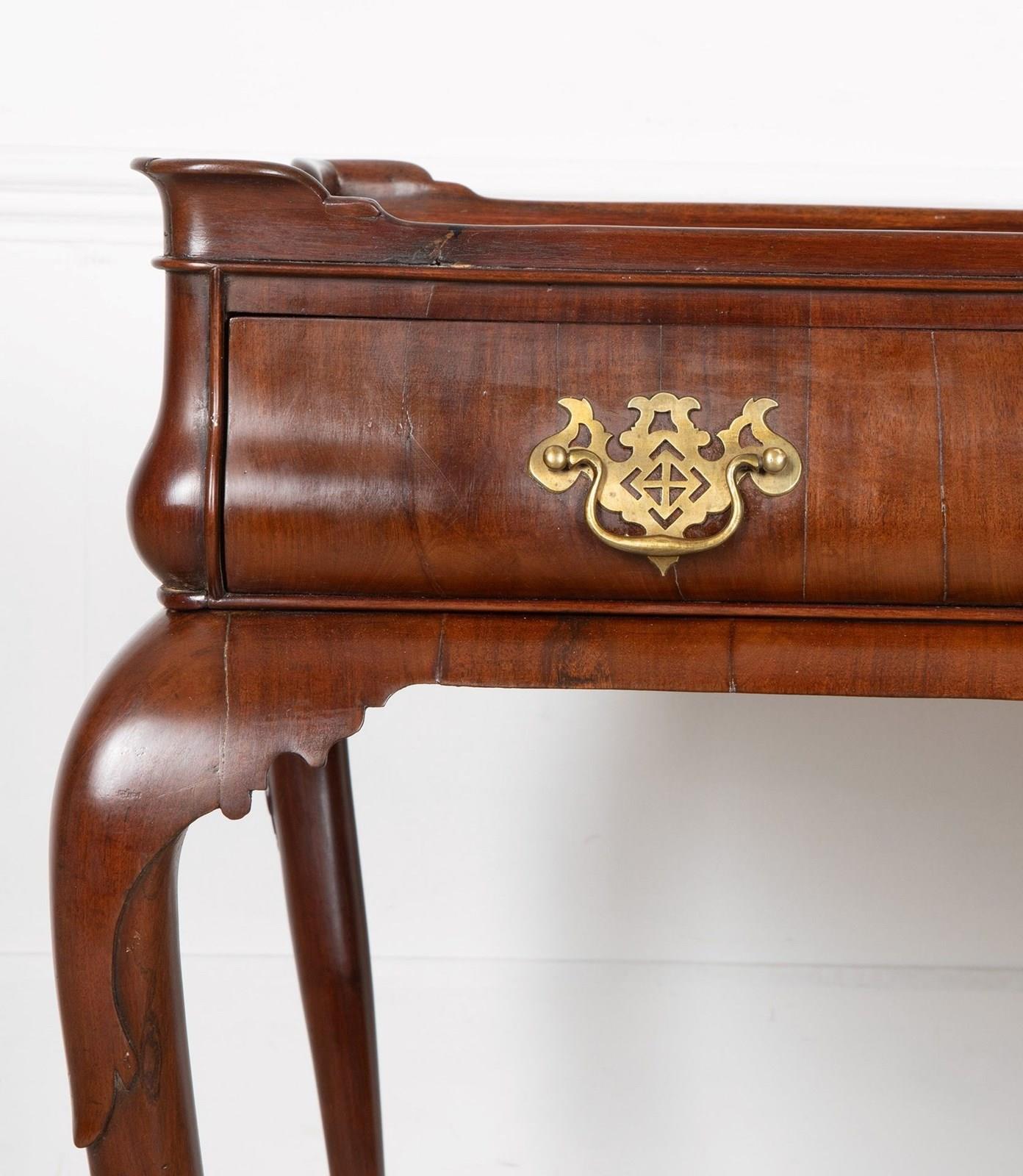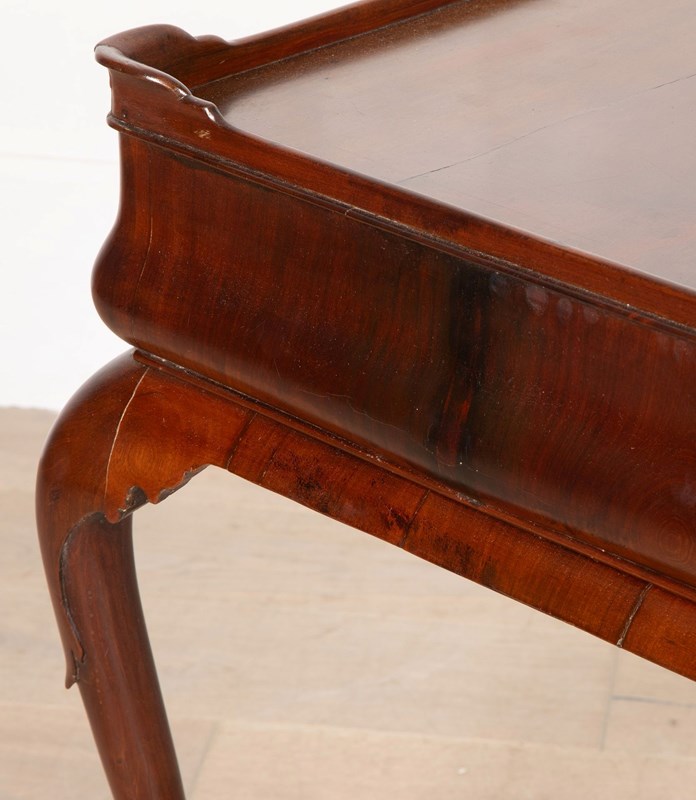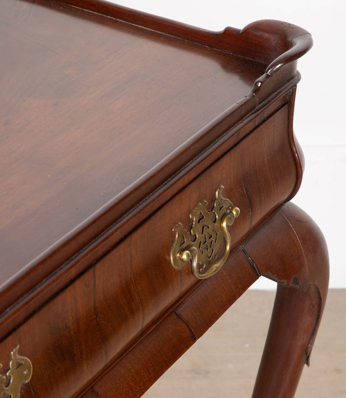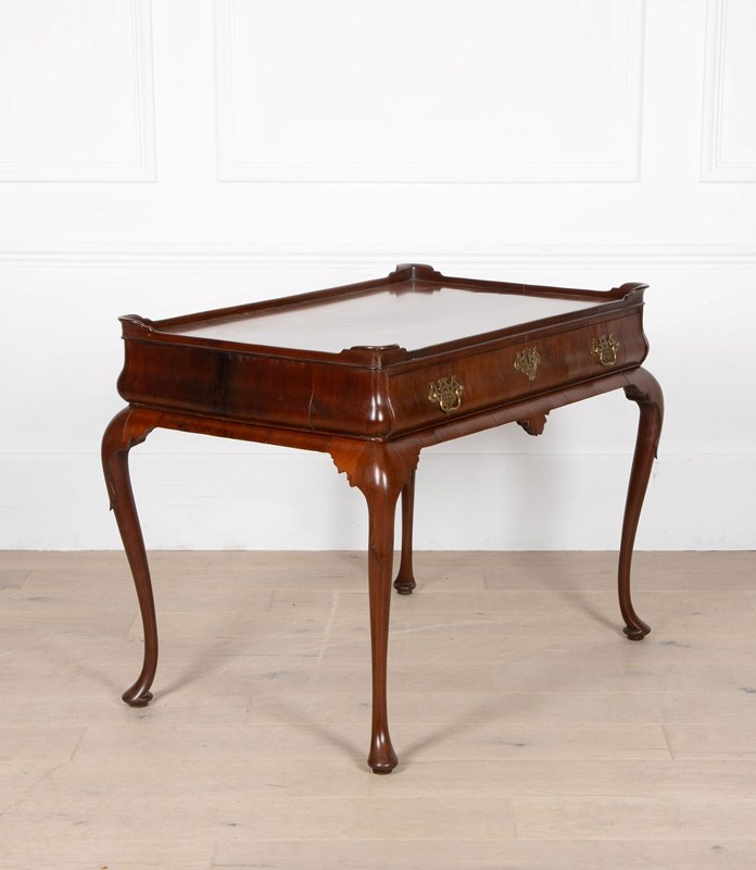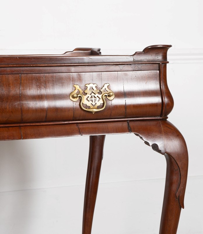 A fine George II mahogany tray top side top side table, the top with moulded edge and full length drawer to the bellied frieze, the whole supported on elegant cabriole legs terminating in pad feet. A noteworthy point regarding this table is the bellied frieze. Whilst this is not a rare feature, it nonetheless emphasises the high quality of this table.