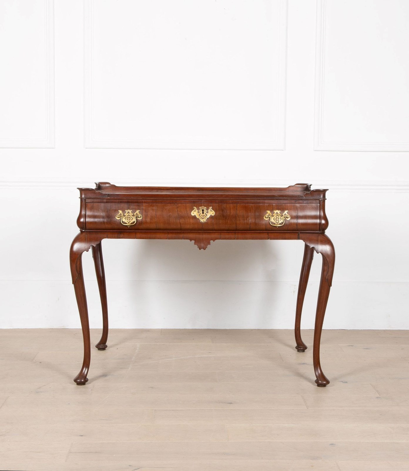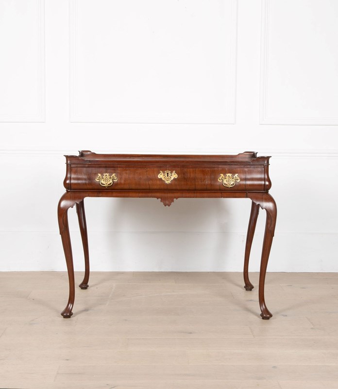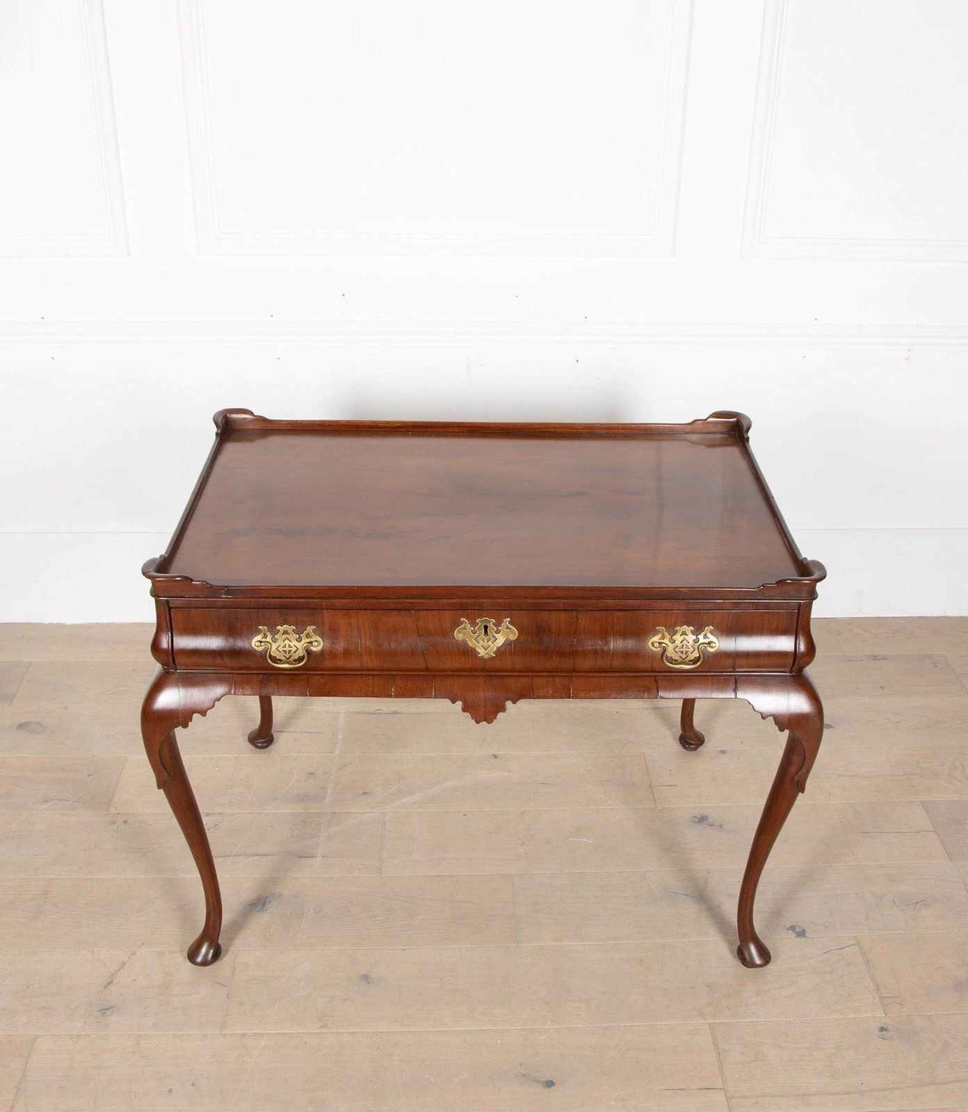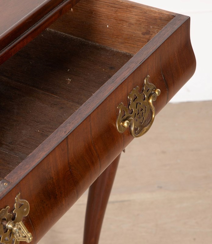 A fine George II mahogany tray top side top side table, the top with moulded edge and full length drawer to the bellied frieze, the whole supported on elegant cabriole legs terminating in pad feet. A noteworthy point regarding this table is the bellied frieze. Whilst this is not a rare feature, it nonetheless emphasises the high quality of this table.