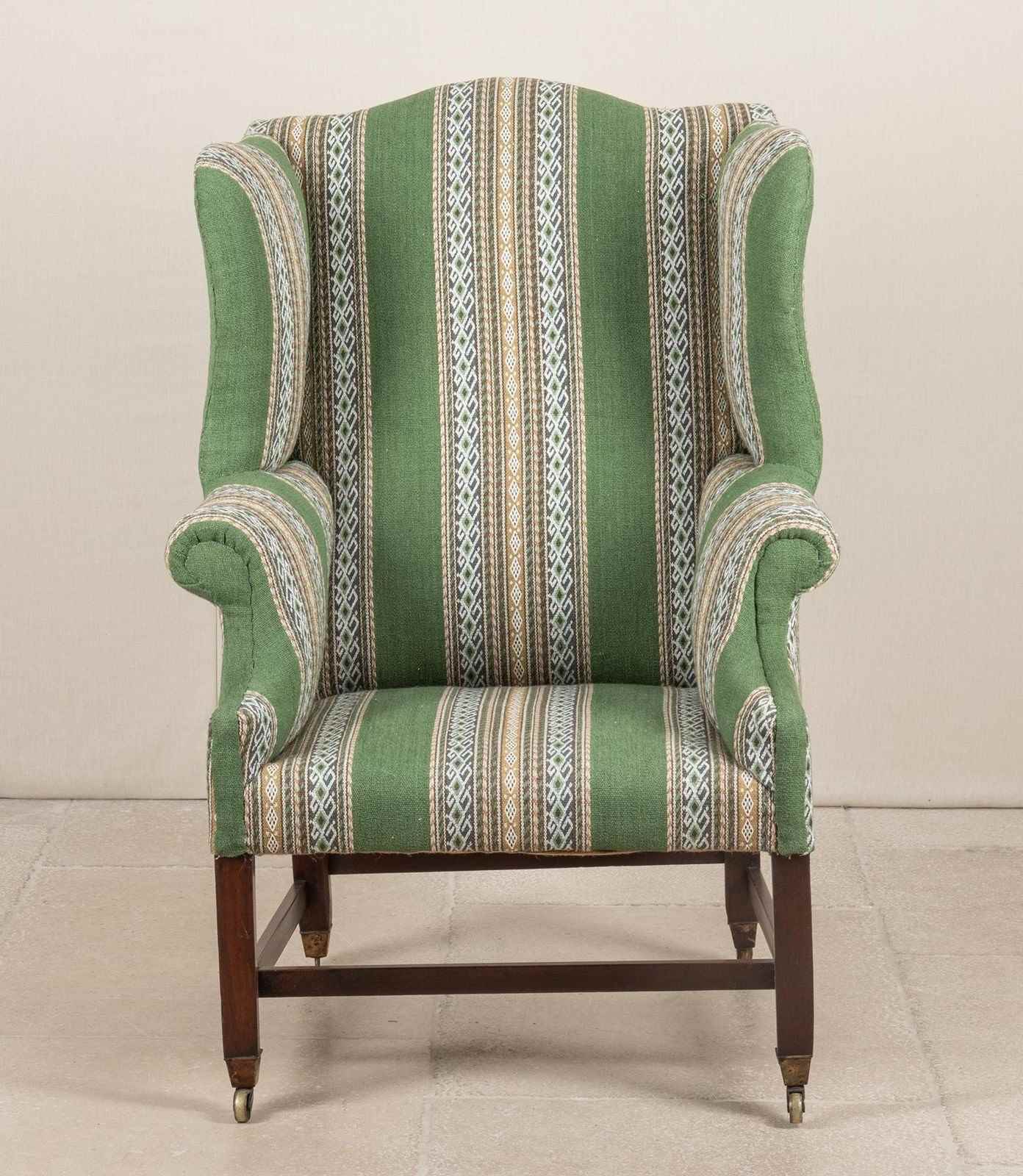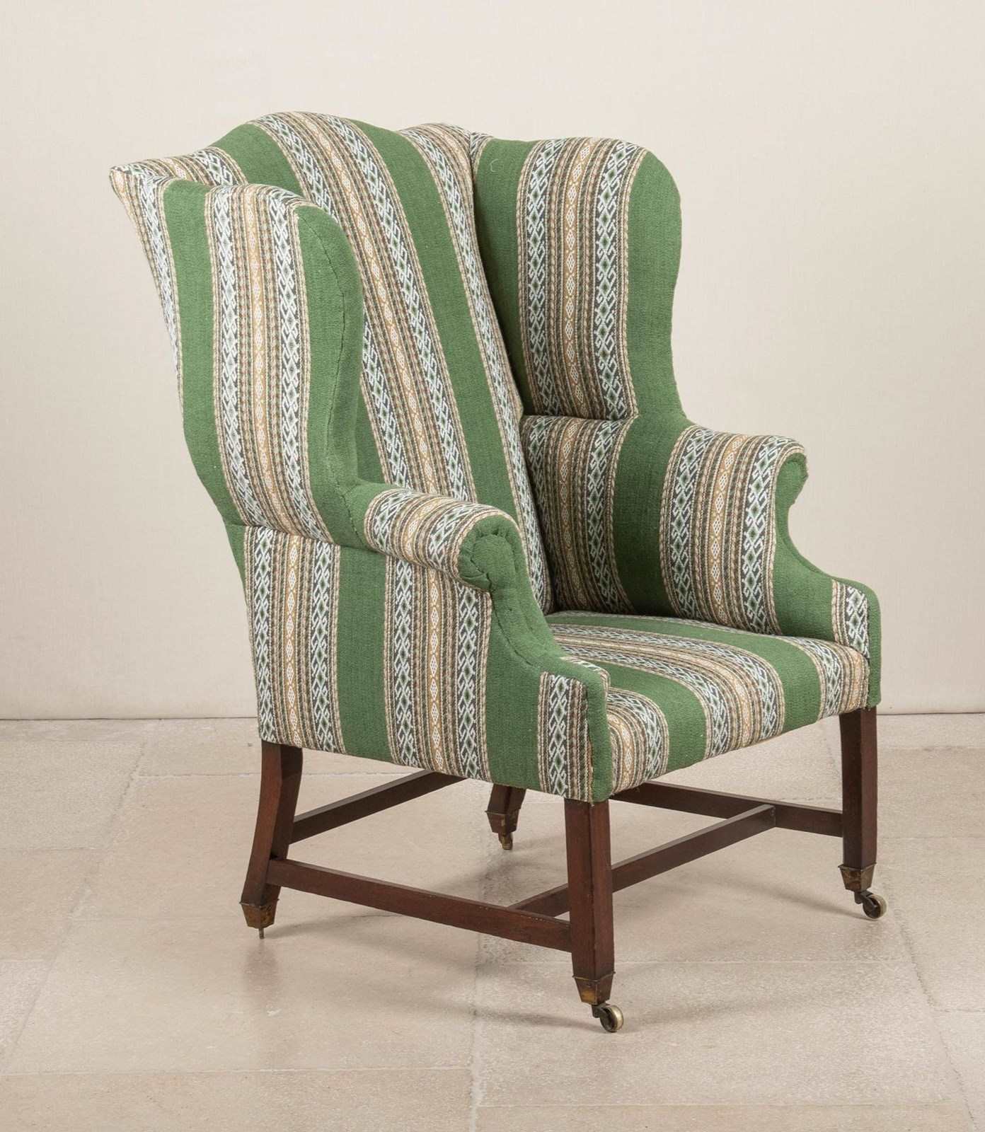A late George III period wing armchair on mahogany legs, united by an H stretcher and terminating in tapered spade brass caps and casters.