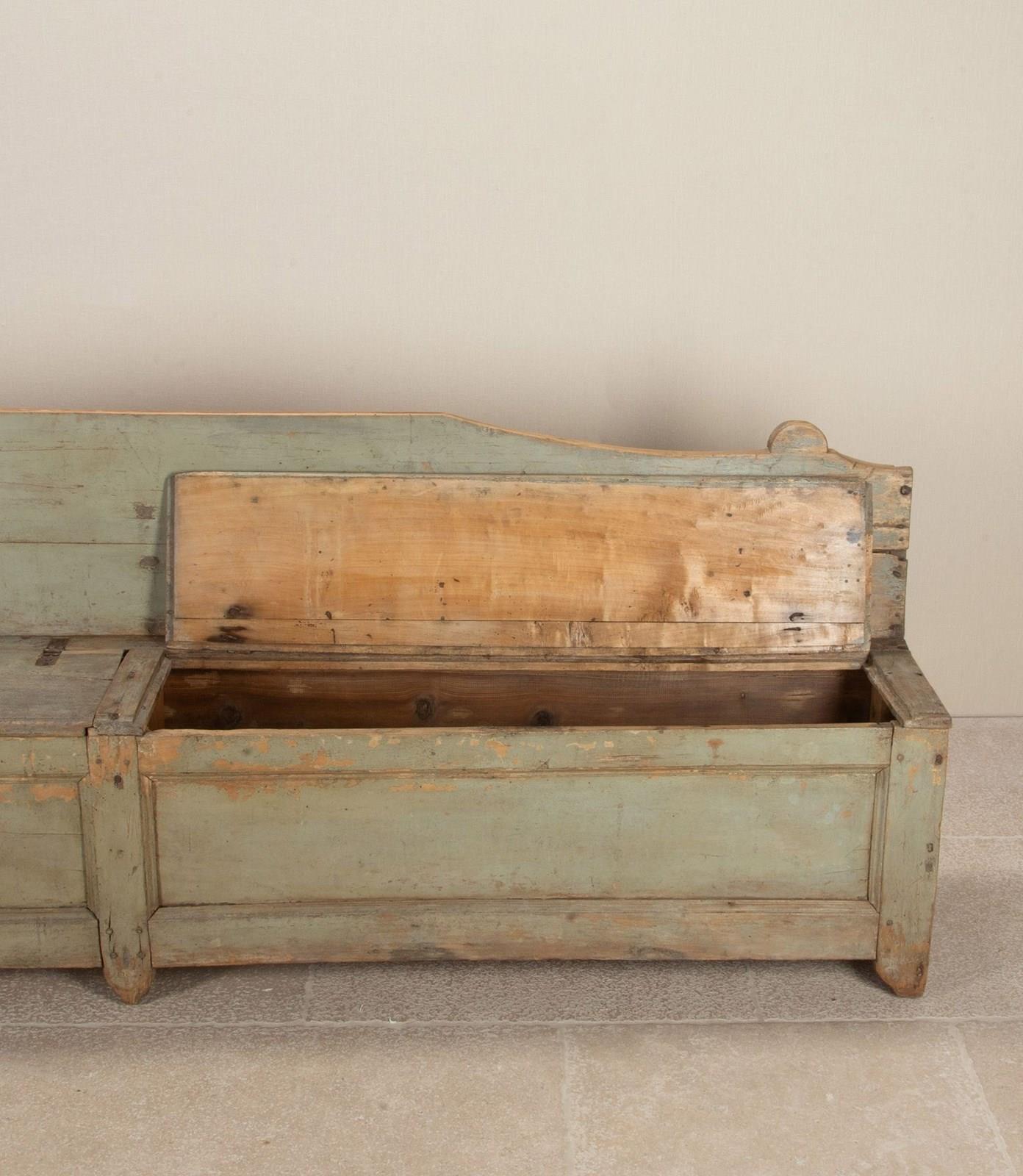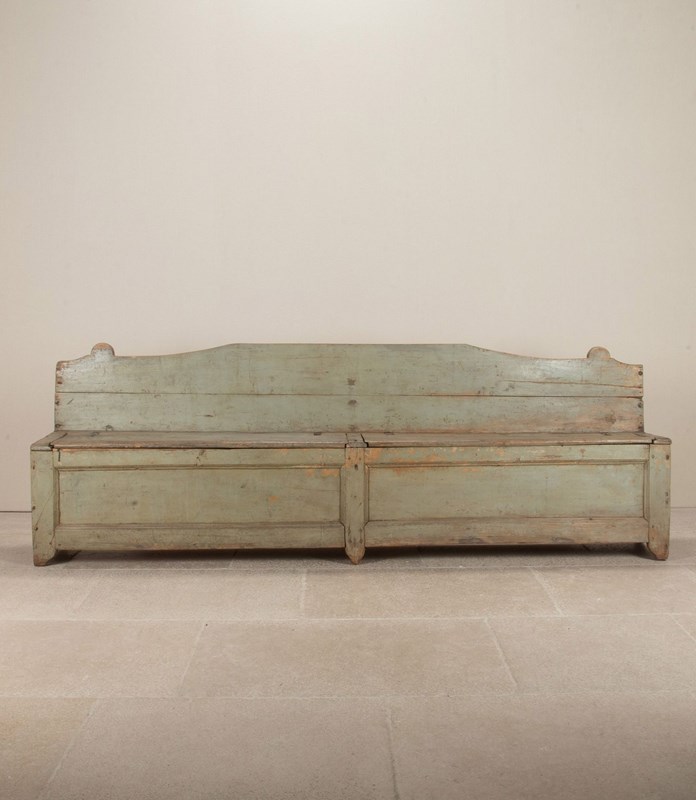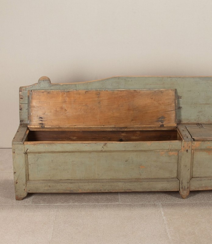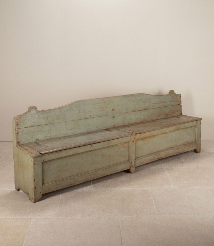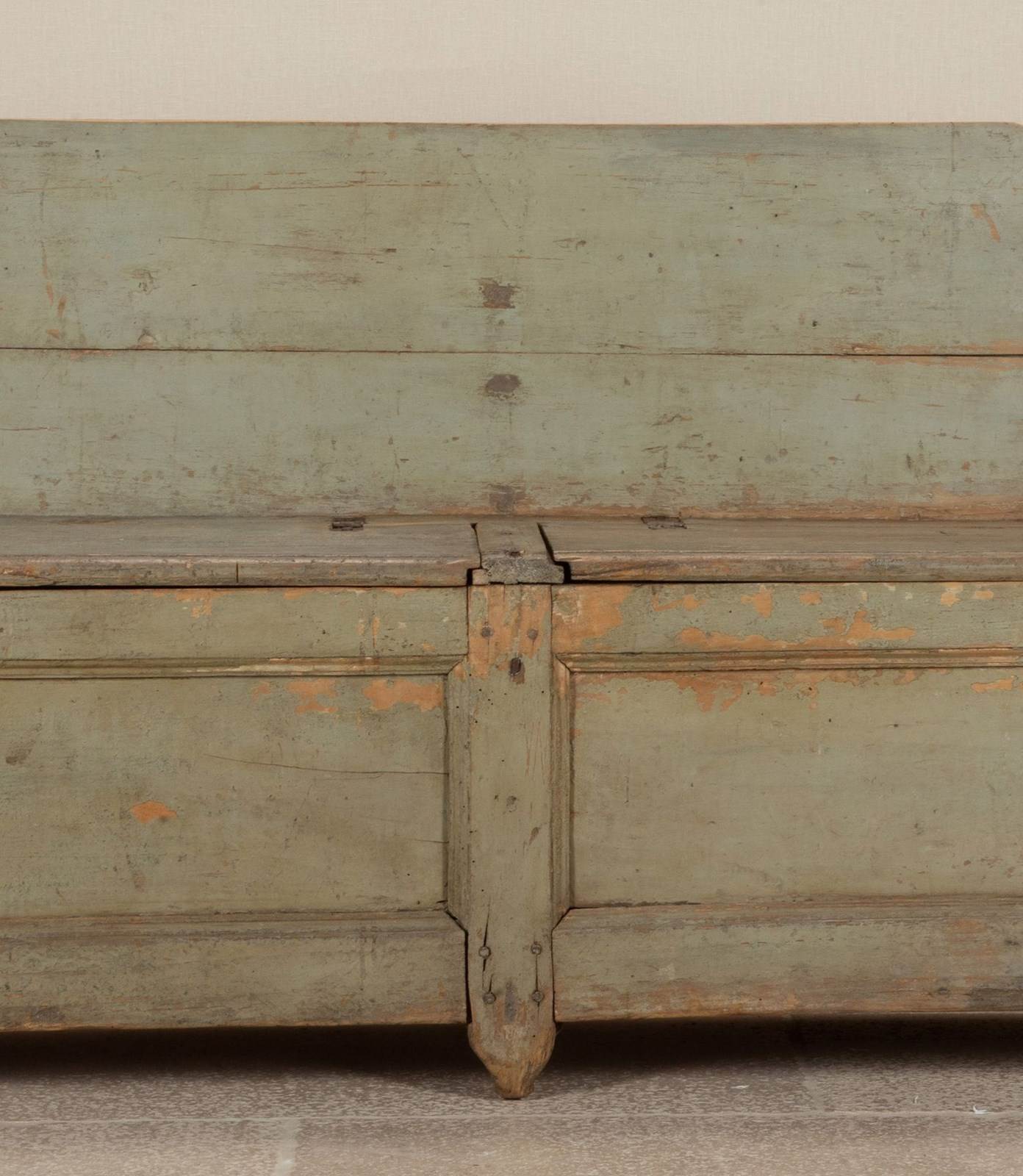 Late 18th Century Italian bench or seat with original painted pastel pale grey patina. With two hinged seats for storage.