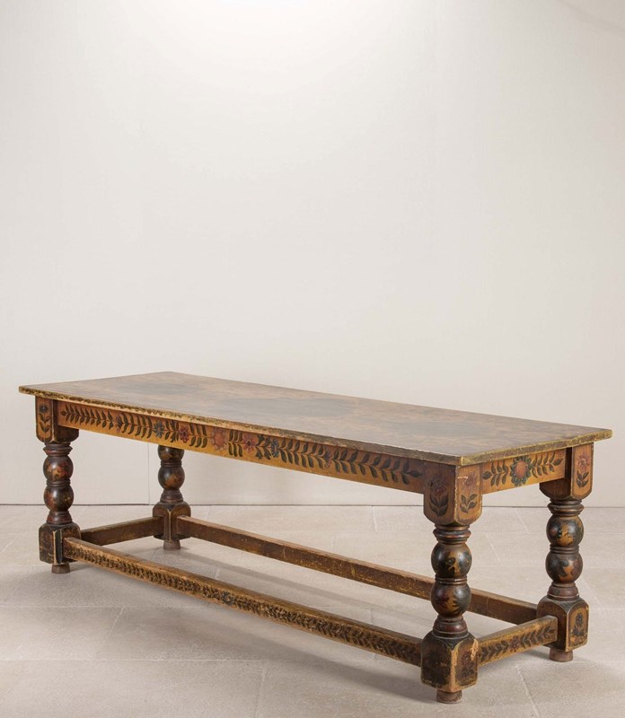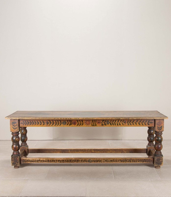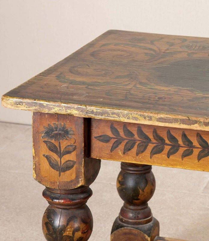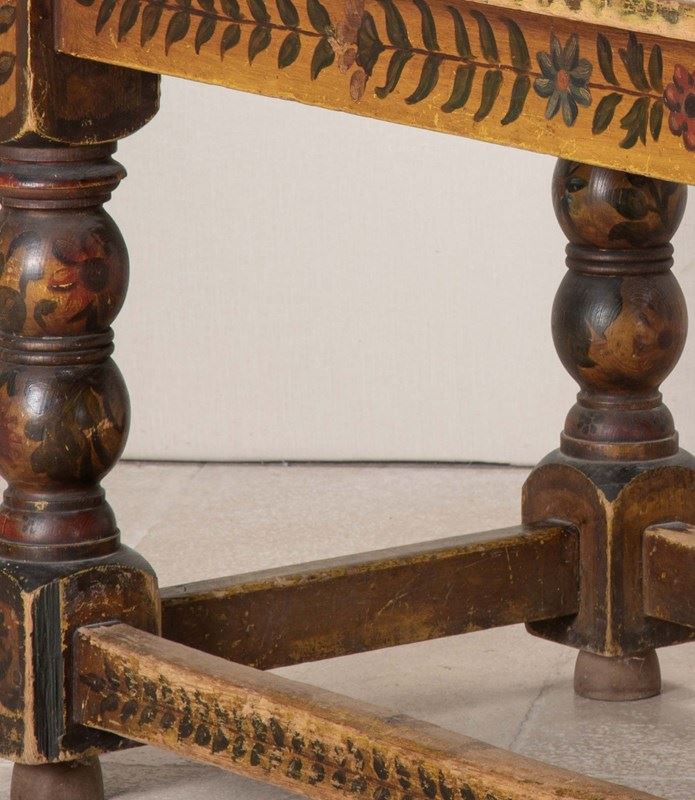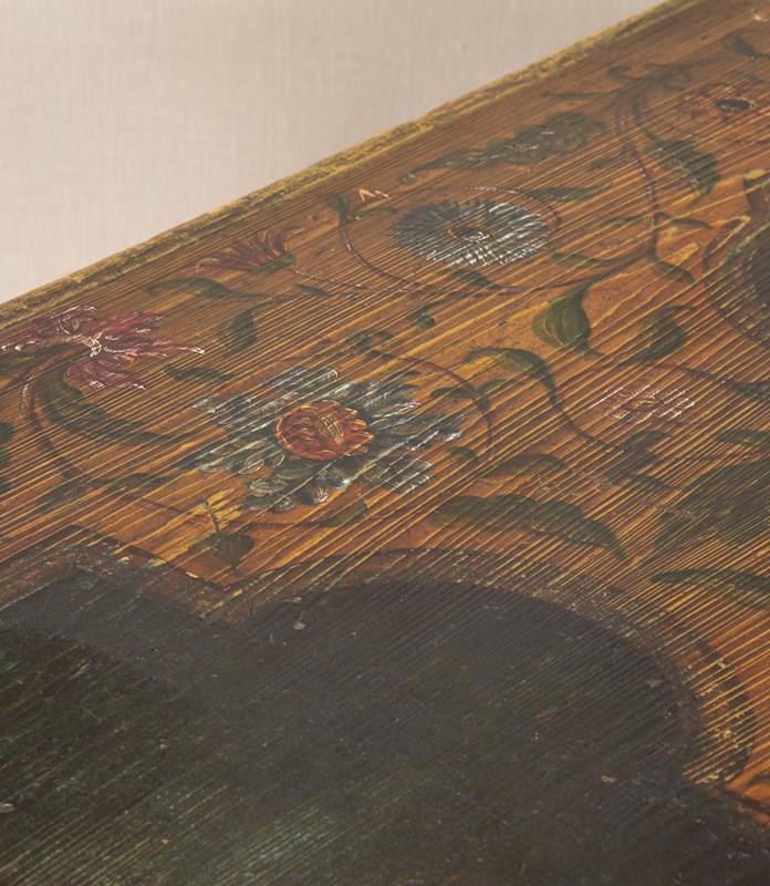 Beautifully decorated with flowers, scrolls and leaves. The base colour is a rich yellow with the grain of the wood showing through.