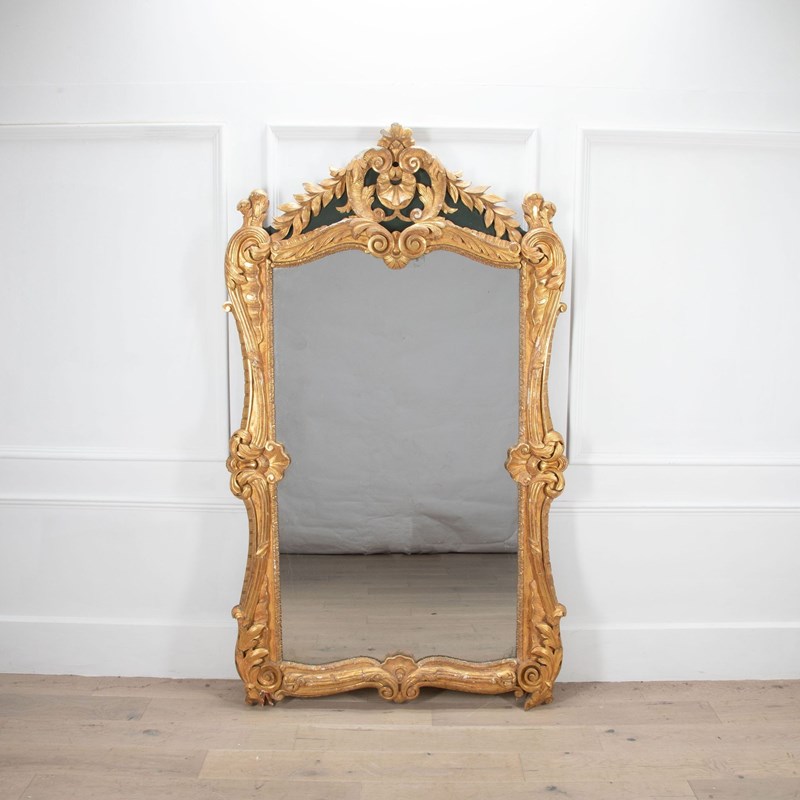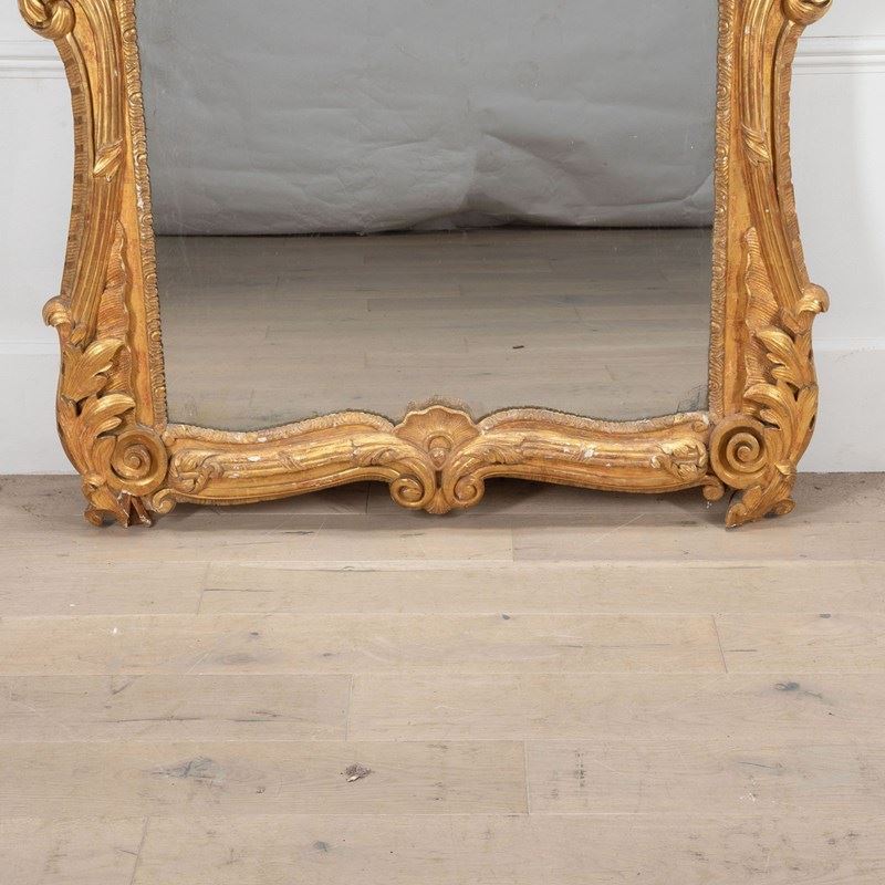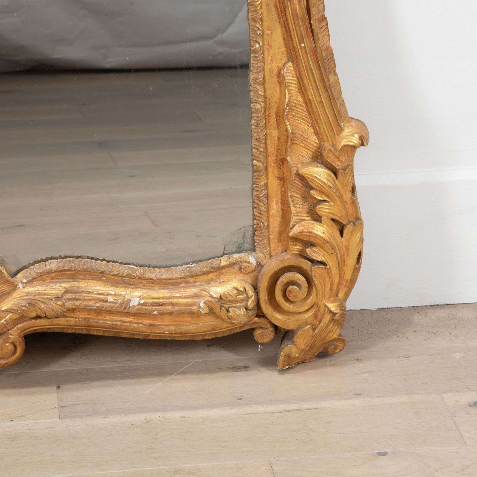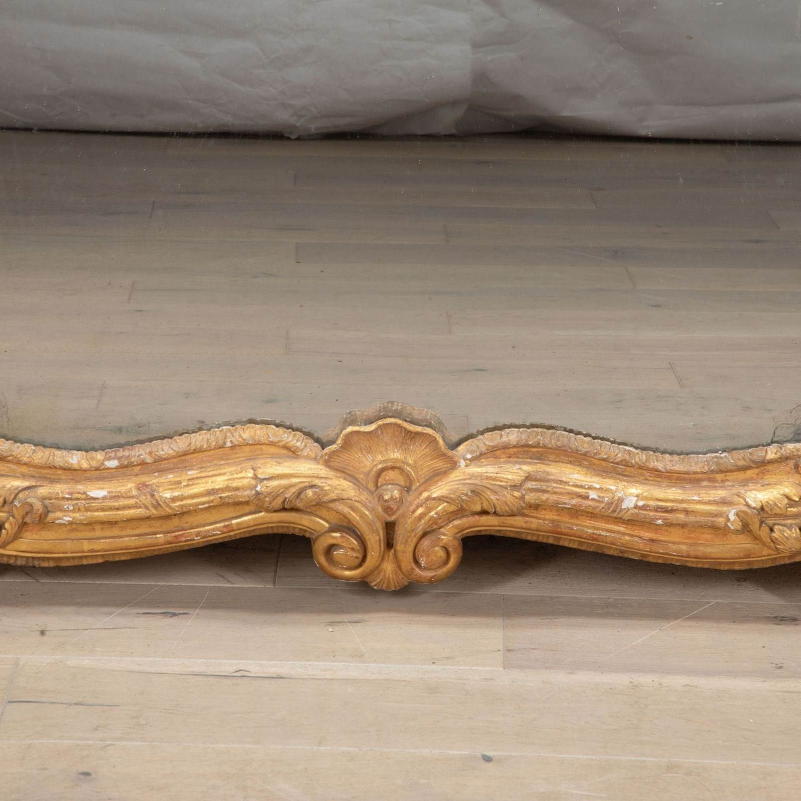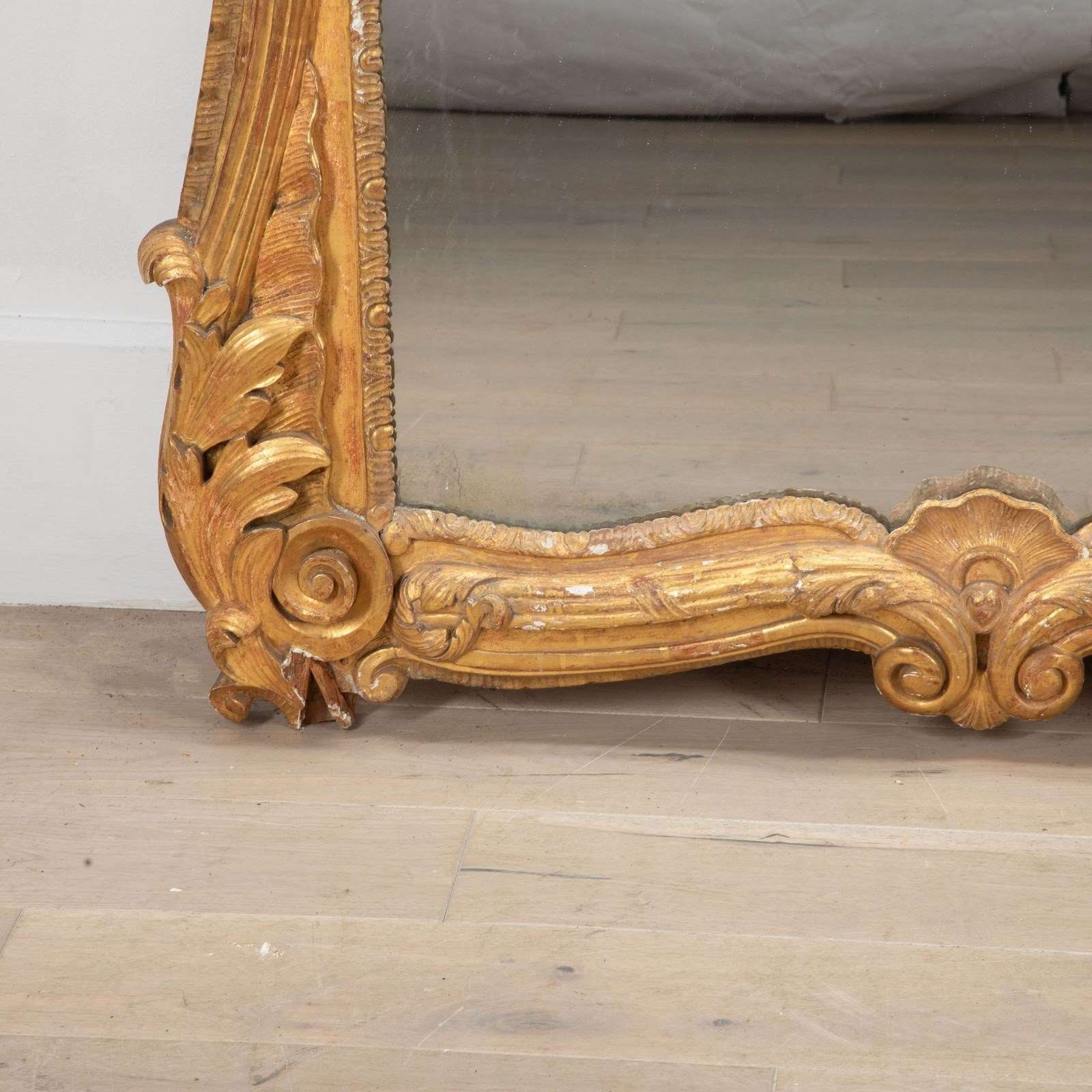 A large 19th Century French country house mirror in untouched condition. With original mercury glass plate and deeply carved gilt wood frame. Original boarded back. Circa 1850.
