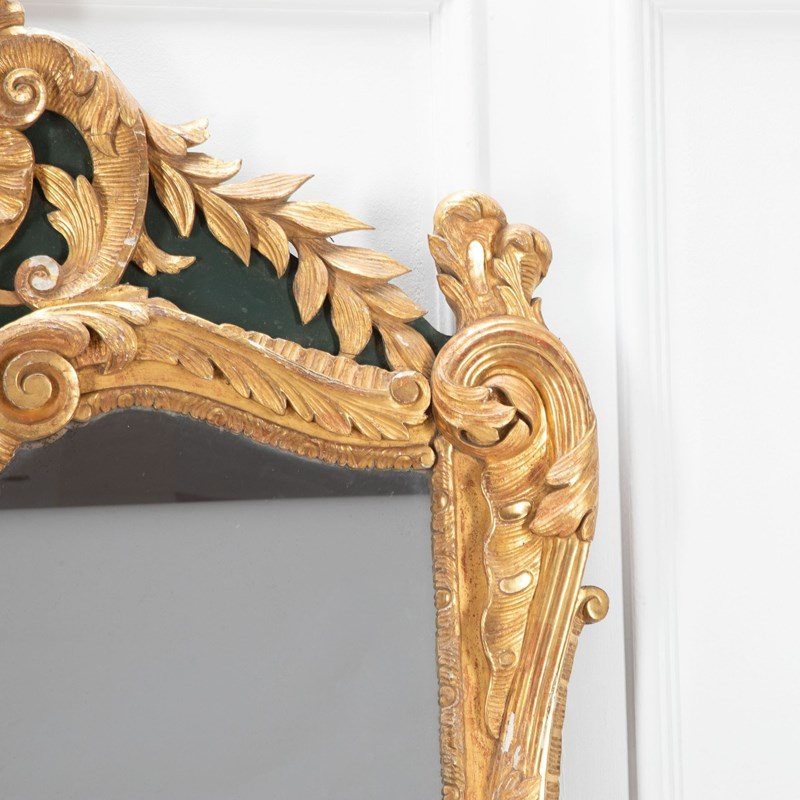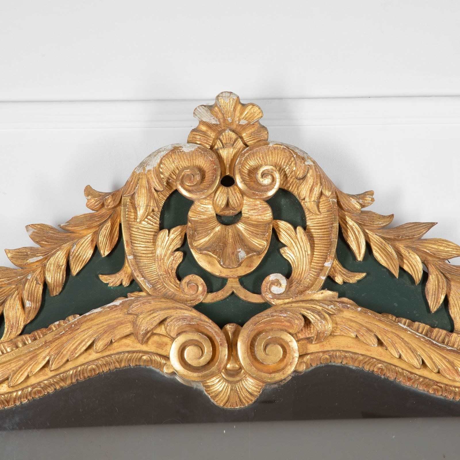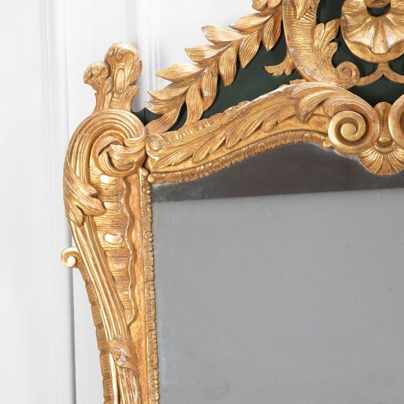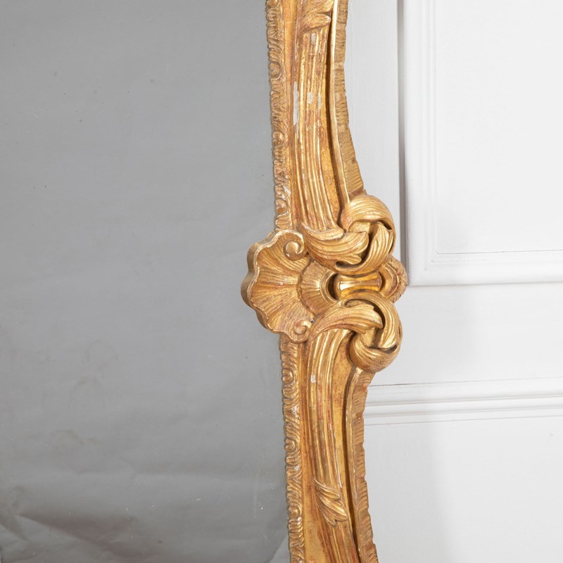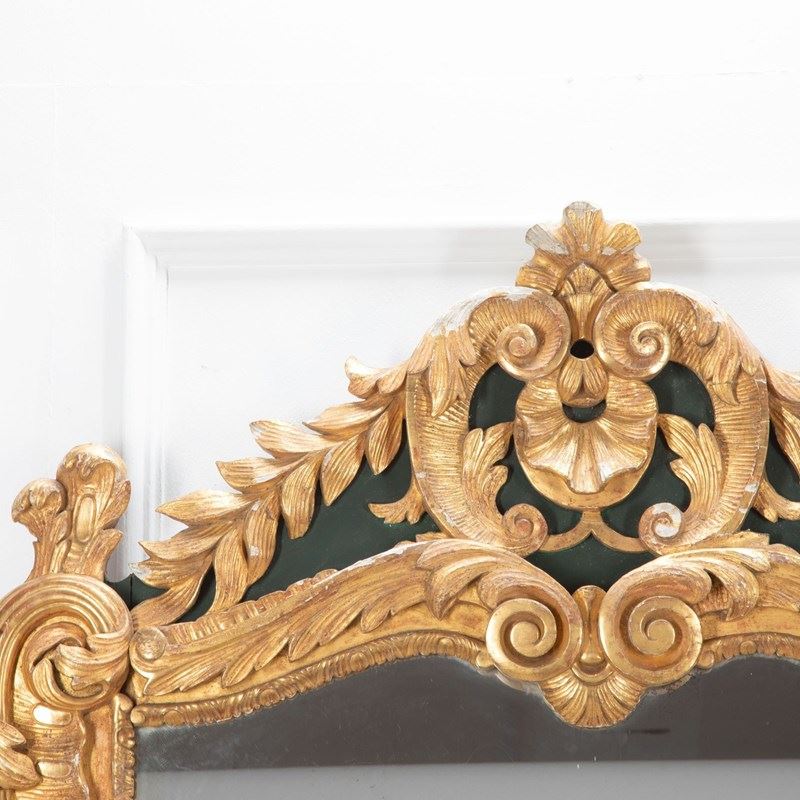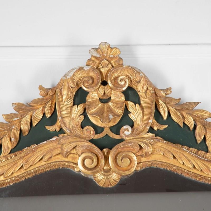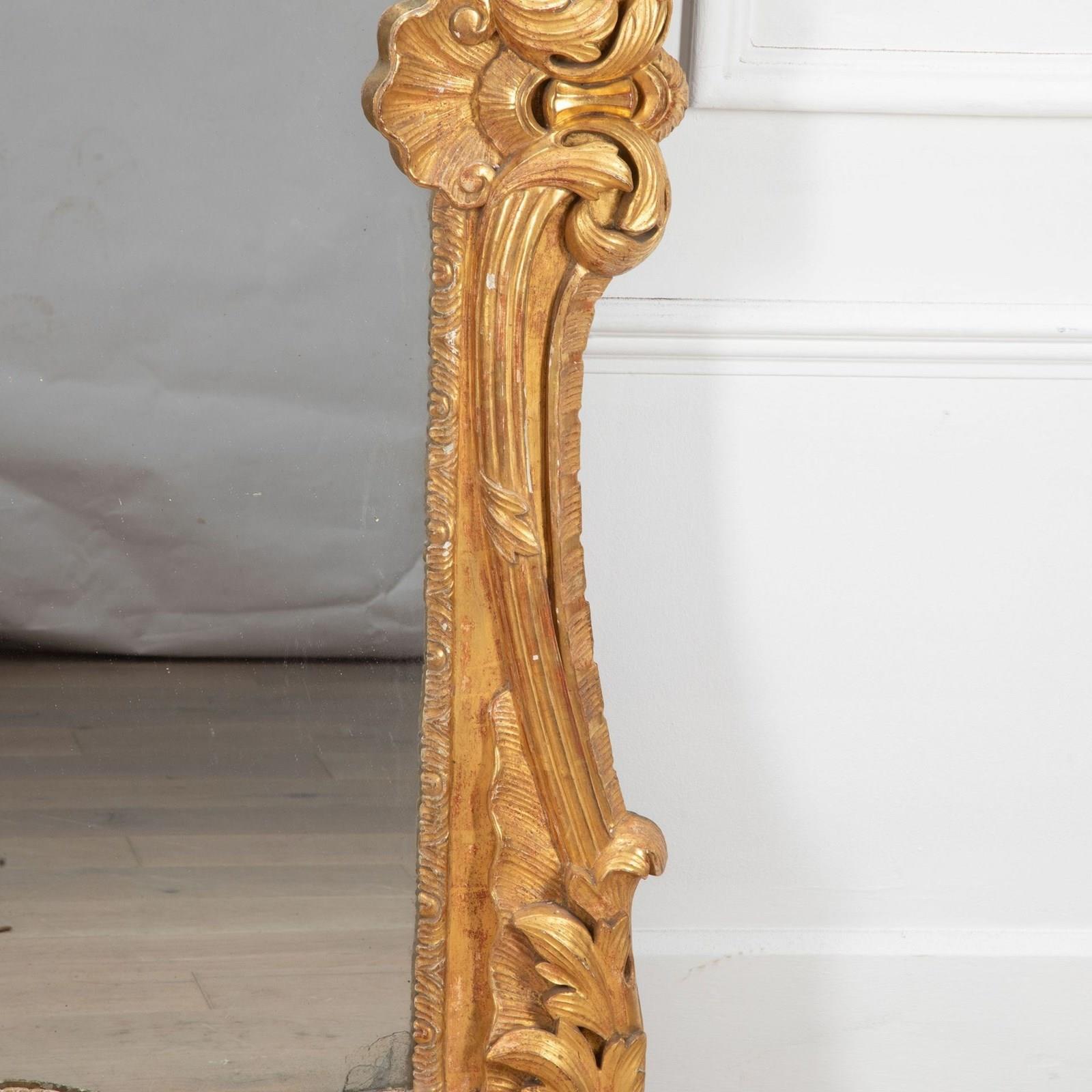 A large 19th Century French country house mirror in untouched condition. With original mercury glass plate and deeply carved gilt wood frame. Original boarded back. Circa 1850.