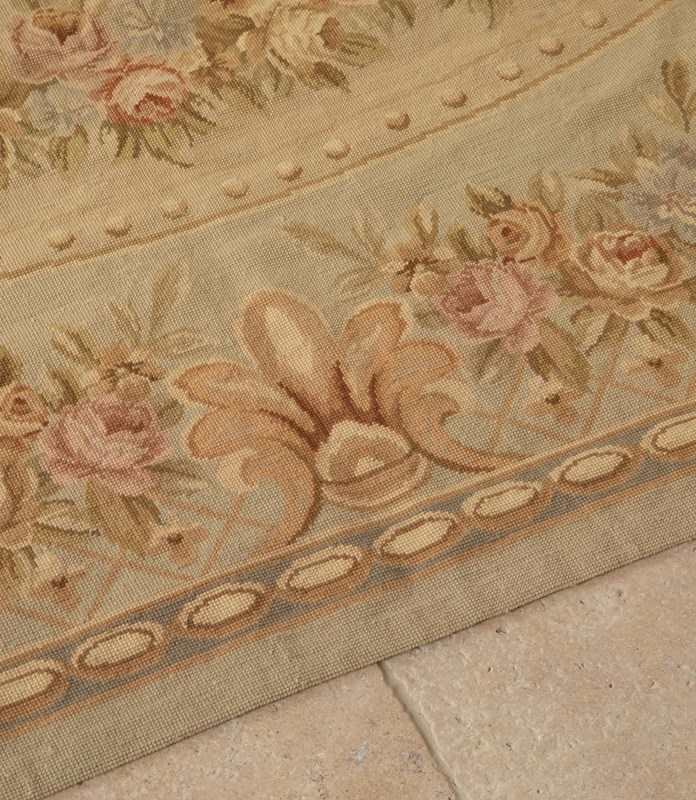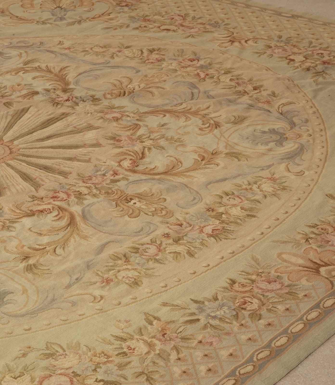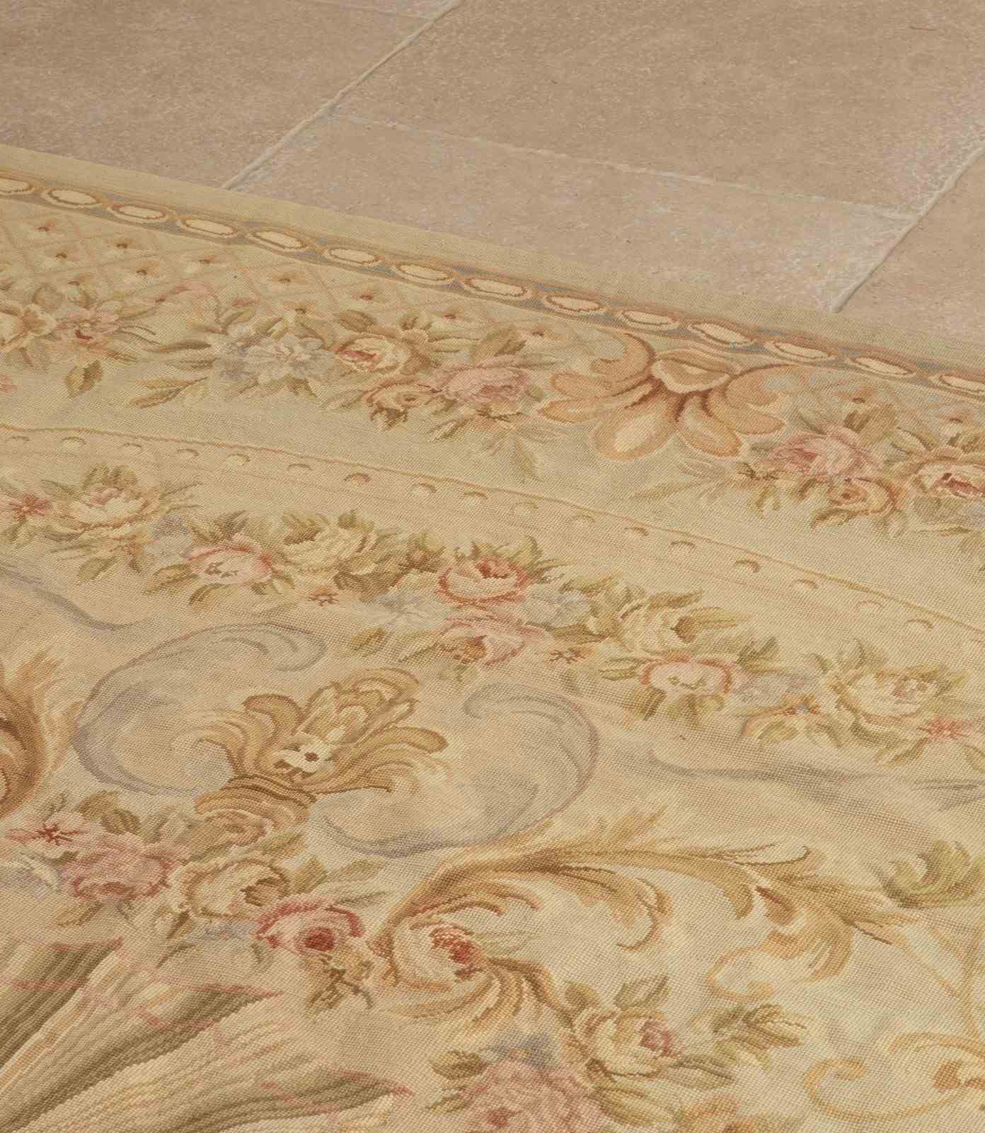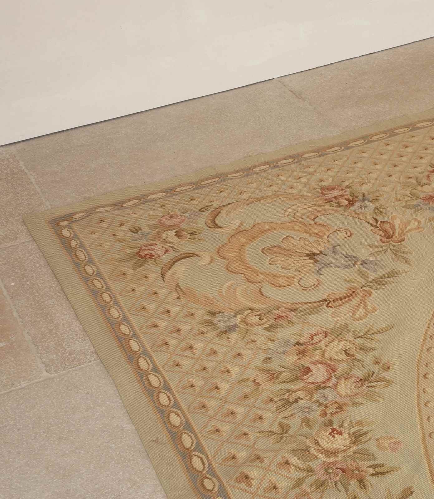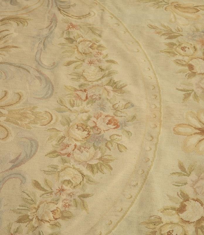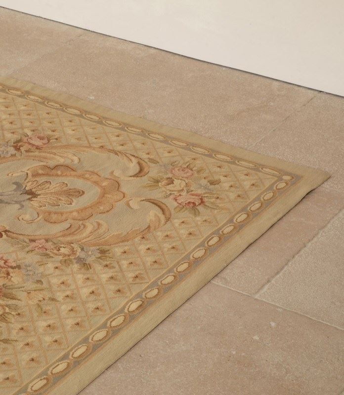 Large early 20th Century French hand-stitched tapestry Aubusson rug of grand proportions and quality. Elegant and delicate decorative design and colours makes it perfect to use as a wall hanging or a rug. In immaculate condition having been dry cleaned.