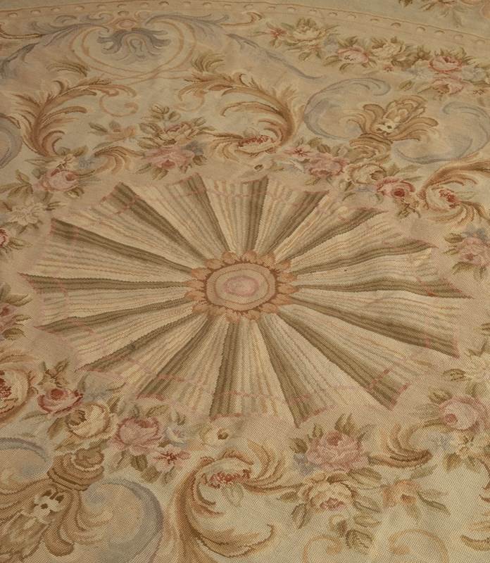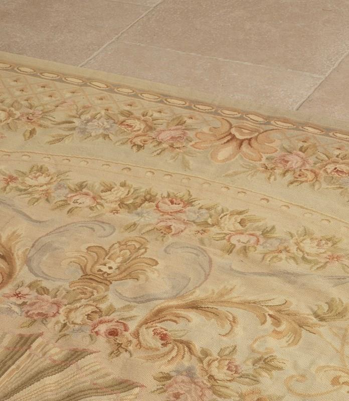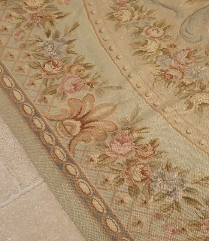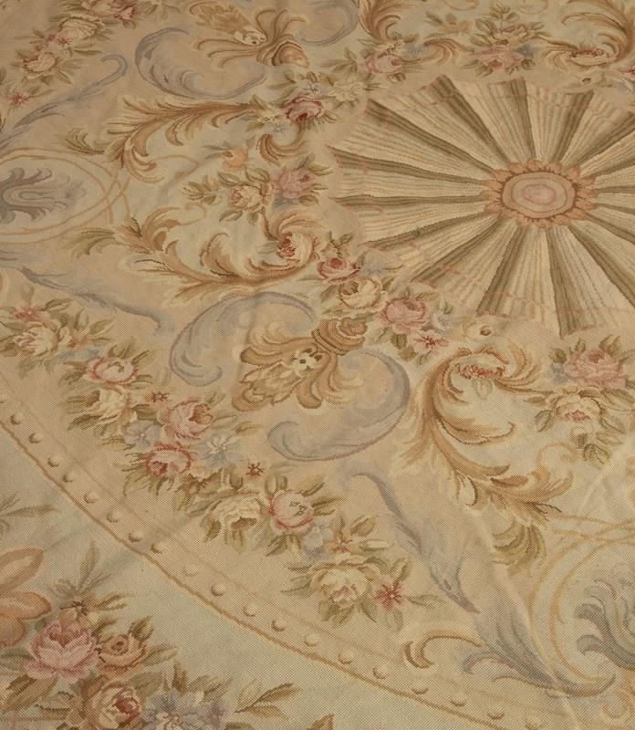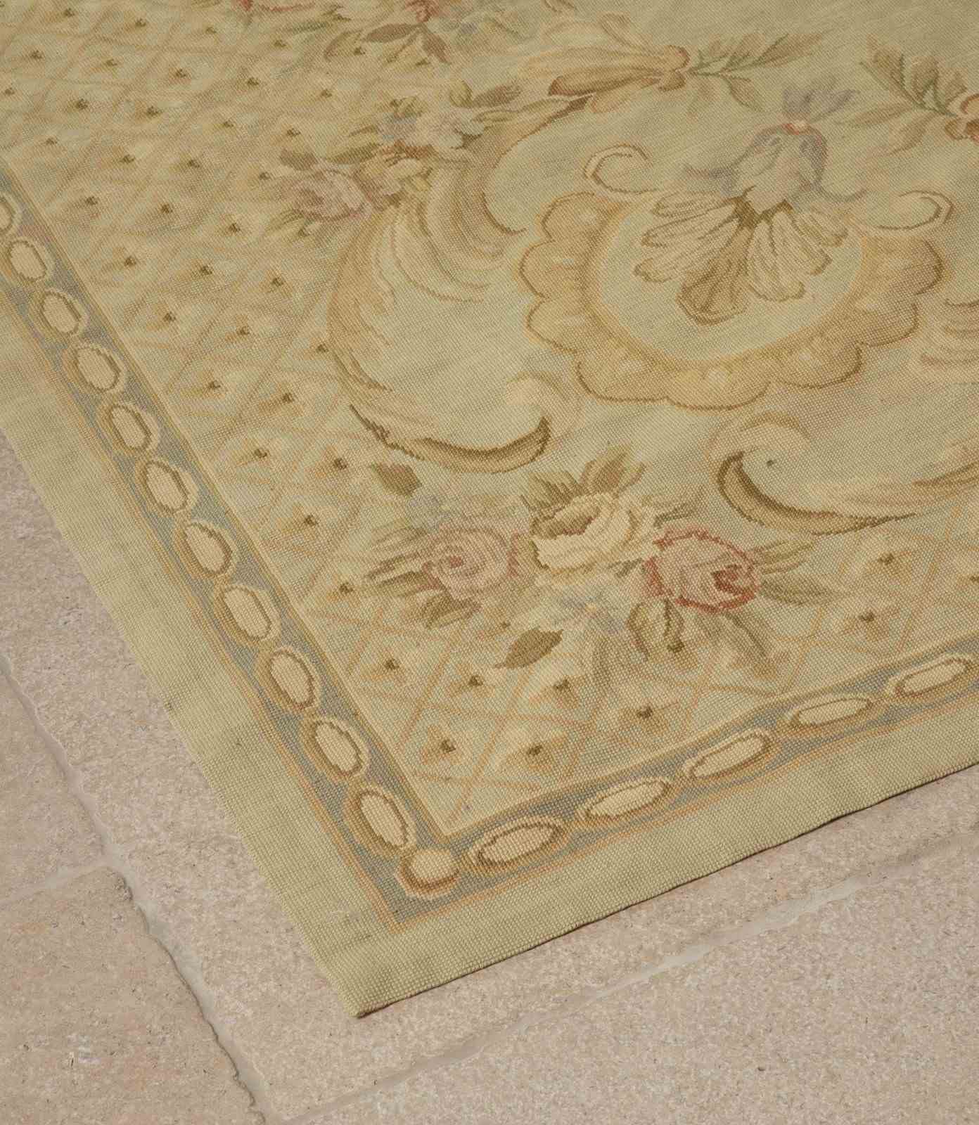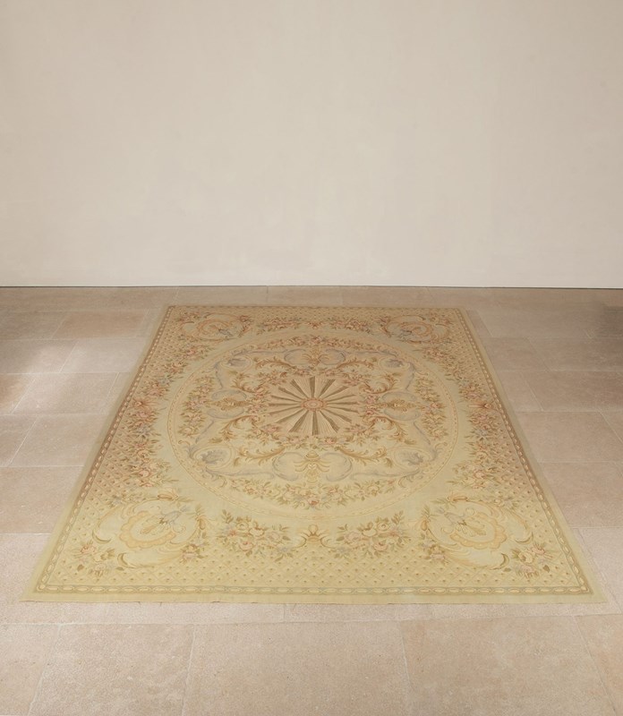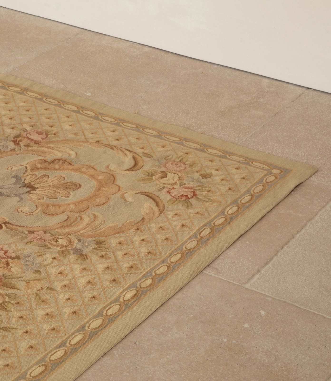 Large early 20th Century French hand-stitched tapestry Aubusson rug of grand proportions and quality. Elegant and delicate decorative design and colours makes it perfect to use as a wall hanging or a rug. In immaculate condition having been dry cleaned.