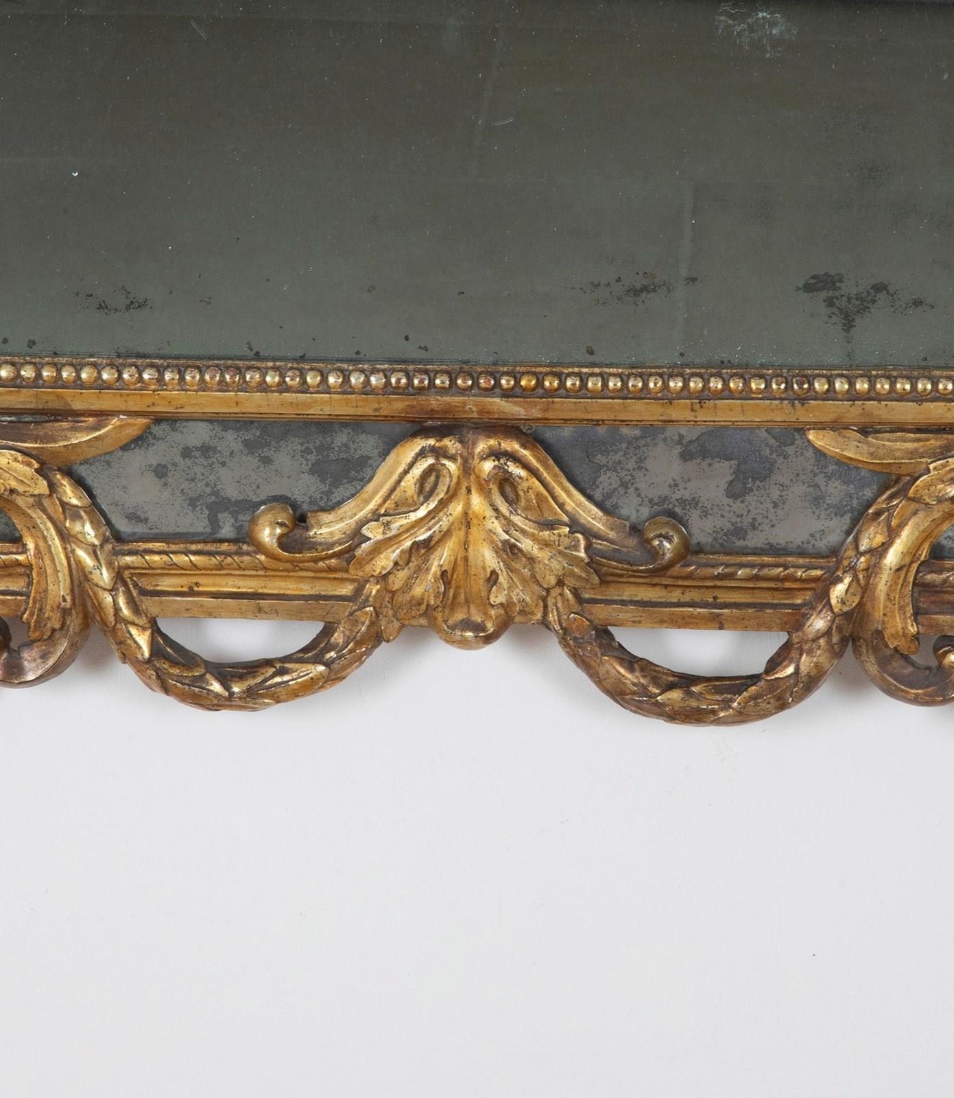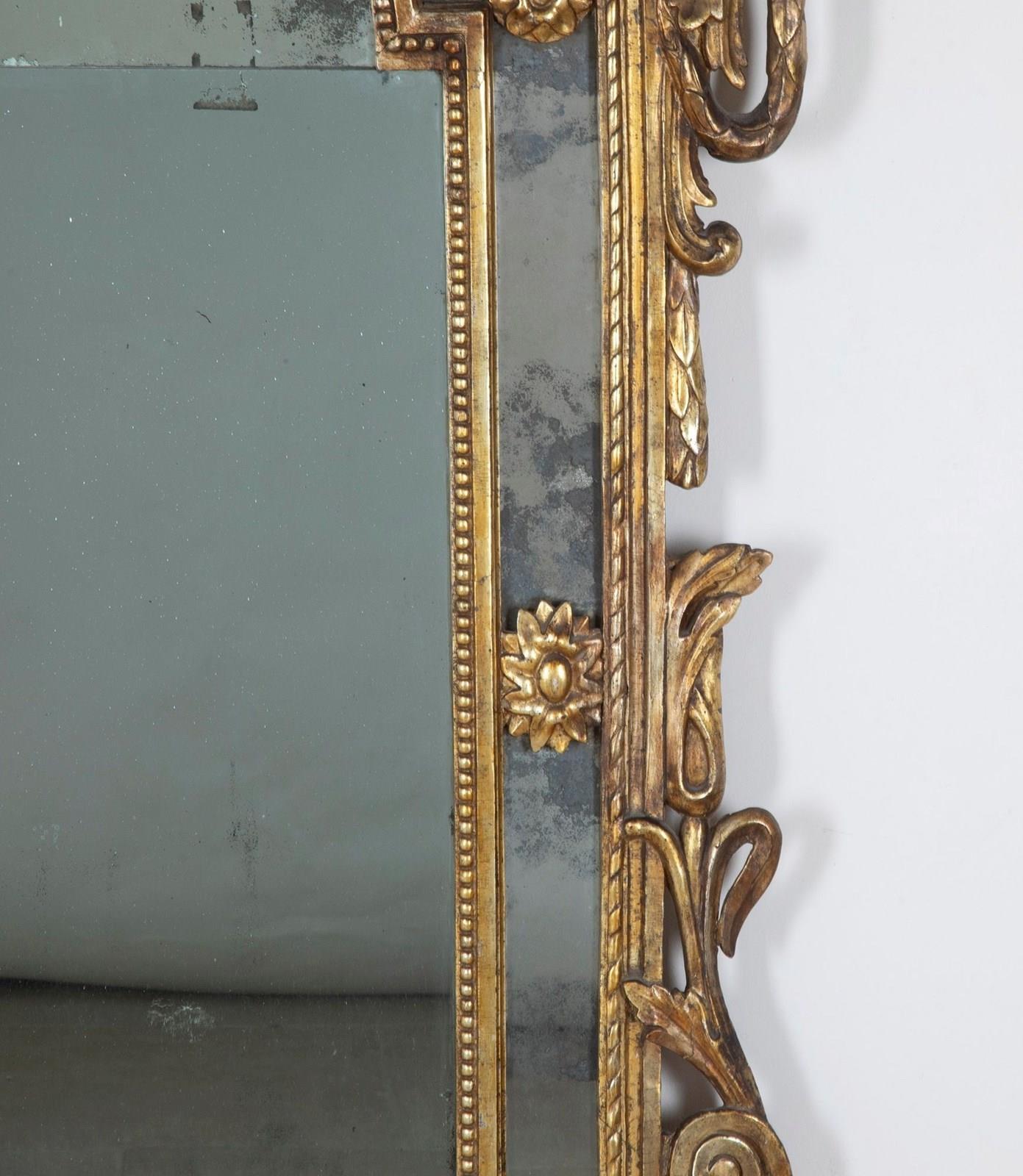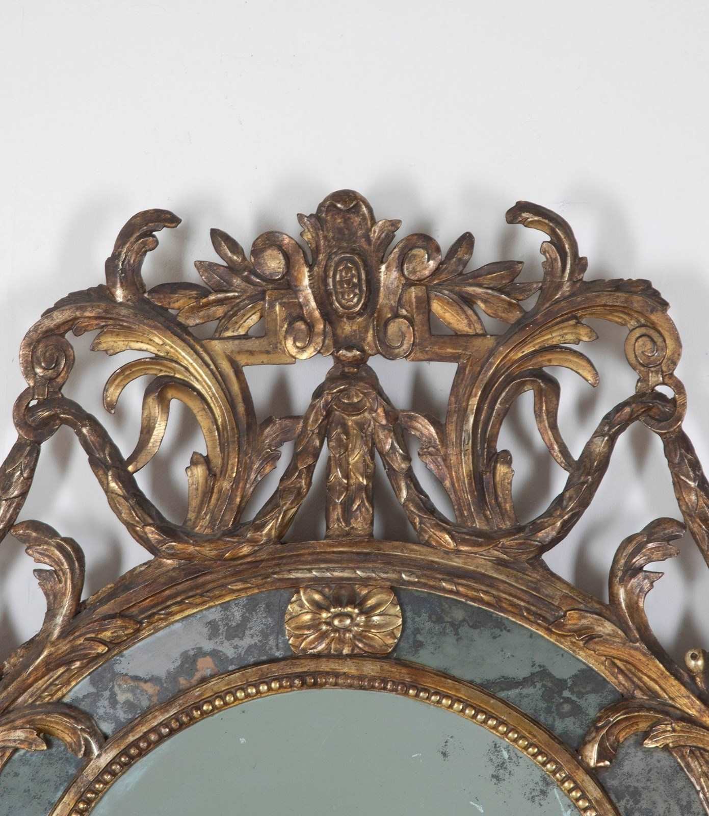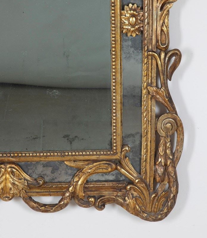 Of impressive scale, the arched divided plate within a finely carved giltwood frame richly ornamented with scrolling acanthus, rocailles and trailing foliage, surmounted by an openwork cresting centred by a stylised floral plume. The sides carved with flowerhead clasps and voluted scrolls, the lower edge with pierced rocaille cartouche motifs. The original gilt surface now with an attractive, softly burnished patina and areas of age-consistent wear. The mirror plates showing desirable atmospheric foxing to the outer slips and a clearer central plate, characteristic of period mercury silvering.