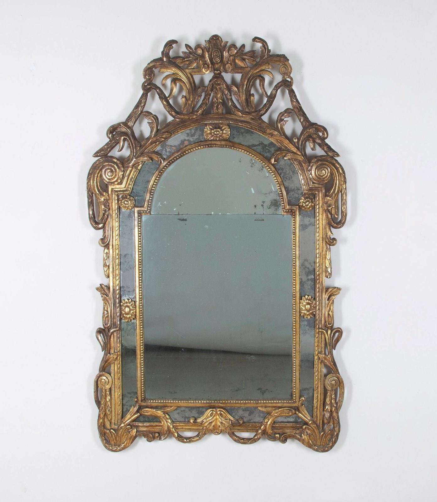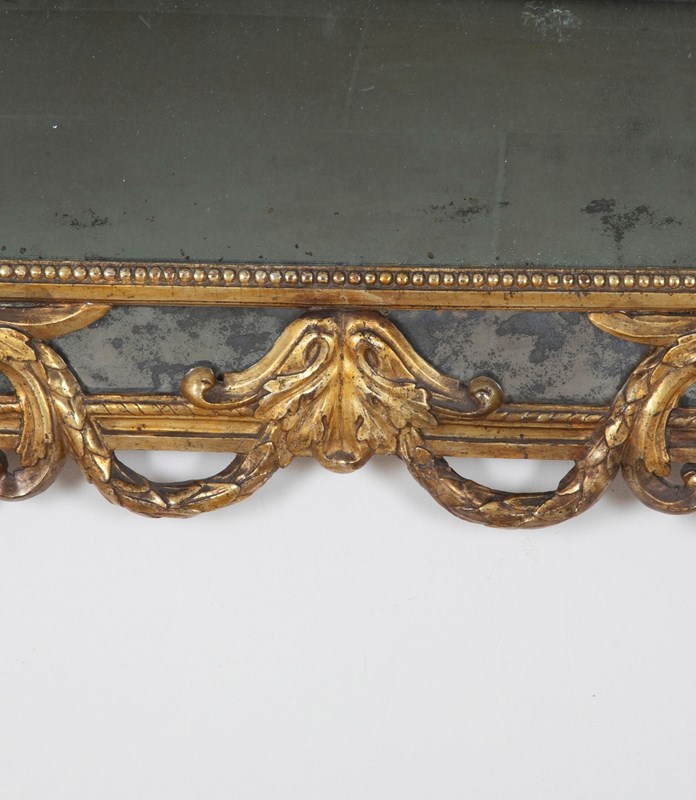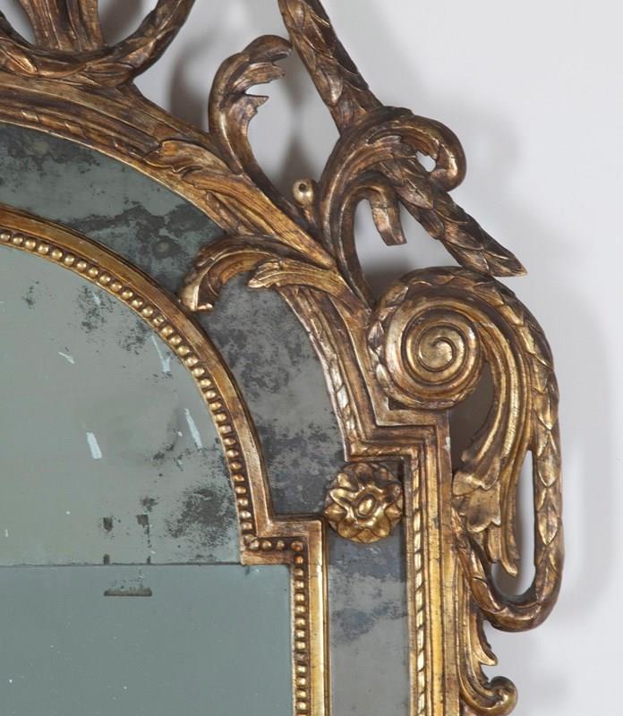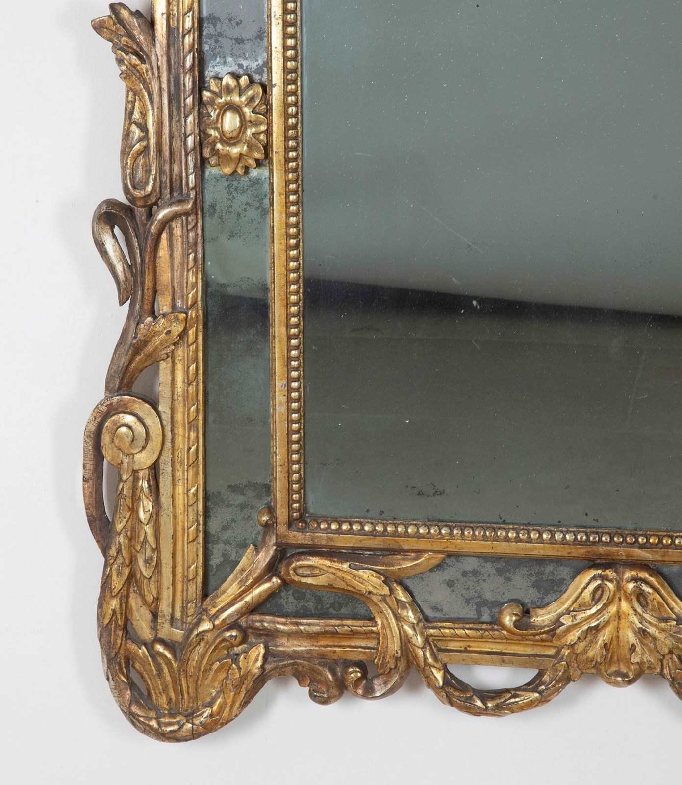 Of impressive scale, the arched divided plate within a finely carved giltwood frame richly ornamented with scrolling acanthus, rocailles and trailing foliage, surmounted by an openwork cresting centred by a stylised floral plume. The sides carved with flowerhead clasps and voluted scrolls, the lower edge with pierced rocaille cartouche motifs. The original gilt surface now with an attractive, softly burnished patina and areas of age-consistent wear. The mirror plates showing desirable atmospheric foxing to the outer slips and a clearer central plate, characteristic of period mercury silvering.