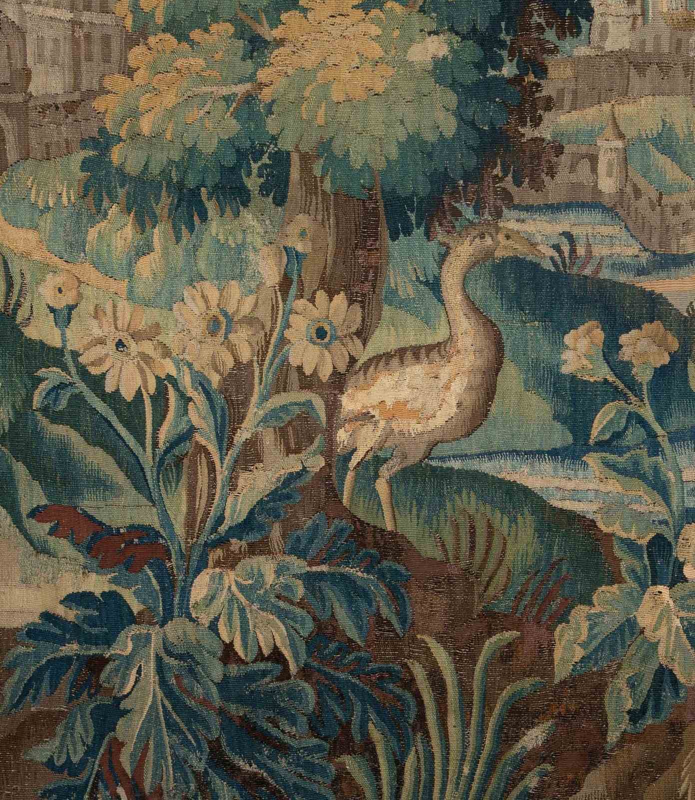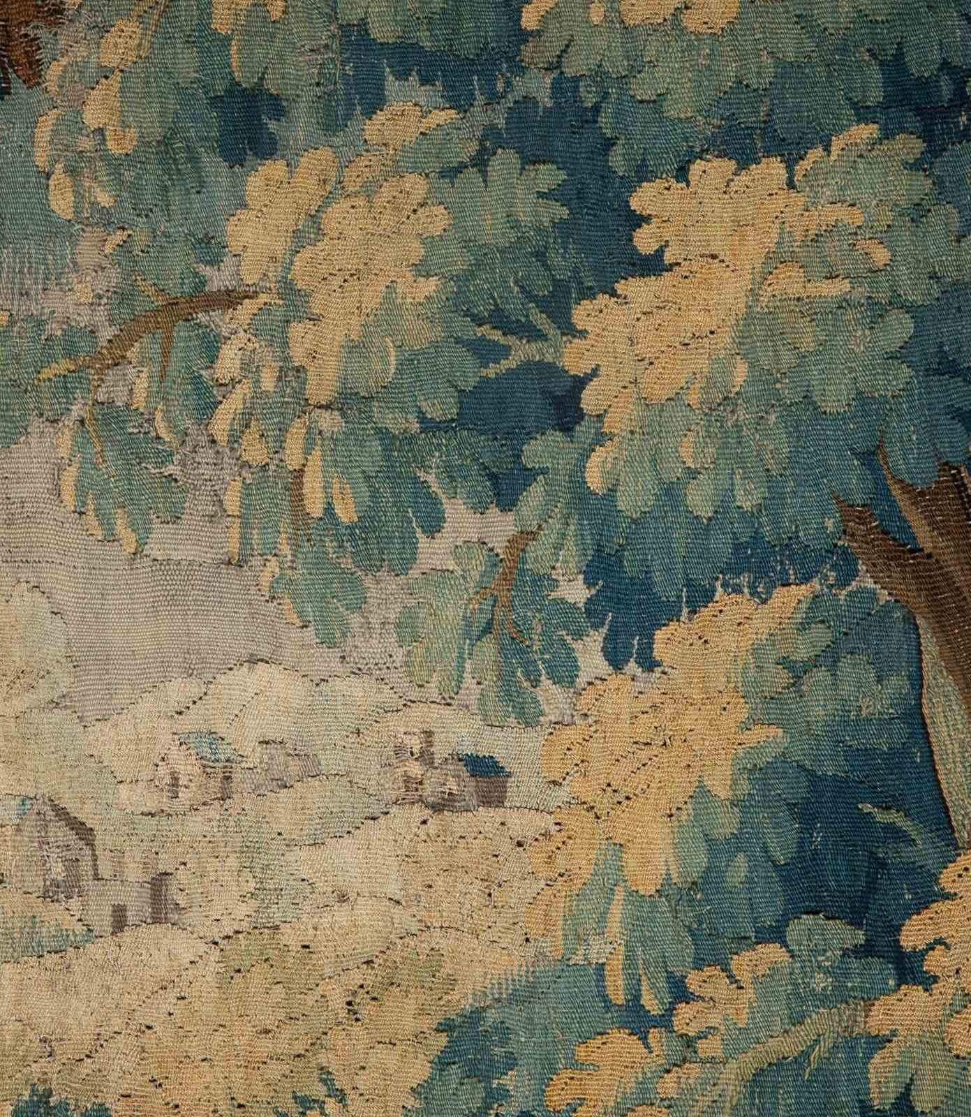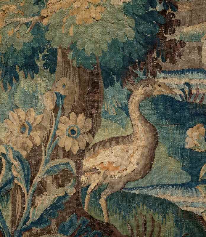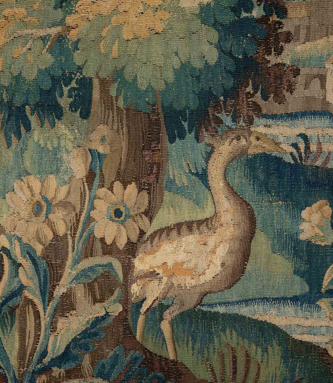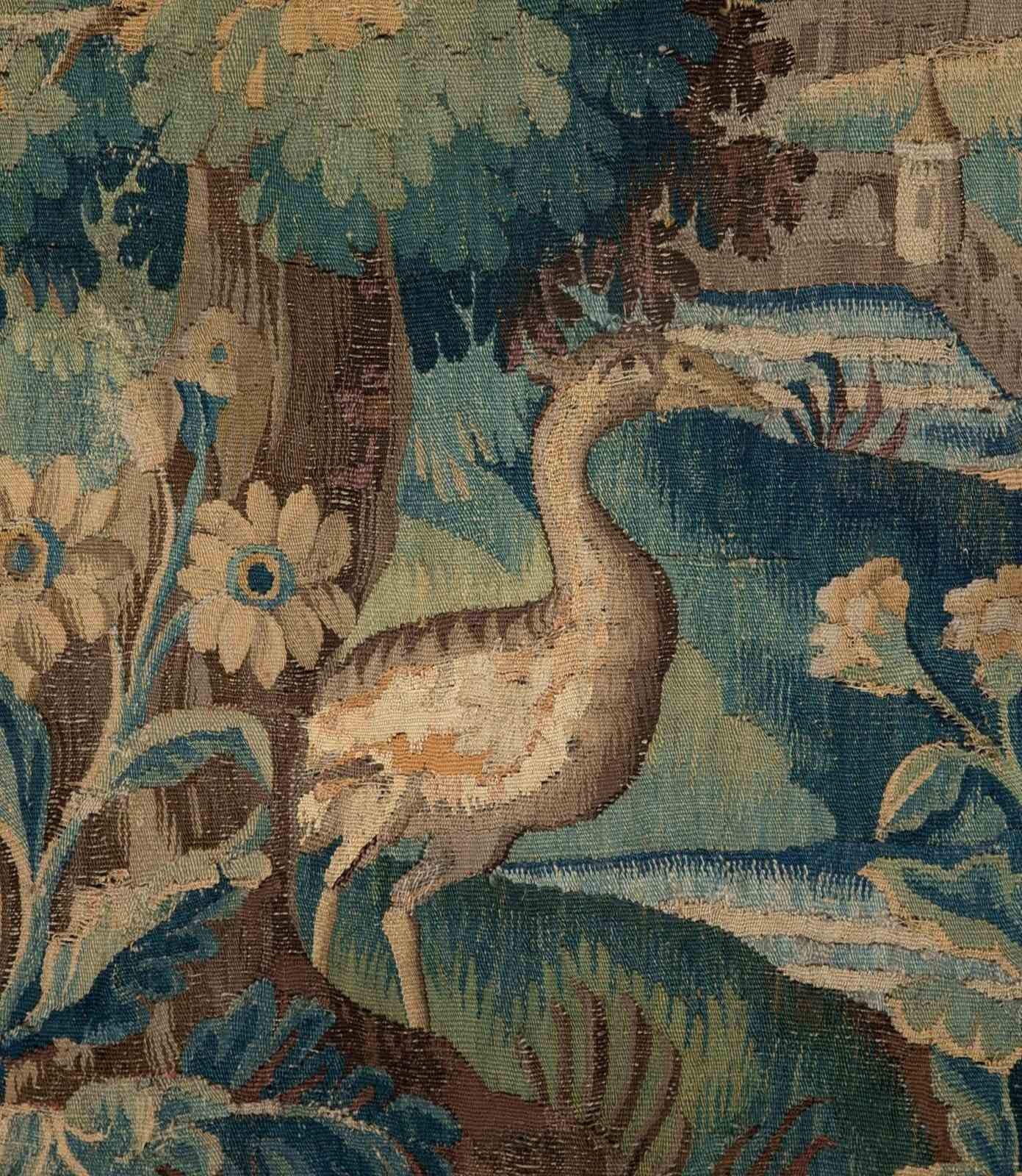 Executed in finely spun wool and silk, the tapestry has retained an attractive palette that emphasises the interplay of greens and earth tones, with subtle highlights that attest to the weaver’s mastery of tone and texture. Verdure tapestries were highly valued throughout the 17th and 18th centuries for their decorative presence in grand interiors, serving both as insulation and as a statement of taste and sophistication in noble and aristocratic homes.