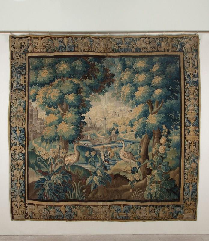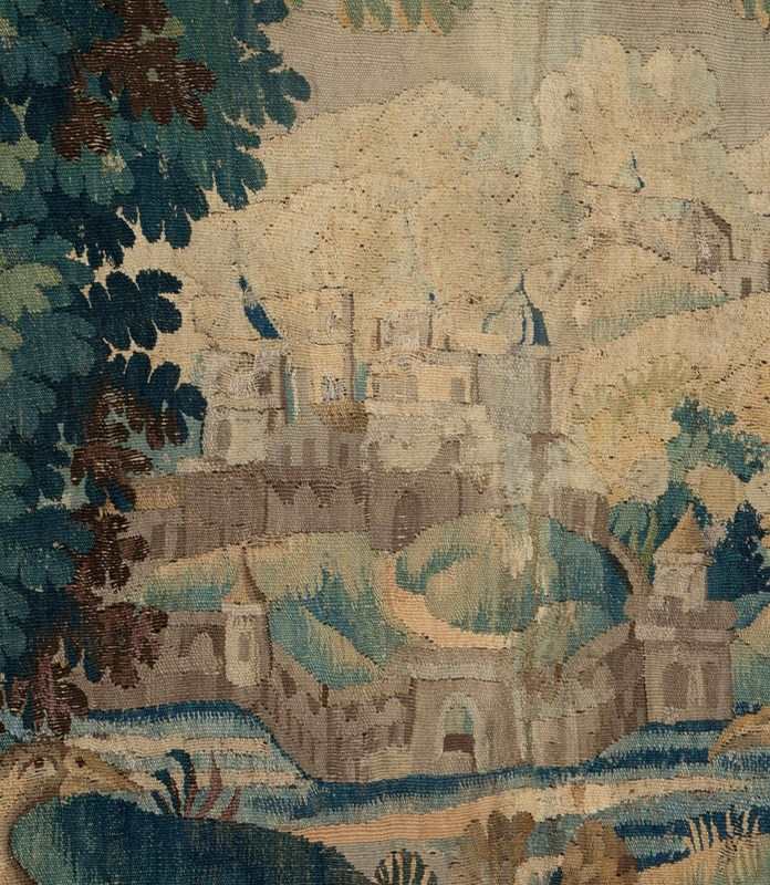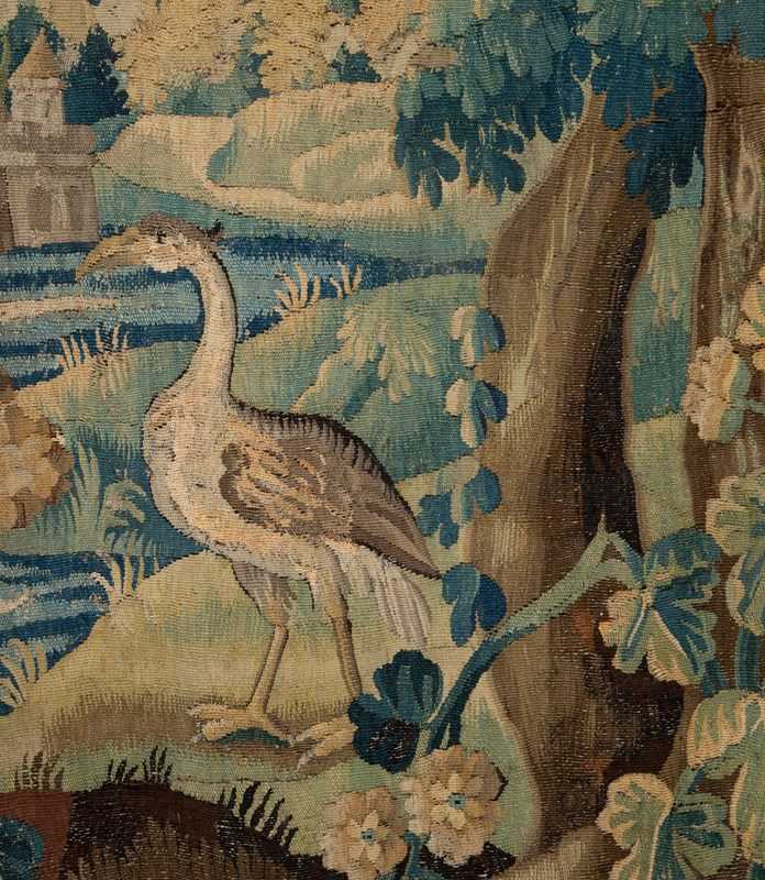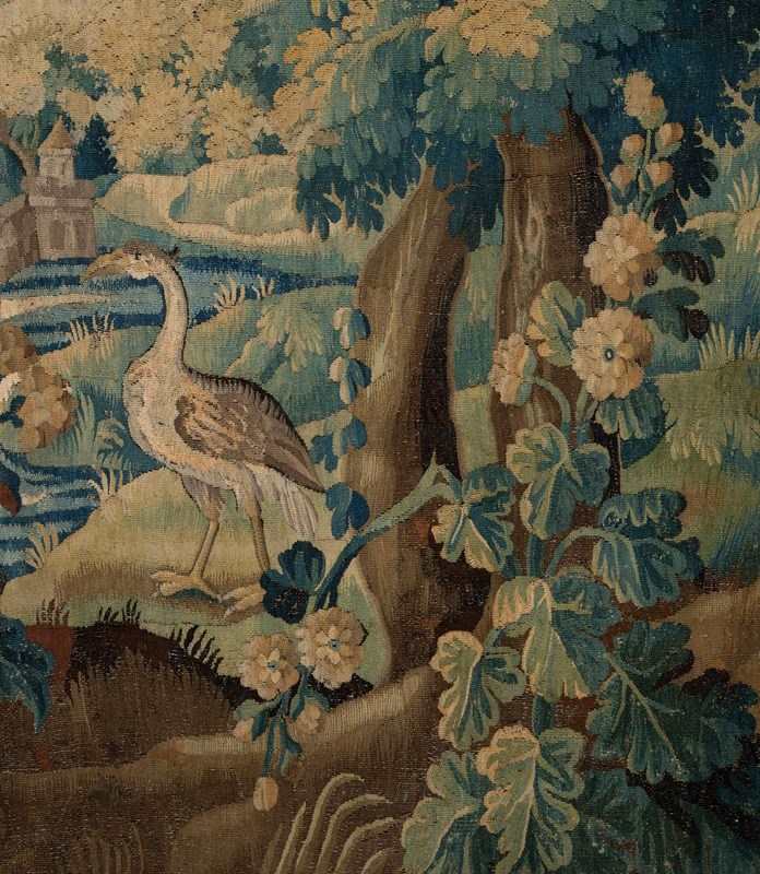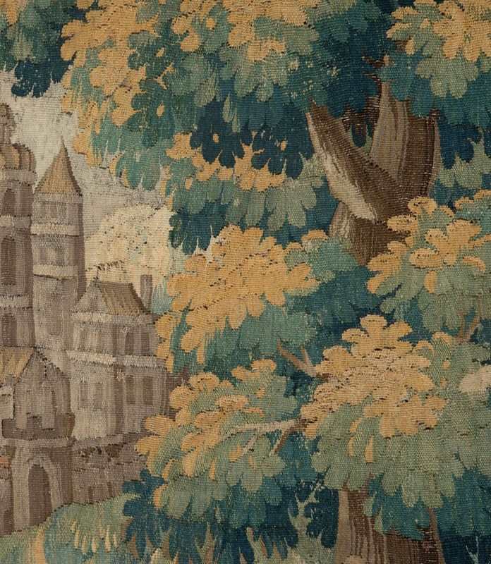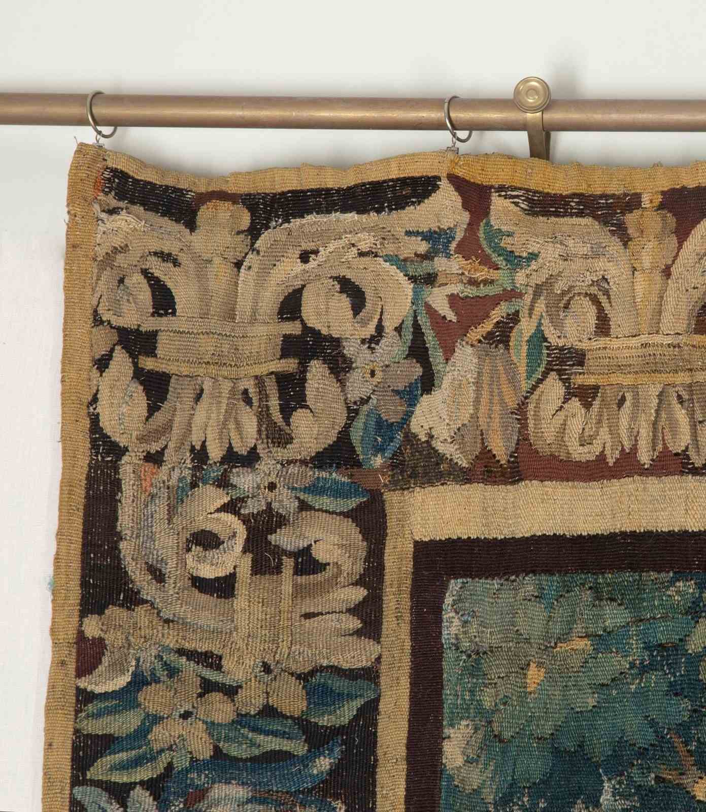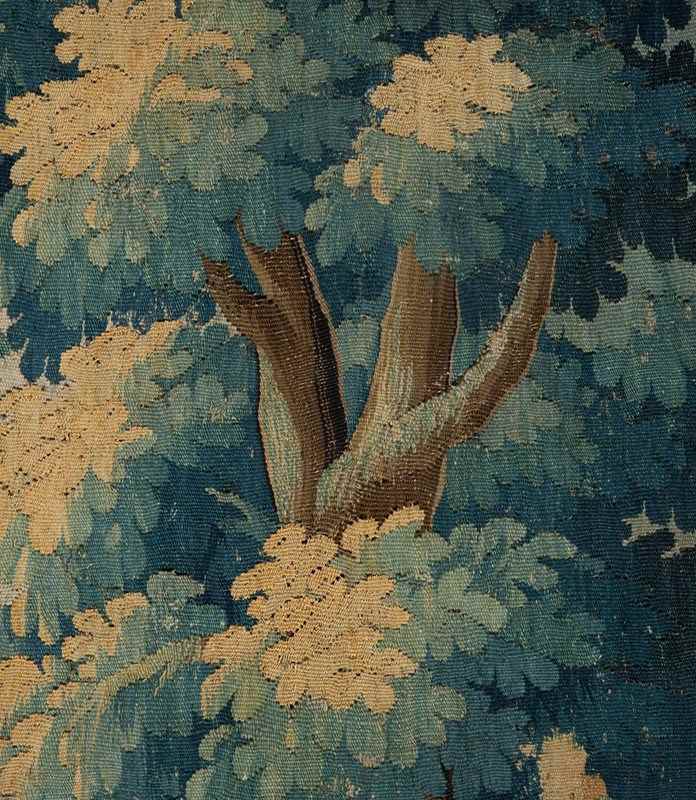 Executed in finely spun wool and silk, the tapestry has retained an attractive palette that emphasises the interplay of greens and earth tones, with subtle highlights that attest to the weaver’s mastery of tone and texture. Verdure tapestries were highly valued throughout the 17th and 18th centuries for their decorative presence in grand interiors, serving both as insulation and as a statement of taste and sophistication in noble and aristocratic homes.