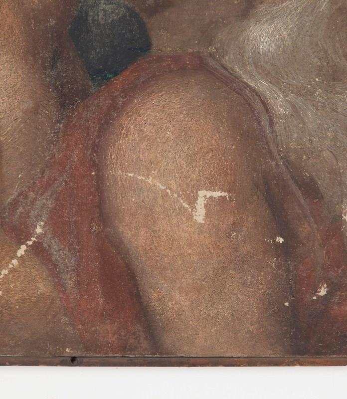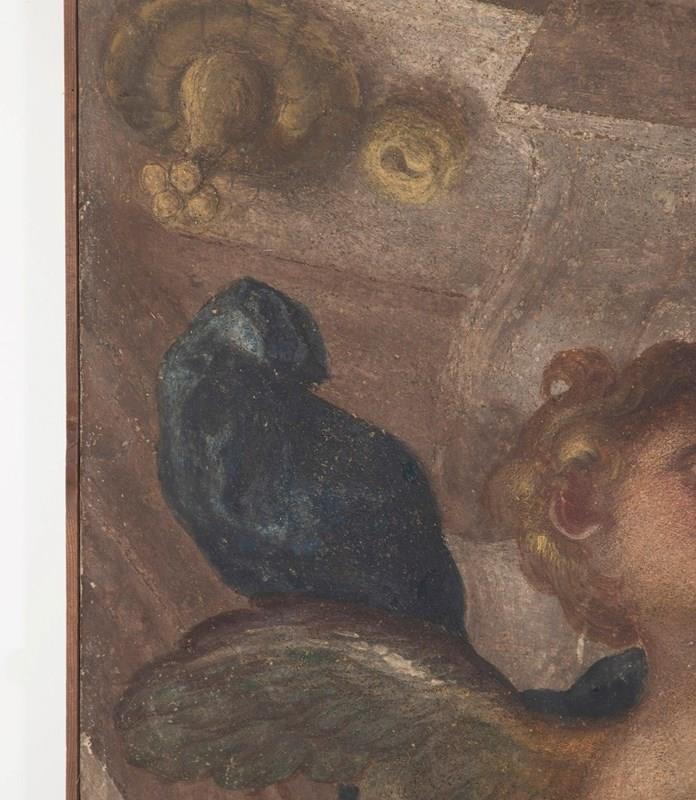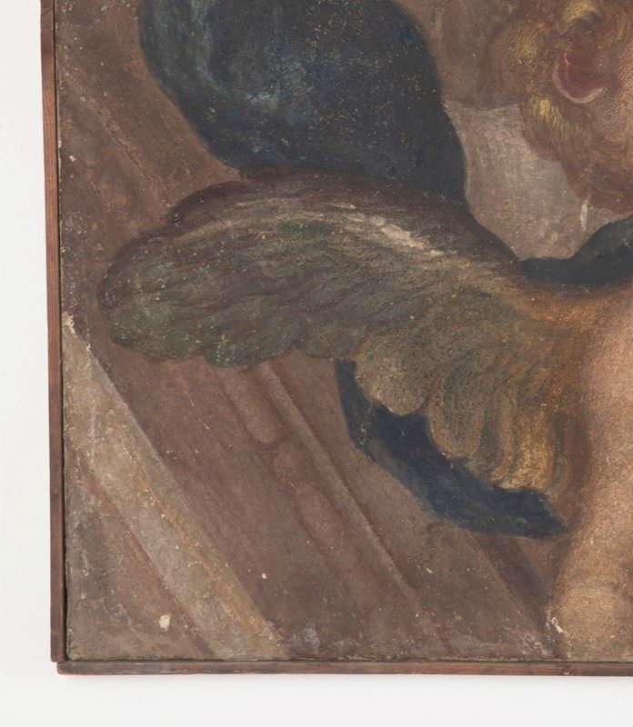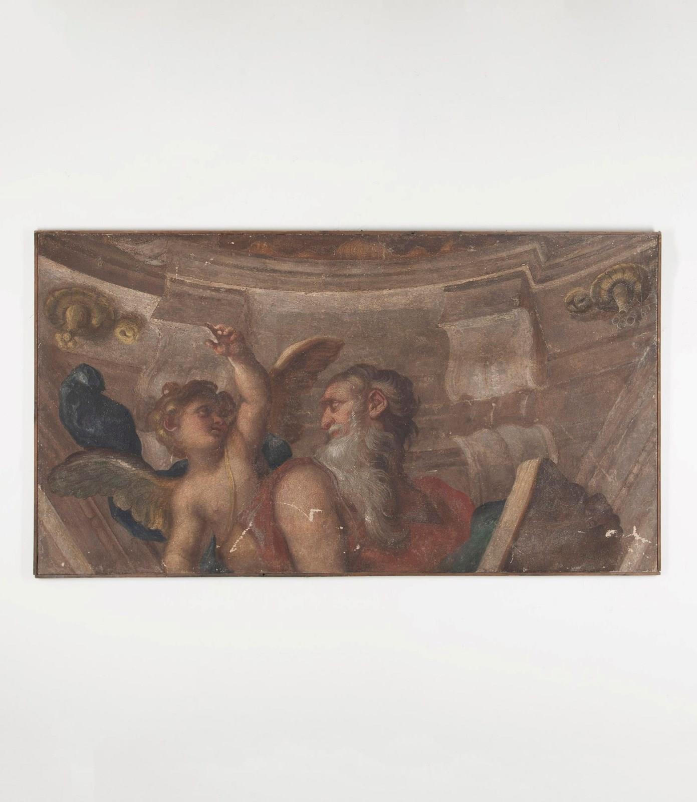 Depicting a prophet accompanied by an Amorino. Piola was the leading figure of the Genoese Baroque, heading the prolific Casa Piola, whose fresco cycles decorated the grand palazzi and churches of Liguria. Works attributable to the master or his circle remain highly sought after for their rich colour, expressive modelling, and connection to Genoa’s most important artistic dynasty. This fragment retains the hallmarks of Piola’s style: warm terracotta and honeyed tones, supple drapery, sensitively rendered flesh, and the gentle theatricality typical of Genoese Baroque frescoes. The subject — a contemplative prophetic figure led or enlightened by a winged Amorino — suggests its original placement within an allegorical or devotional cycle, likely part of a vaulted ceiling or overdoor ensemble. Fresco fragments of this size and quality occupy a strong niche within the market for Italian Baroque decoration.
