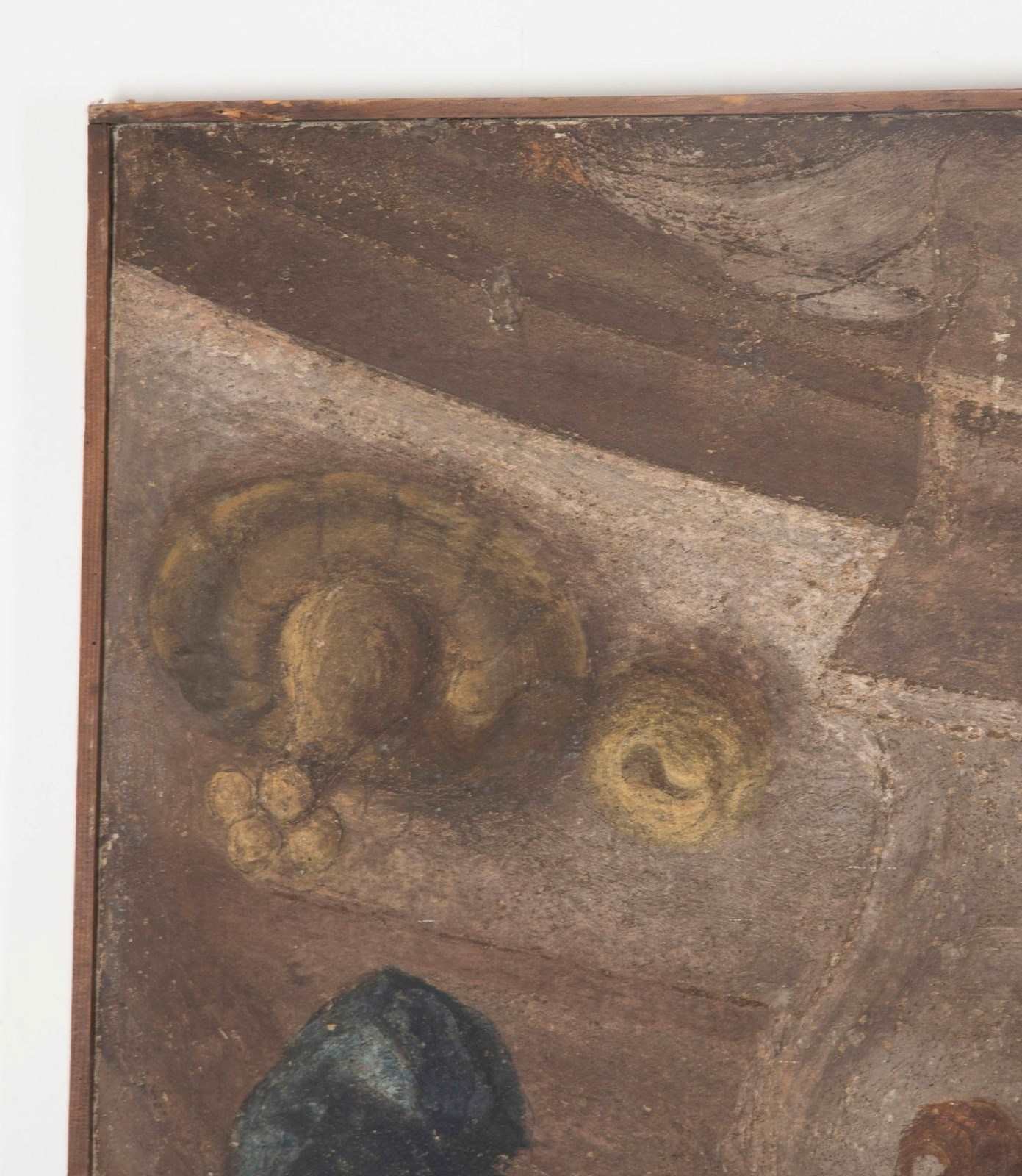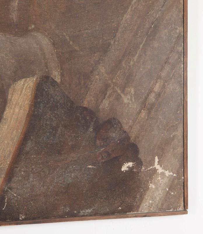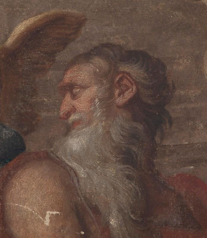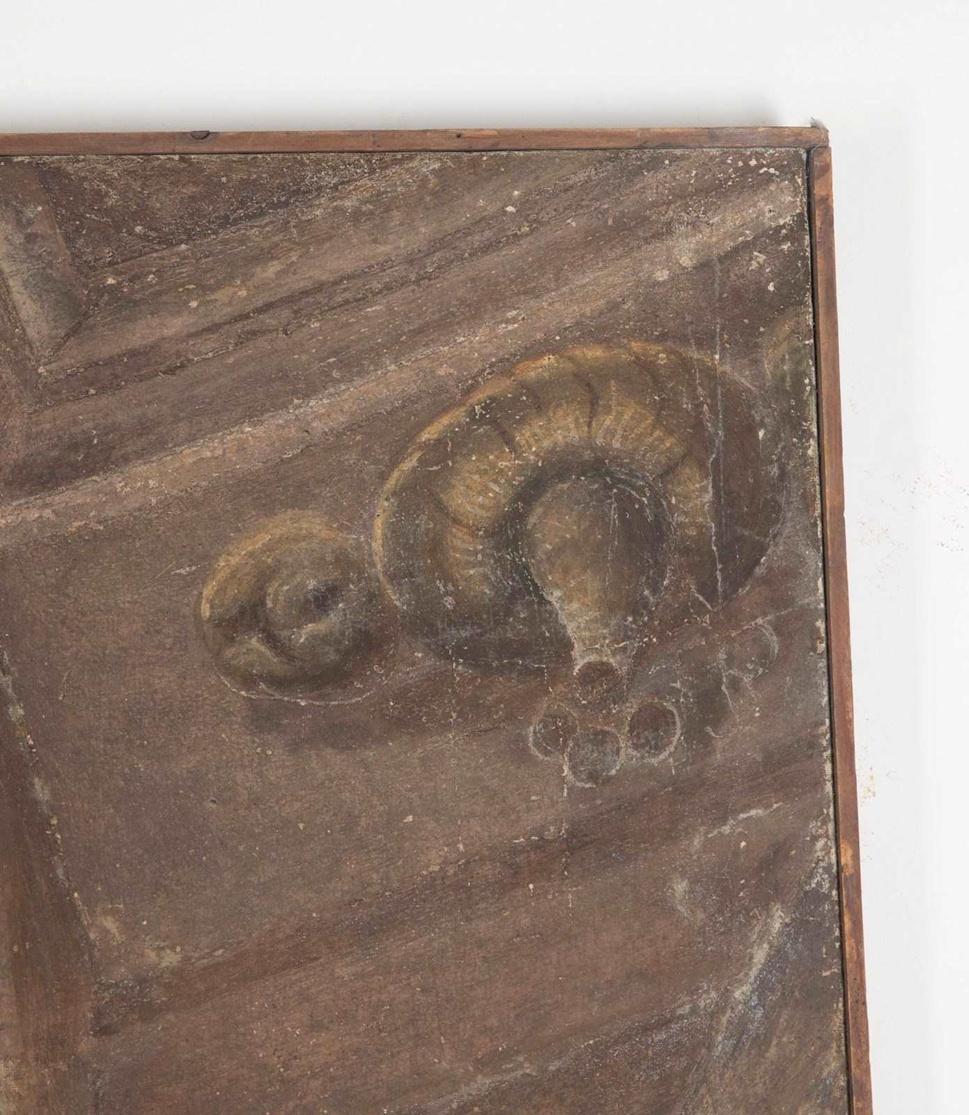 Depicting a prophet accompanied by an Amorino. Piola was the leading figure of the Genoese Baroque, heading the prolific Casa Piola, whose fresco cycles decorated the grand palazzi and churches of Liguria. Works attributable to the master or his circle remain highly sought after for their rich colour, expressive modelling, and connection to Genoa’s most important artistic dynasty. This fragment retains the hallmarks of Piola’s style: warm terracotta and honeyed tones, supple drapery, sensitively rendered flesh, and the gentle theatricality typical of Genoese Baroque frescoes. The subject — a contemplative prophetic figure led or enlightened by a winged Amorino — suggests its original placement within an allegorical or devotional cycle, likely part of a vaulted ceiling or overdoor ensemble. Fresco fragments of this size and quality occupy a strong niche within the market for Italian Baroque decoration.