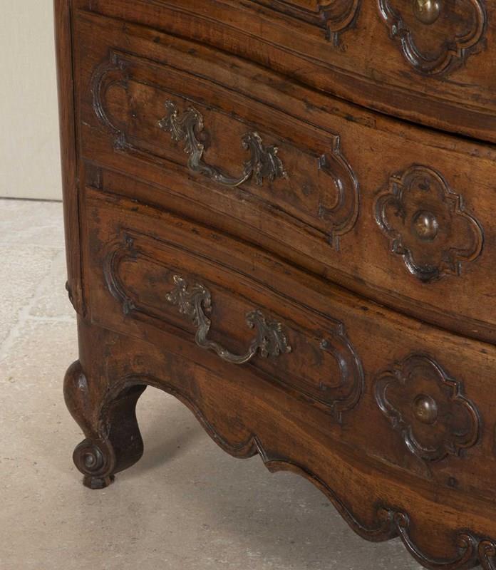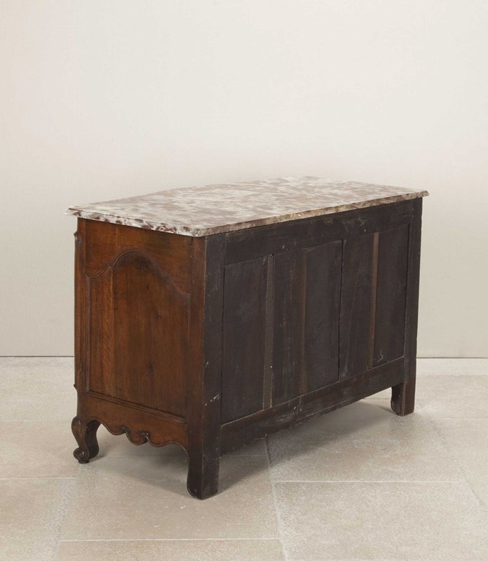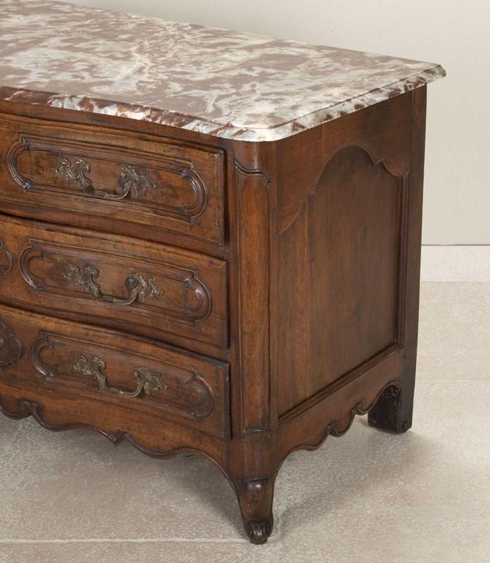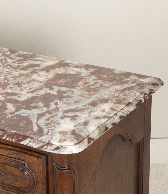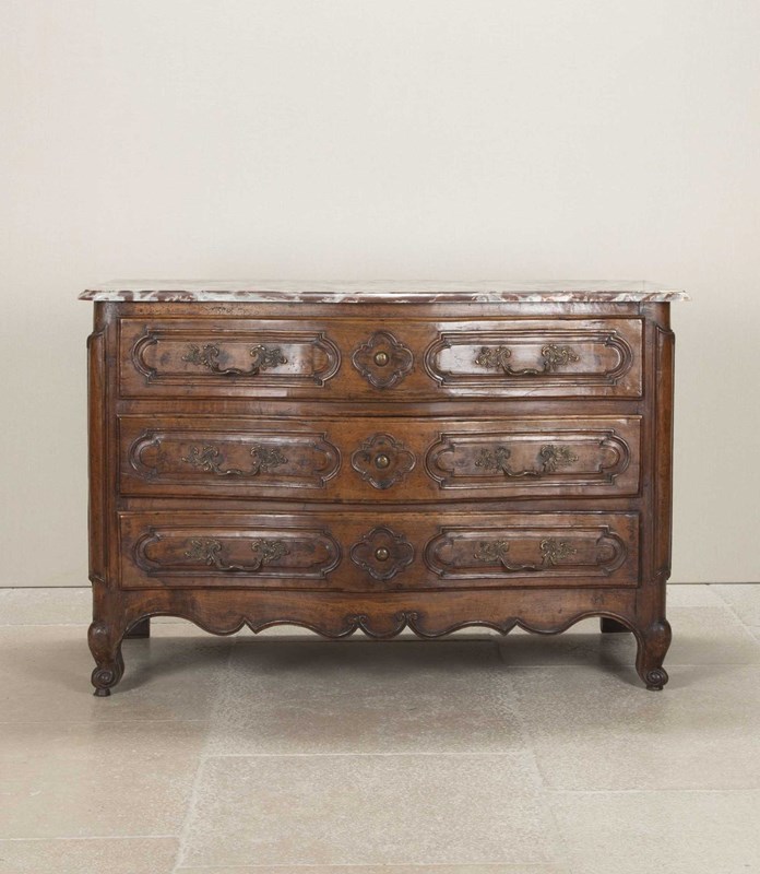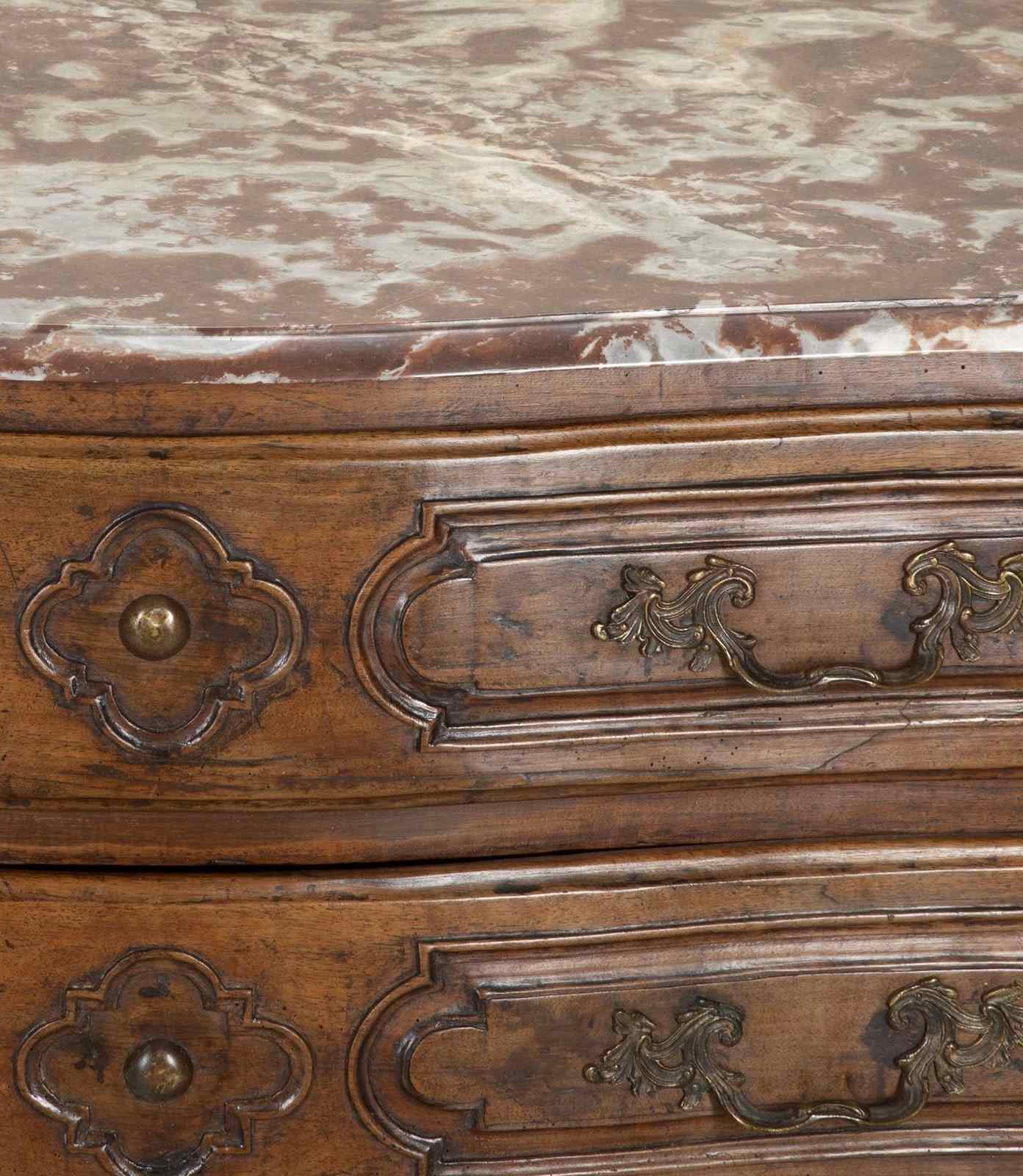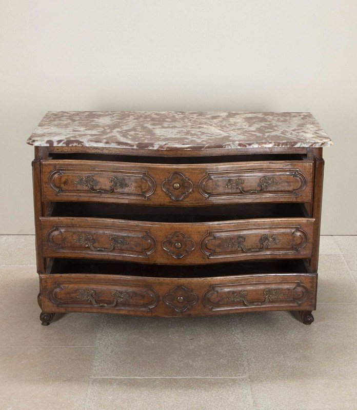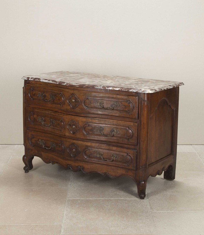Late 18th Century Serpentine commode from the Rhône Valley, France. Three long drawers retain their original hardware. The rouge marble top is a later, 19th Century, replacement. Drawer linings and backs are replaced.