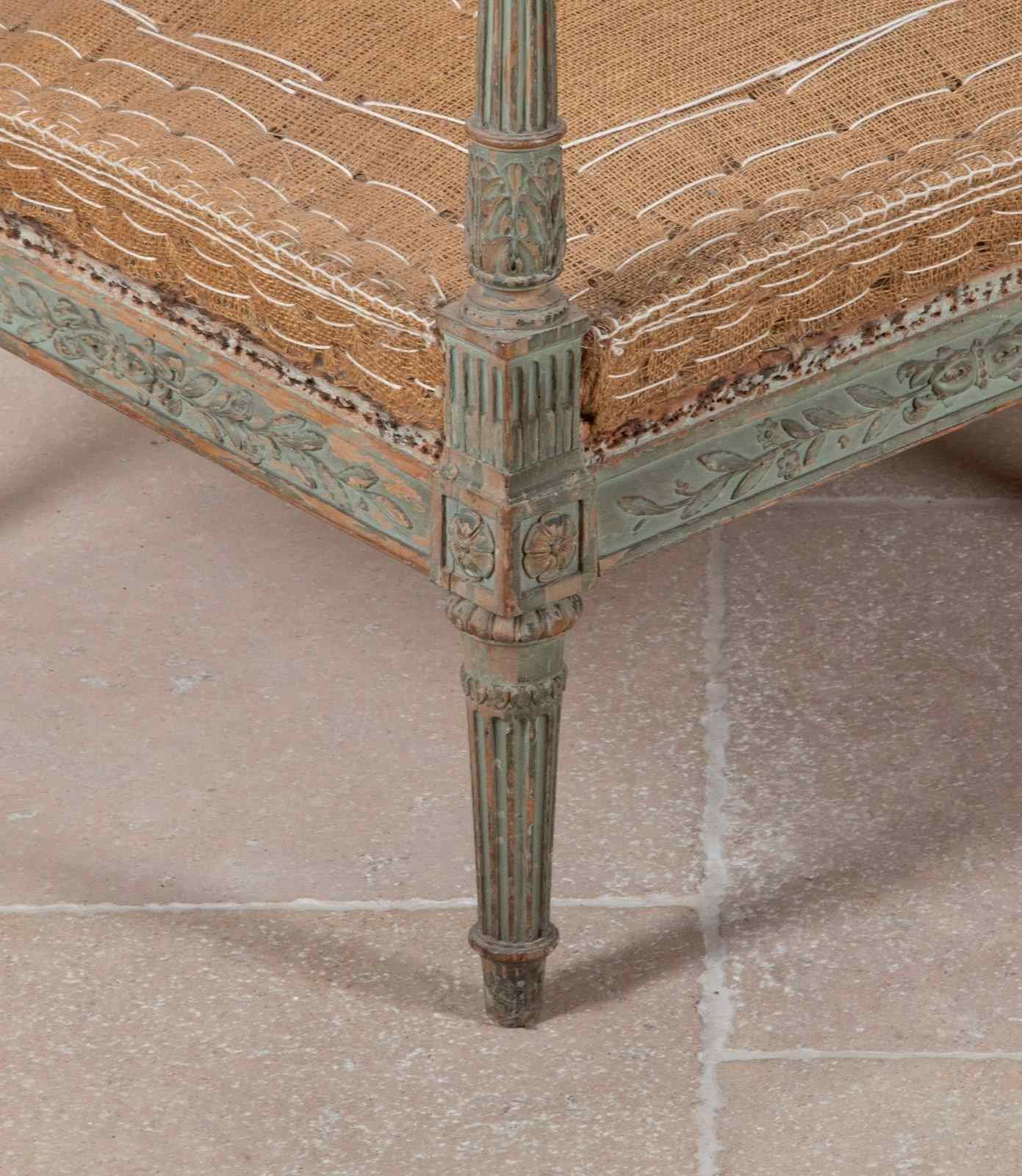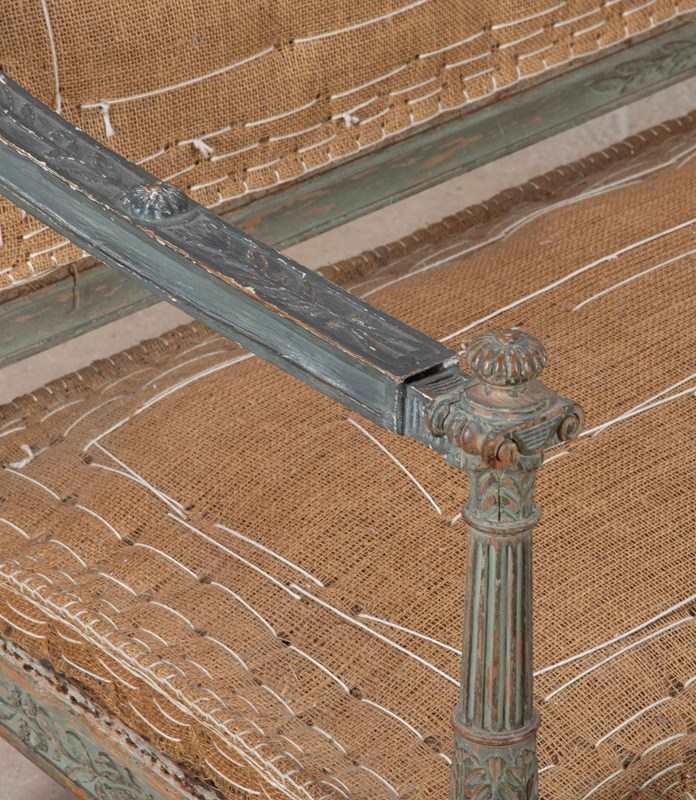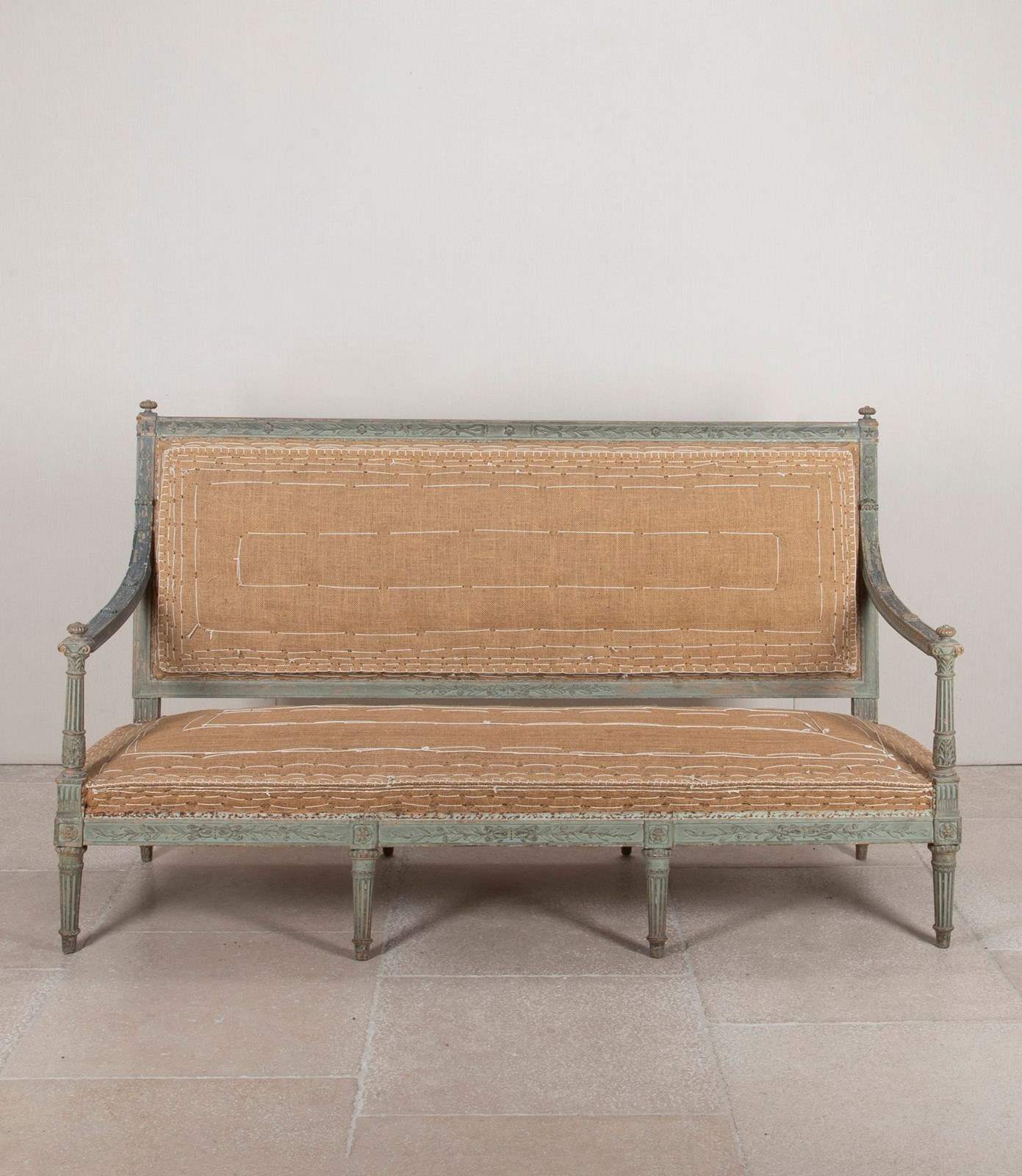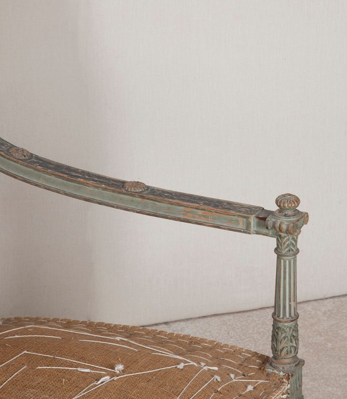 With a beautifully proportioned back and swept arms, finely carved throughout with fluting and classical detail. The frame retains a soft, timeworn painted finish with attractive patina, raised on turned and reeded legs. Circa 1790.