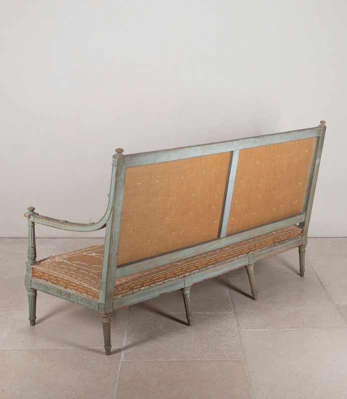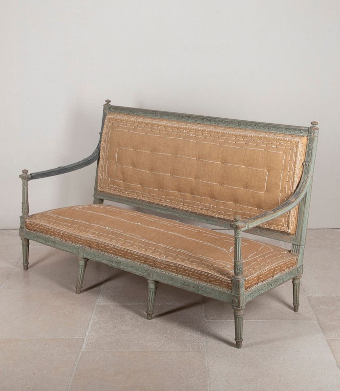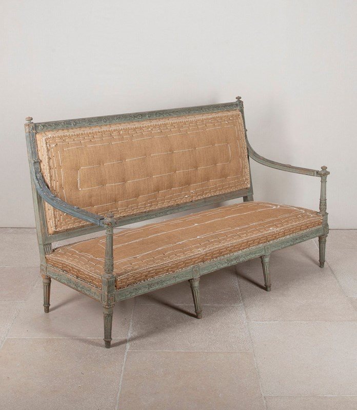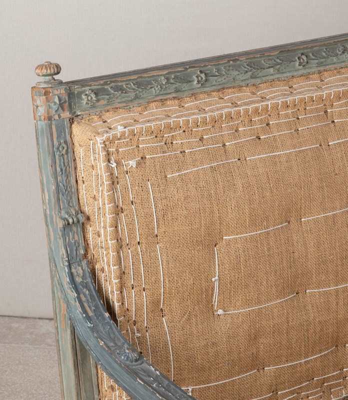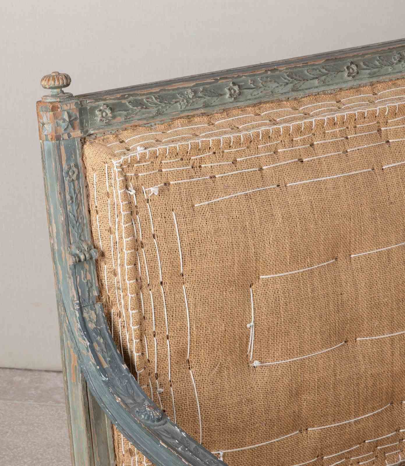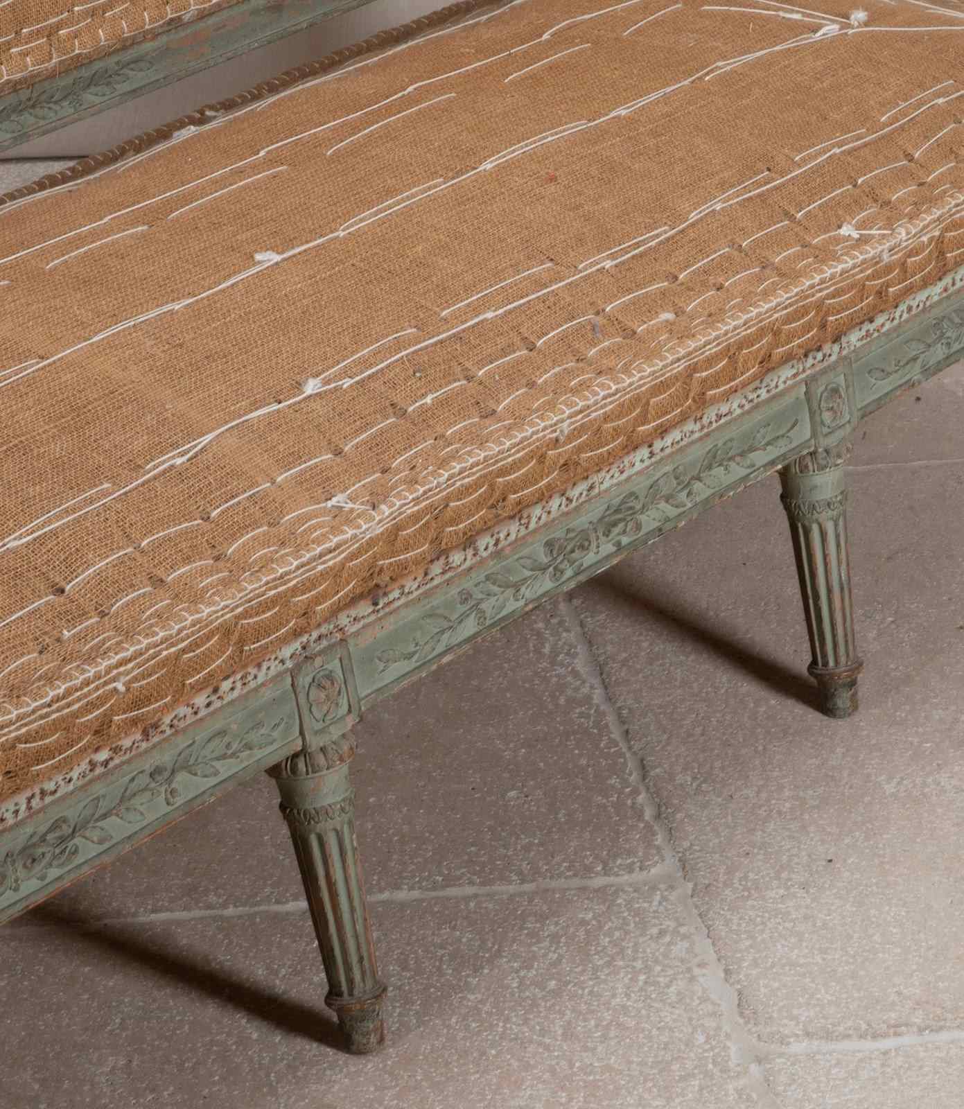 With a beautifully proportioned back and swept arms, finely carved throughout with fluting and classical detail. The frame retains a soft, timeworn painted finish with attractive patina, raised on turned and reeded legs. Circa 1790.