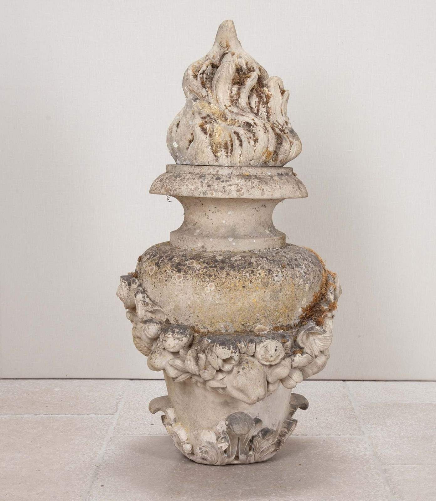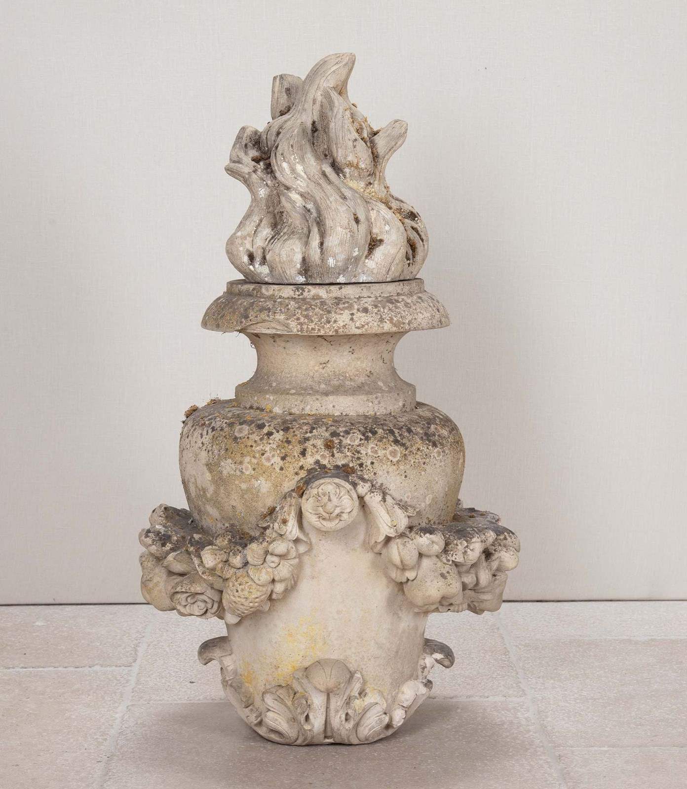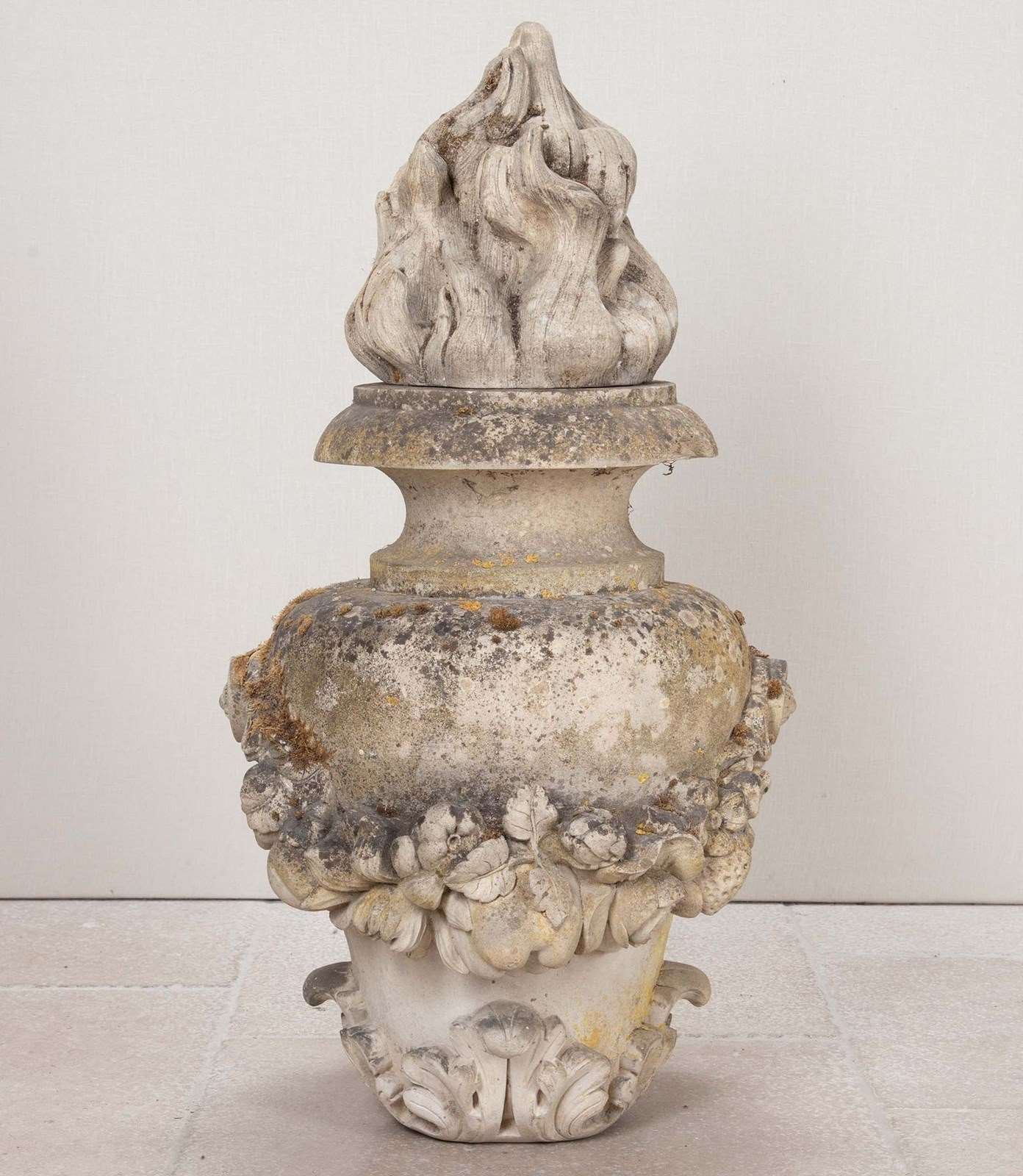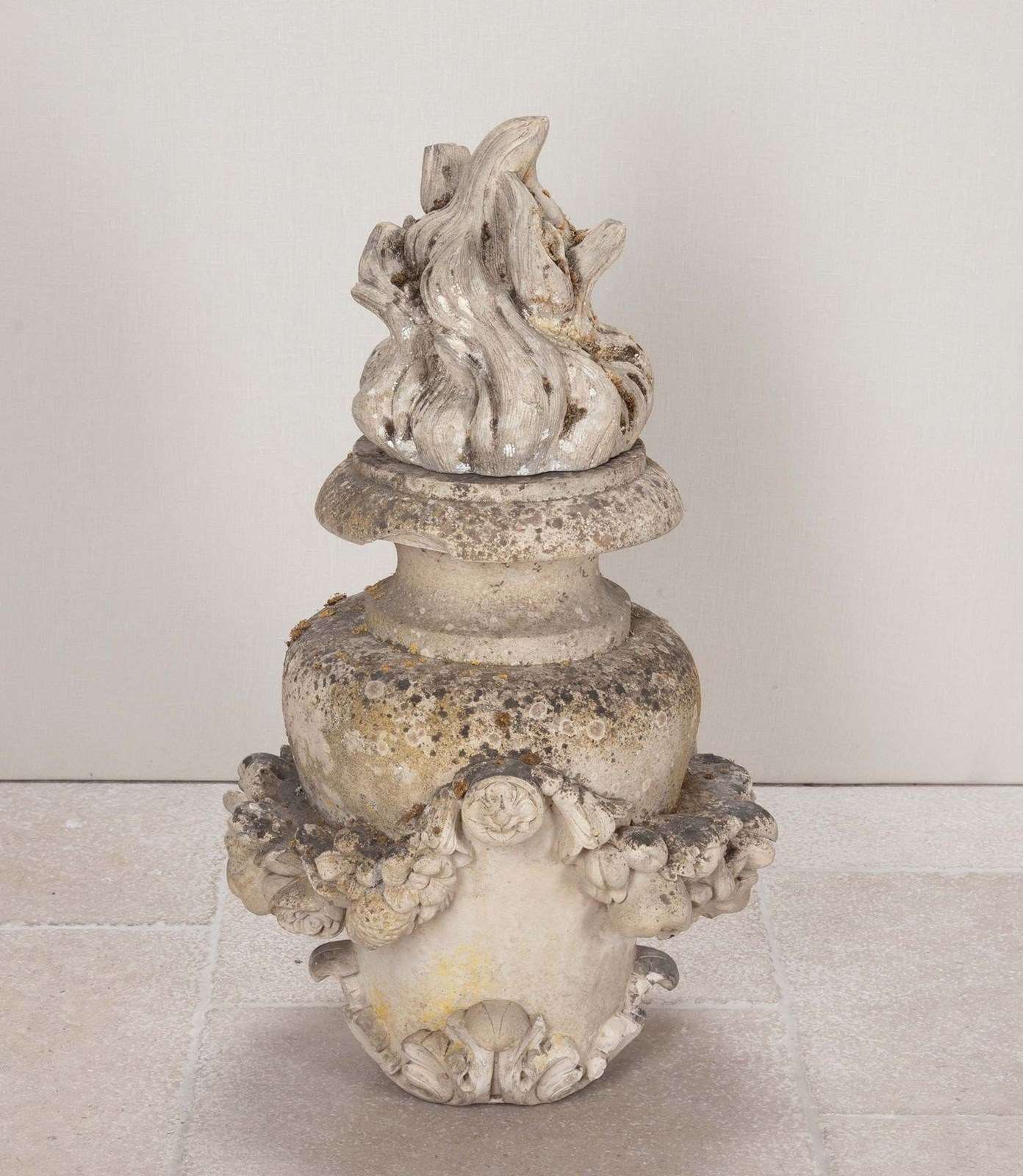 A late 18th Century French terracotta finial in two parts. The base a Neo-Classical urn adorned with garlands supporting a top section of flames.Minor losses commensurate with age.