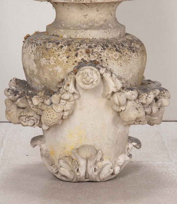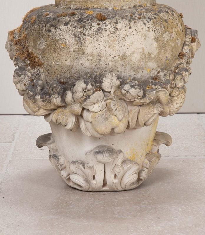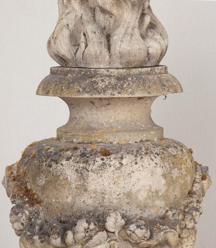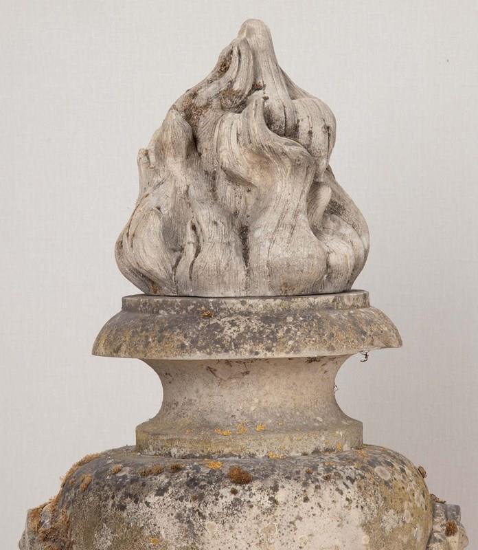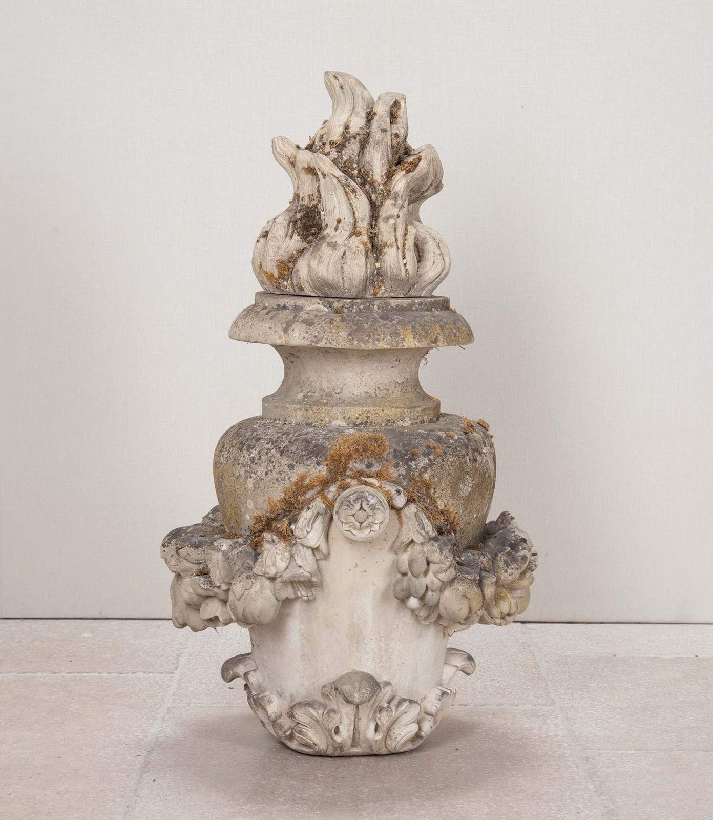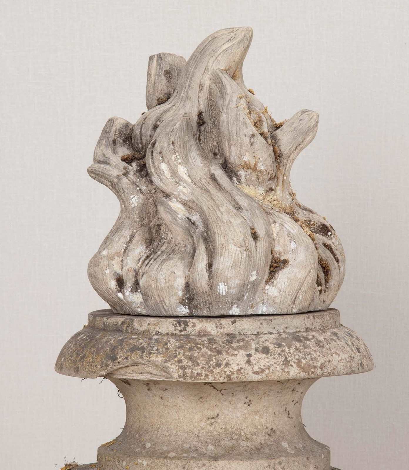 A late 18th Century French terracotta finial in two parts. The base a Neo-Classical urn adorned with garlands supporting a top section of flames.Minor losses commensurate with age.