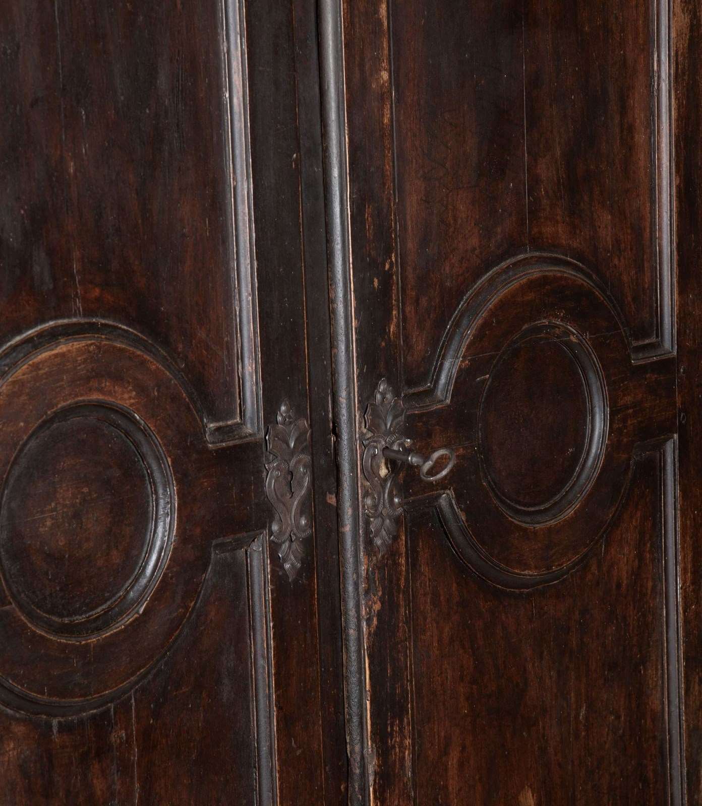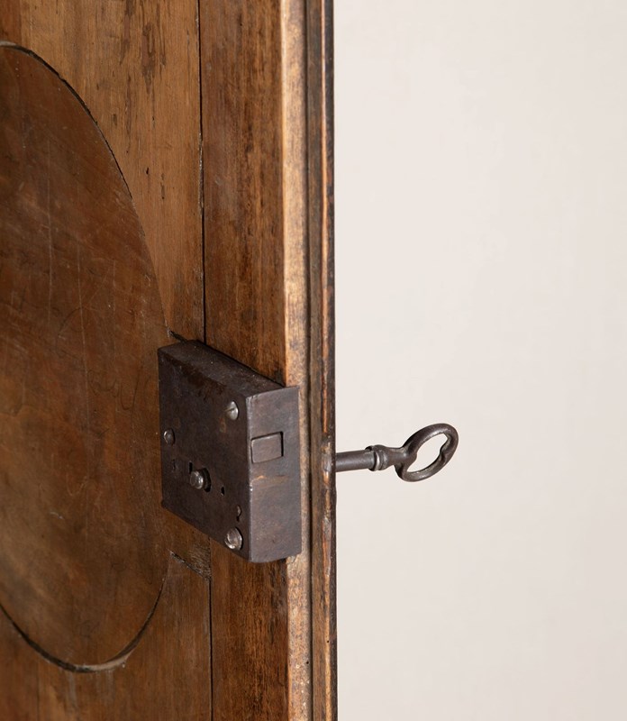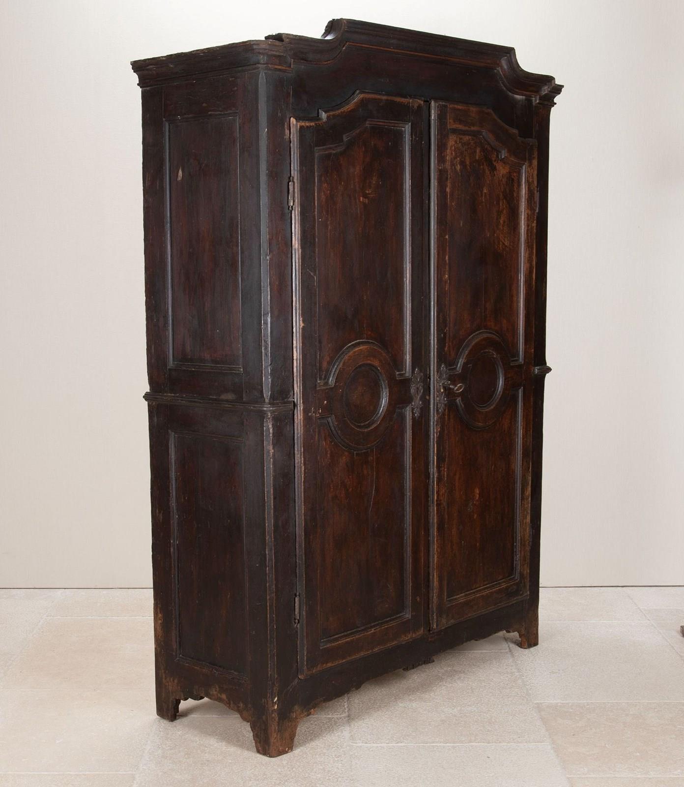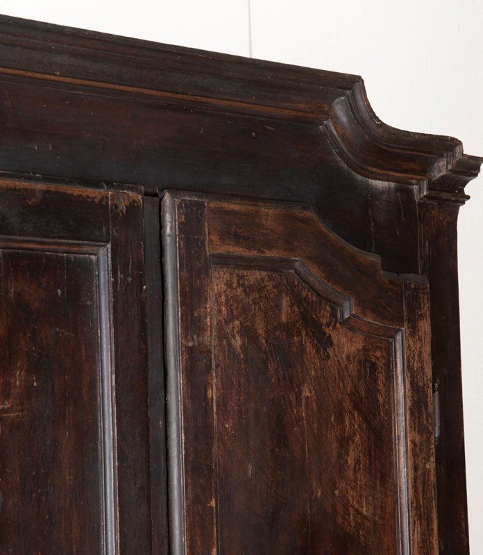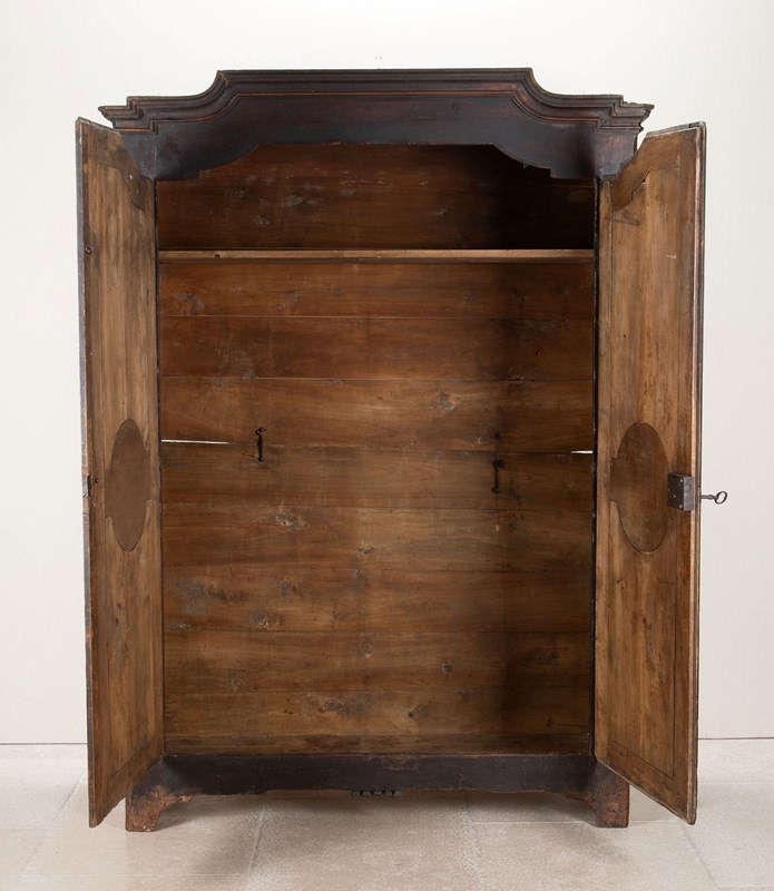 A late 18th Century Italian armoire in original paint. The moulded shaped cornice with raised centre above twin panelled doors centred by a roundel enclosing an interior with a high level shelf, the doors flanked by a moulded band at mid height which continues along the return sides, with a scroll ended apron below, the whole supported on block feet.