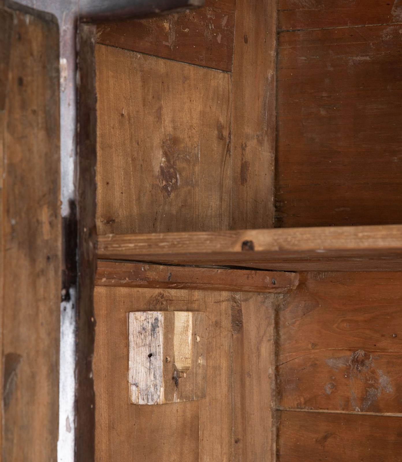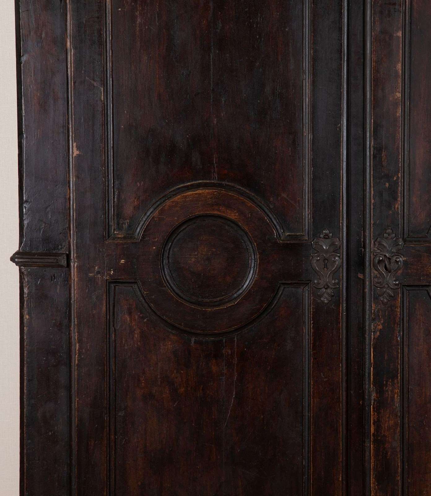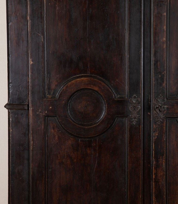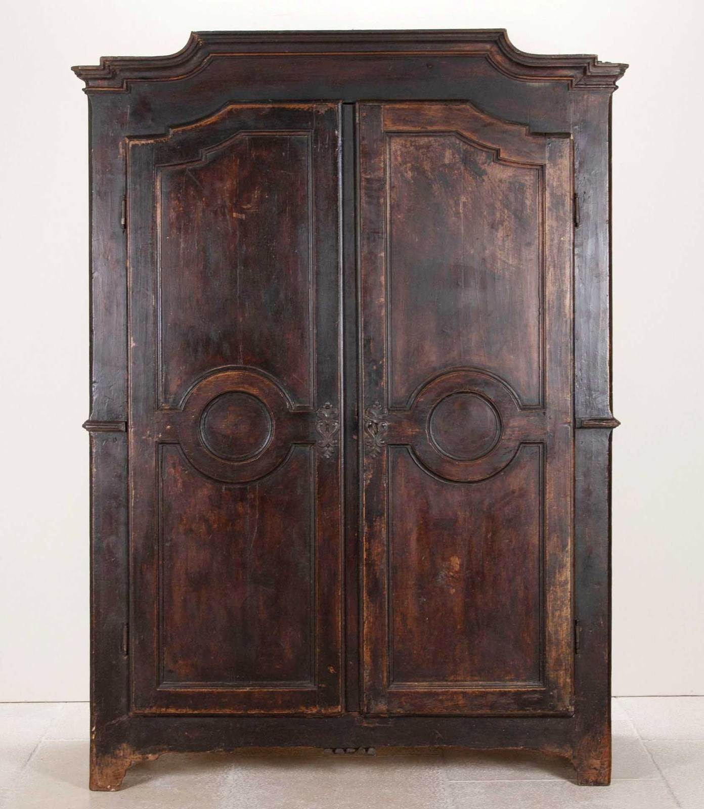A late 18th Century Italian armoire in original paint. The moulded shaped cornice with raised centre above twin panelled doors centred by a roundel enclosing an interior with a high level shelf, the doors flanked by a moulded band at mid height which continues along the return sides, with a scroll ended apron below, the whole supported on block feet.
