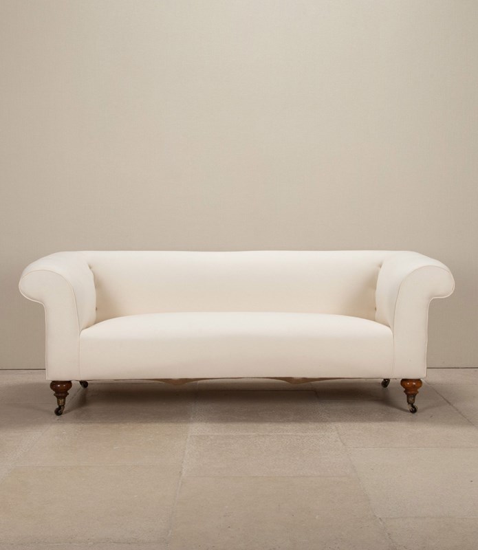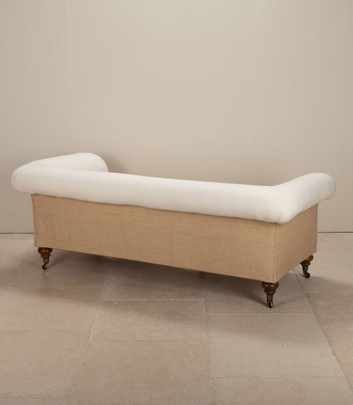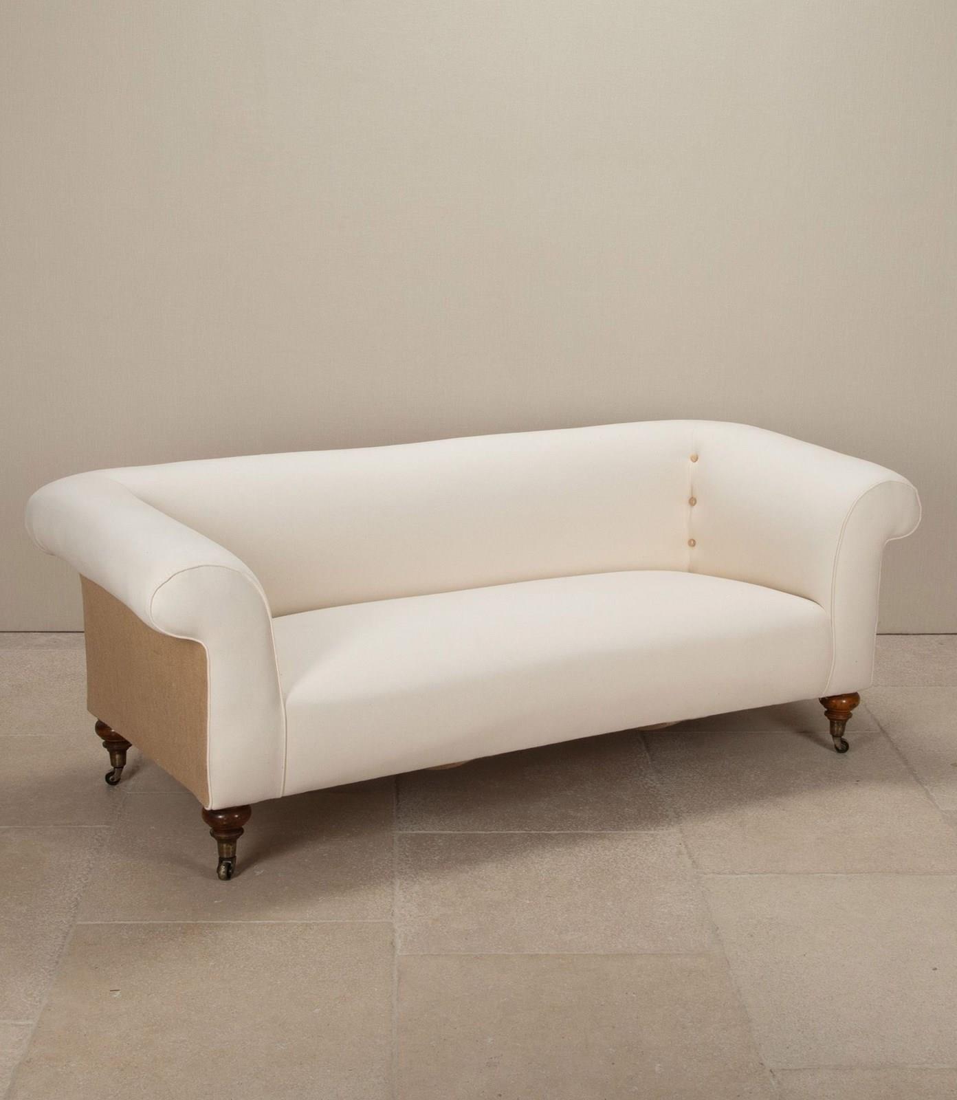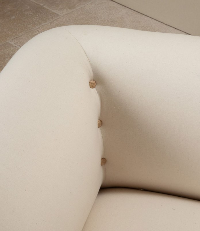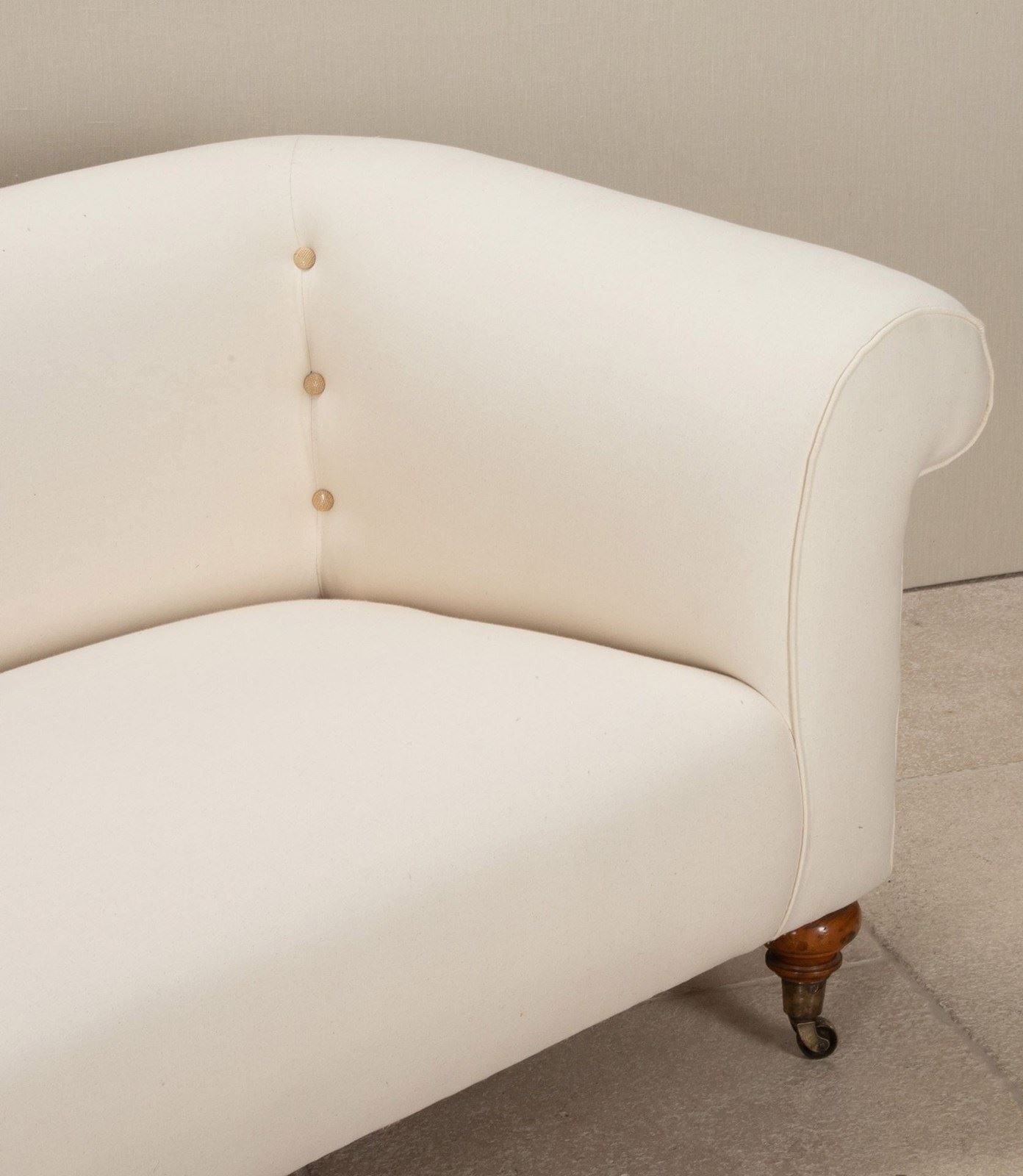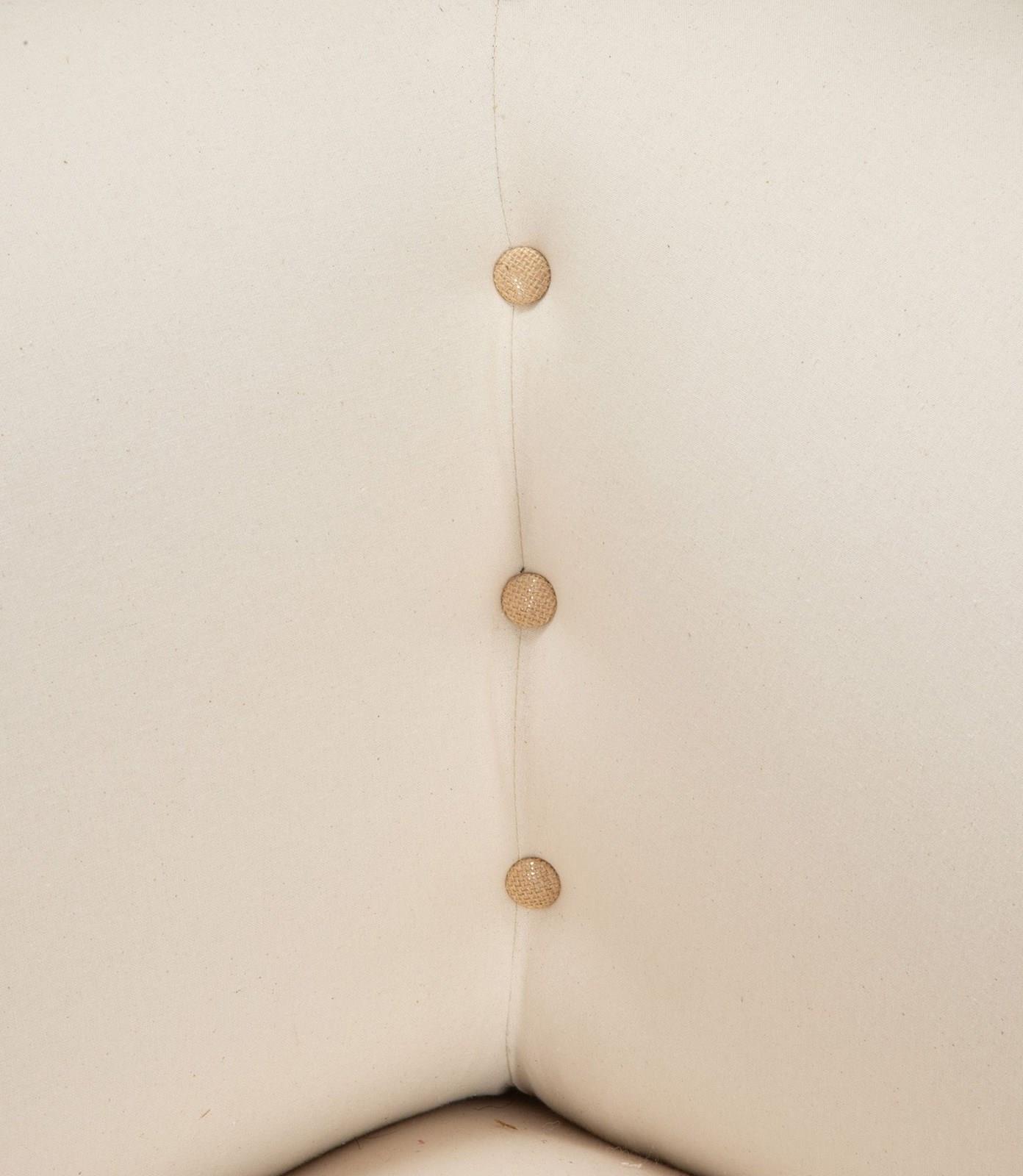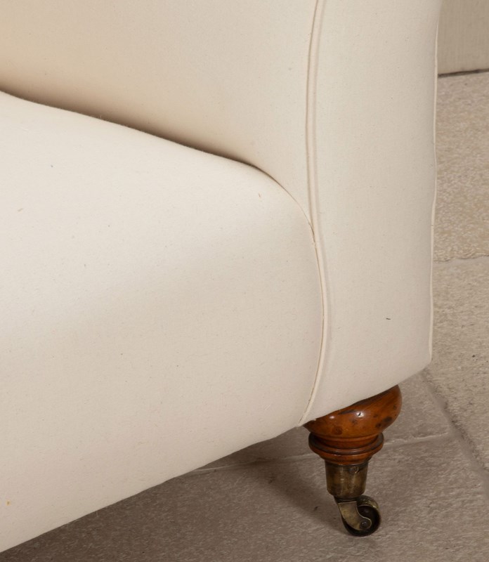Reupholstered in natural calico and jute. Terminating on walnut legs and bold brass castors.