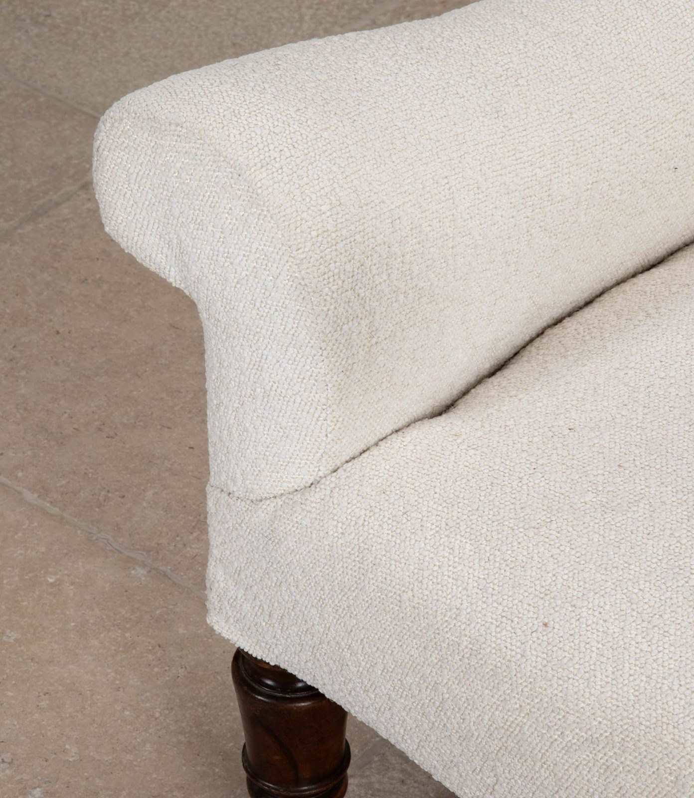 A deep seat with generous swept arms and back are supported by bold turned walnut front legs and swept to the rear.