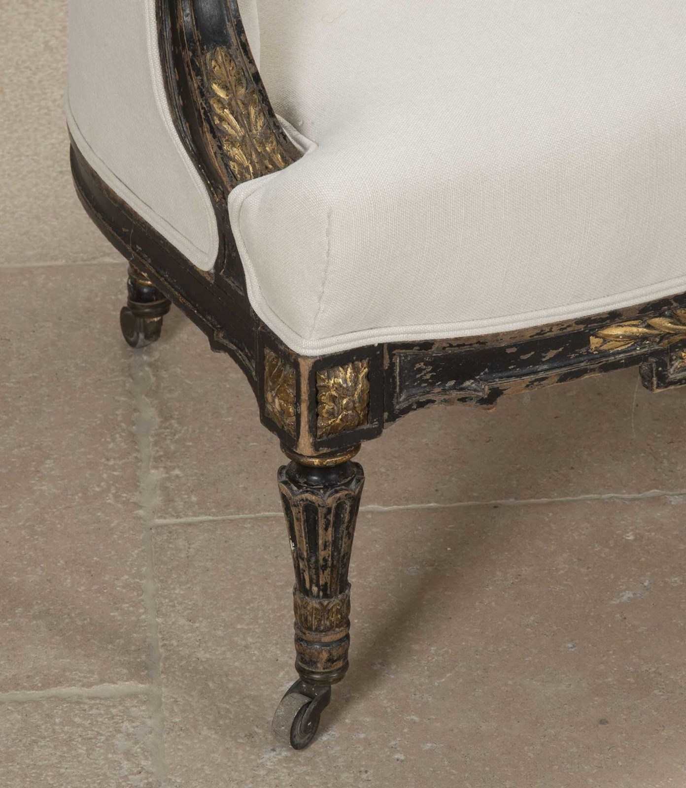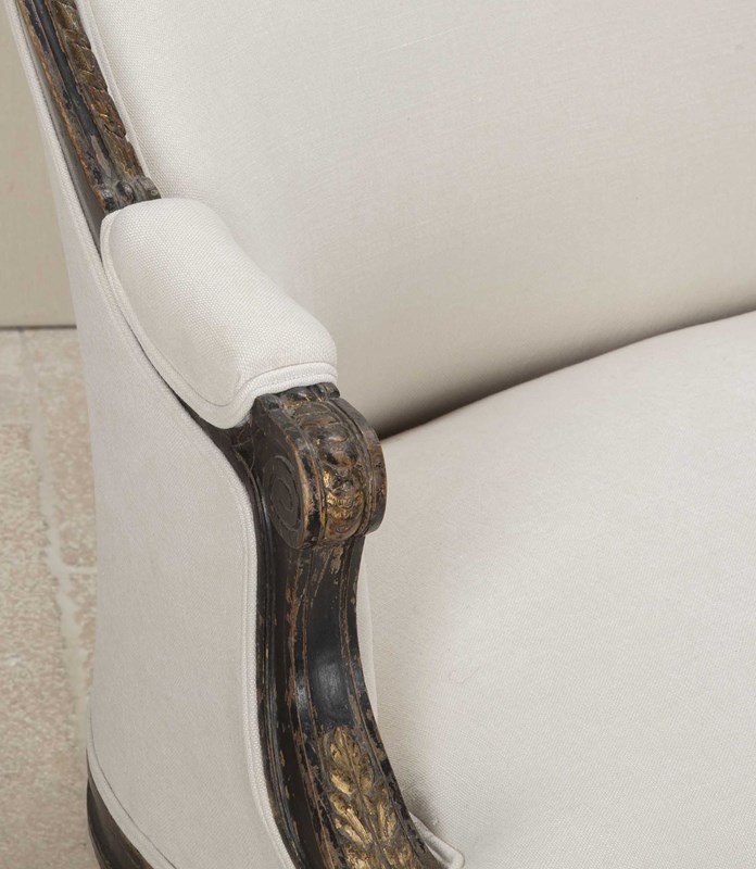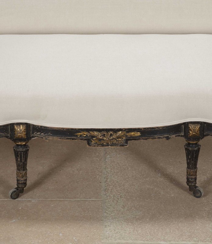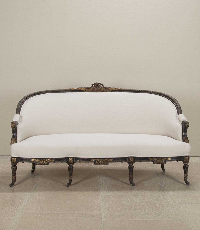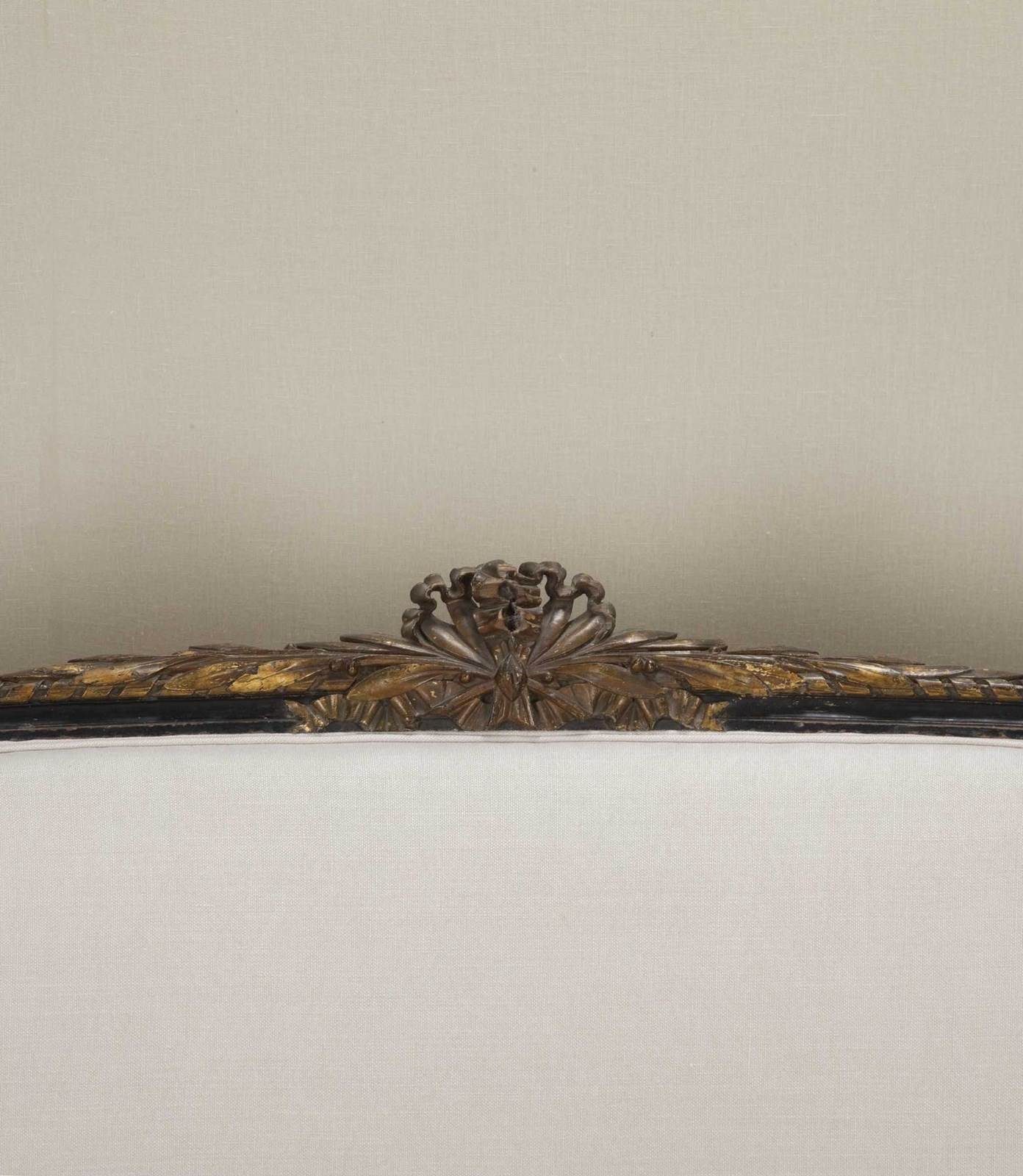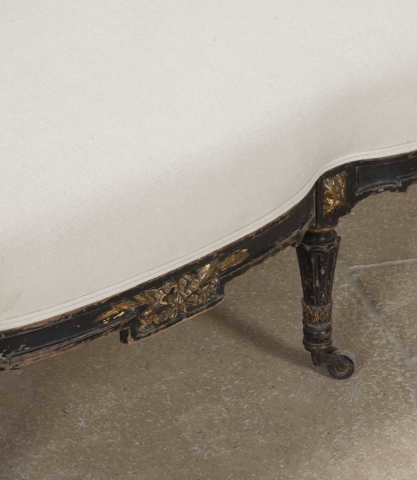 An elegant Napoleon III period French sofa or canape. The ebonised frame with gilded carved details has a corbeille form with down-swept arms and a serpentine front. It has been newly recovered in an off-white vintage French linen.