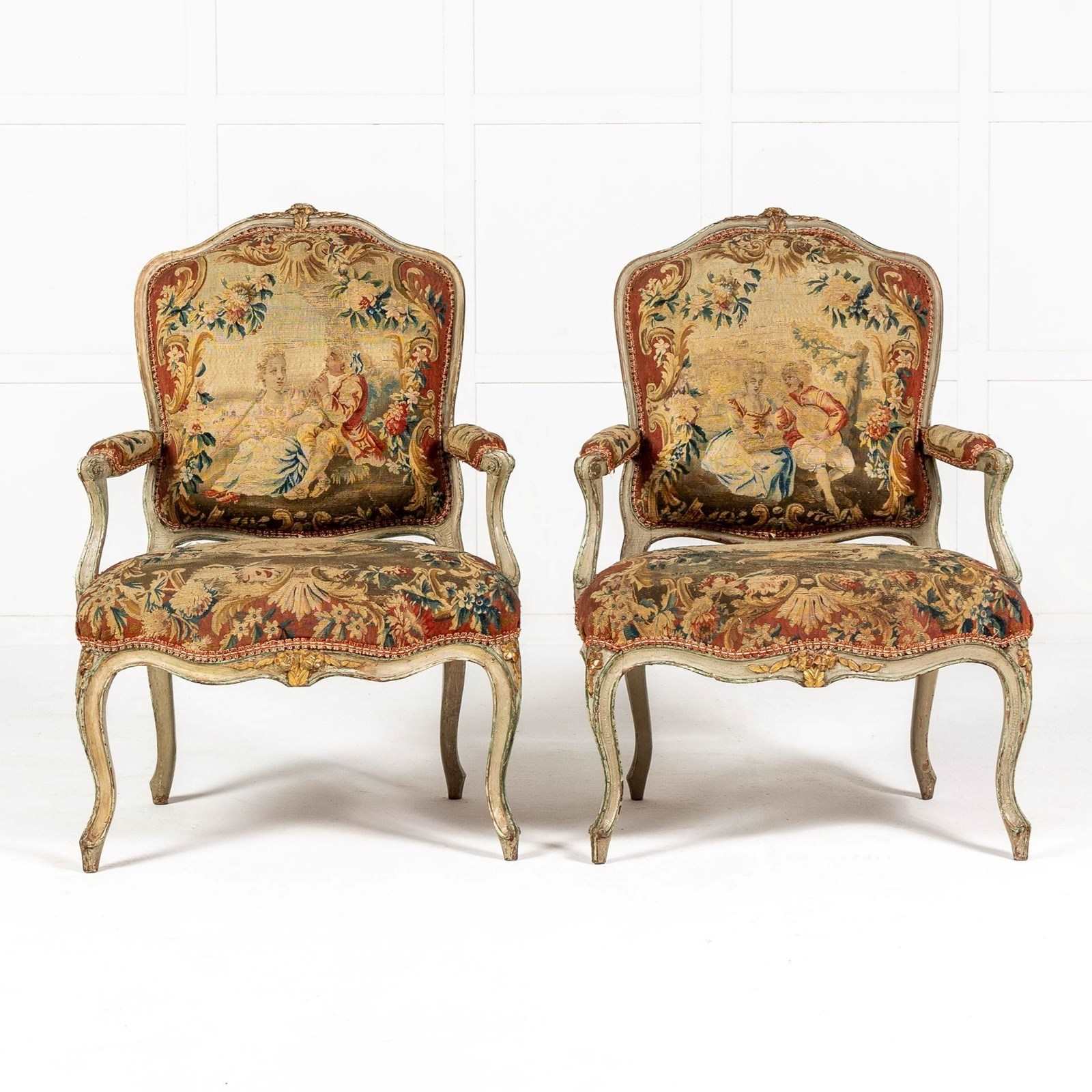 Pair of curvaceous 18th Century French chairs with their original Aubusson tapestry and original paint and gilding.