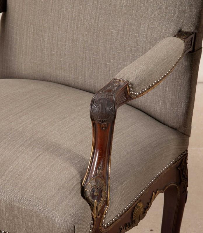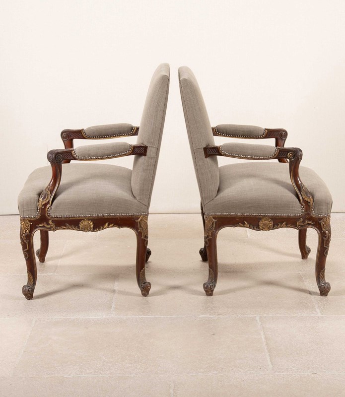 Pair of 19th Century English mahogany open armchairs. With carved cabriole legs and parcel gilt decoration on all carved surfaces. Open armrests with scroll decoration at the elbows and carved foliate decoration. Shells carved both front and back of the chair below the seat. Newly upholstered in good strong linen with stud work around the seat of the chair and armrests. Very impressive chairs in excellent condition.