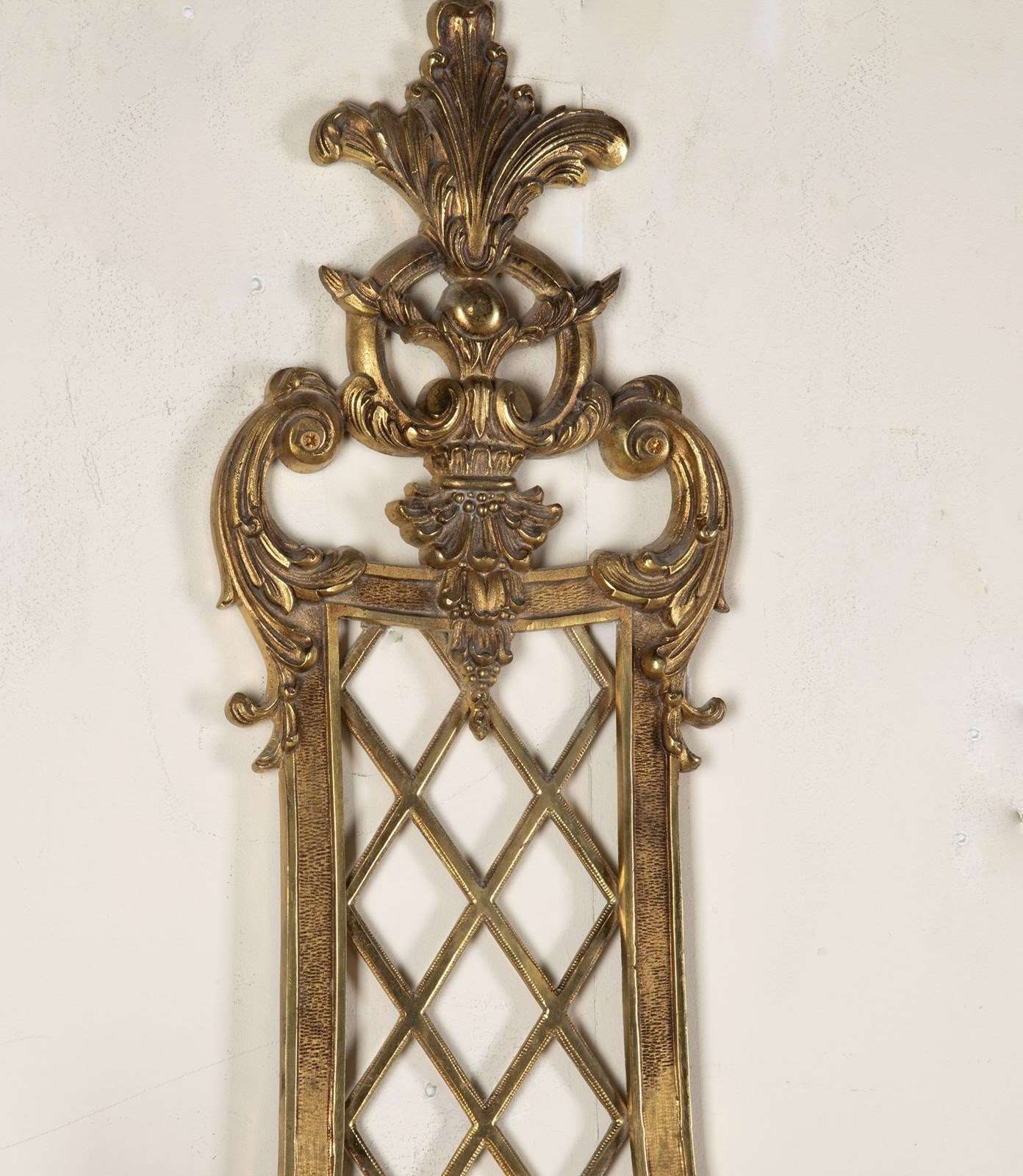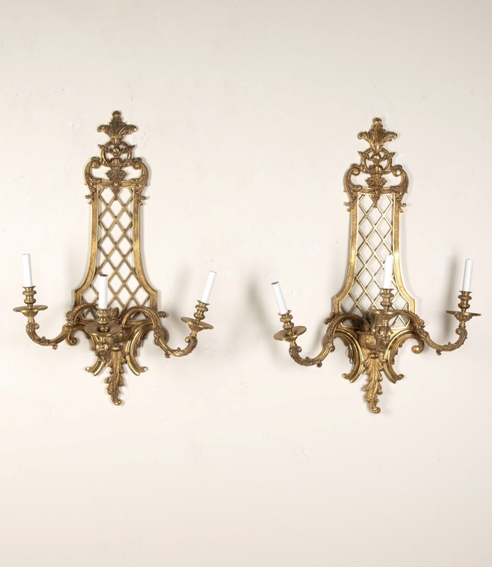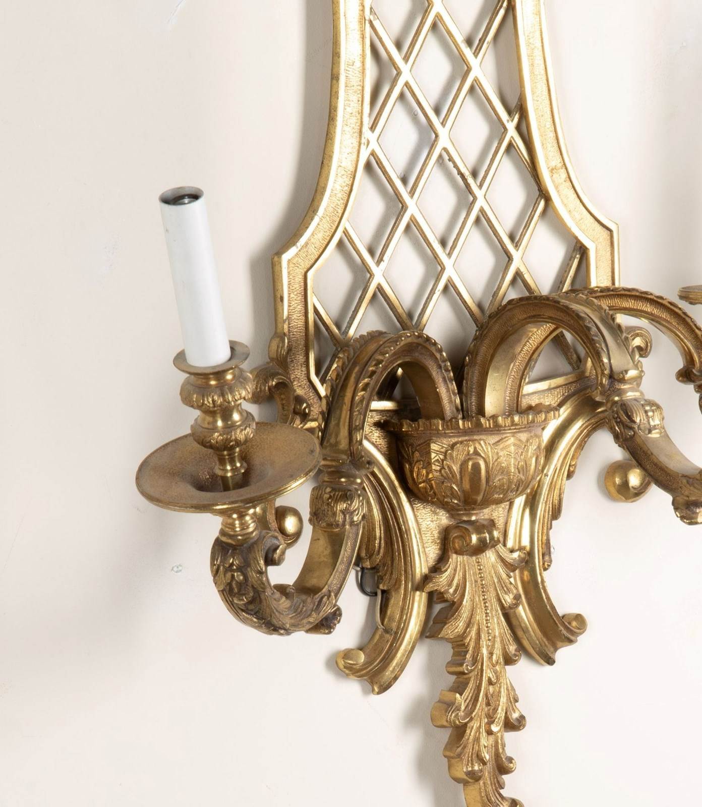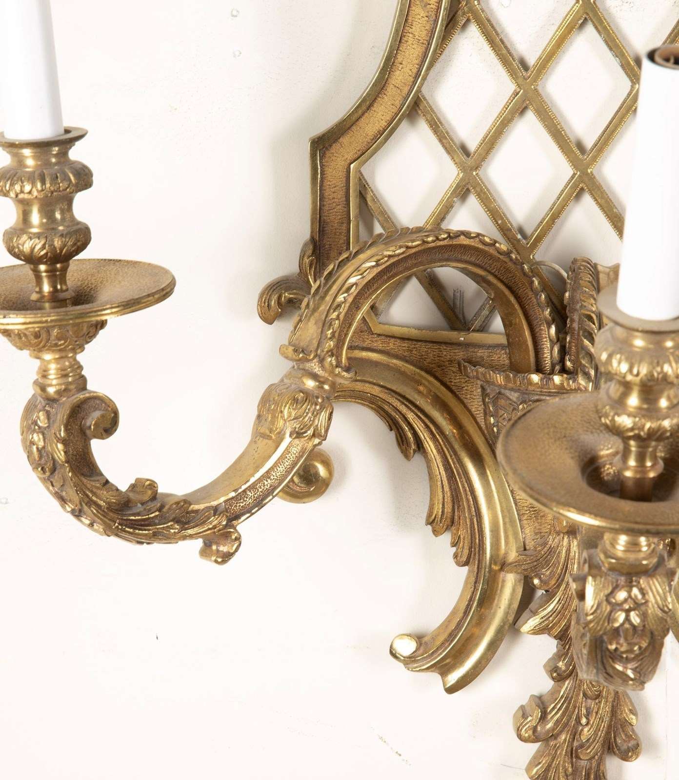 Pair of 19th Century French three armed Louis XVI style brass wall sconces. With ornate trellis work.