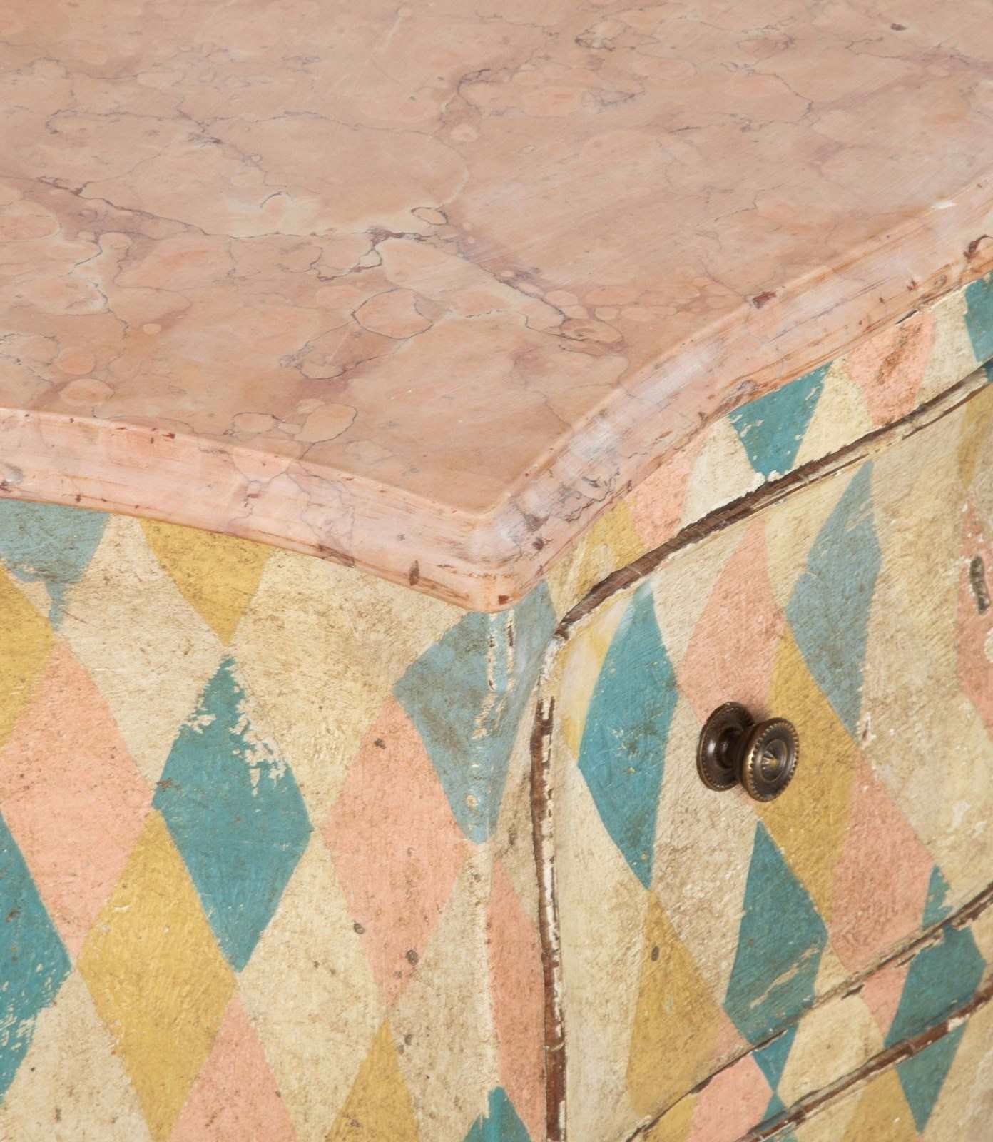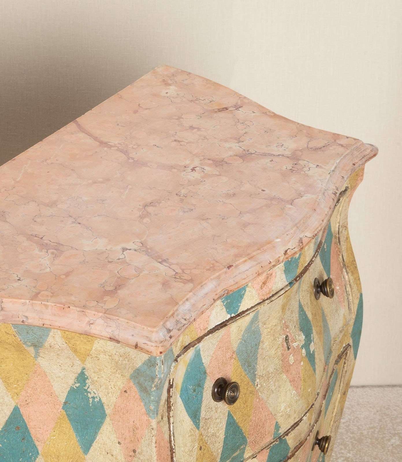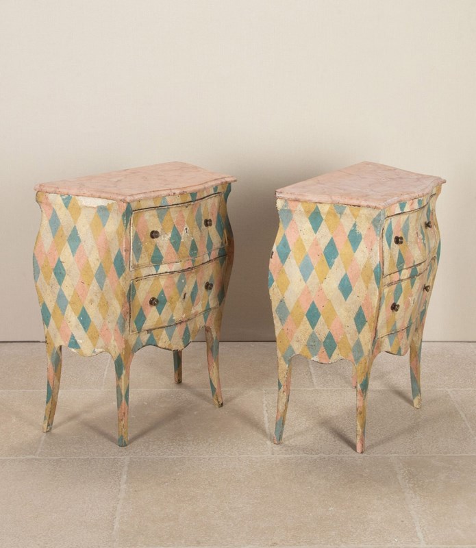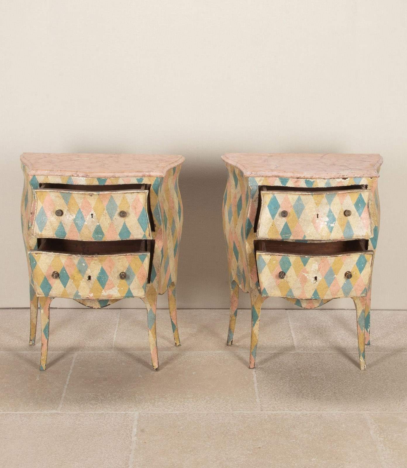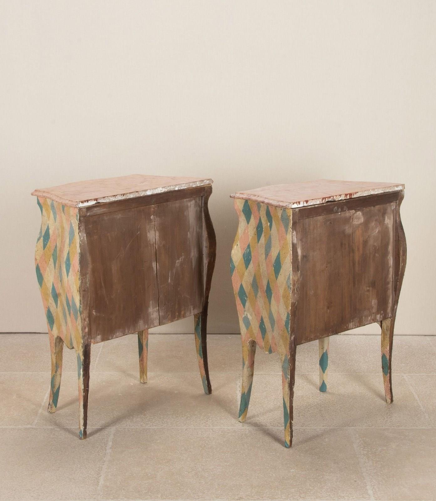 Each two drawer commode has a shaped pink marble top, brass fittings and later hand painted harlequin design.