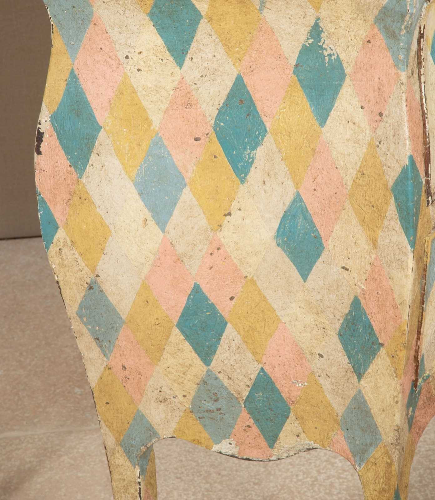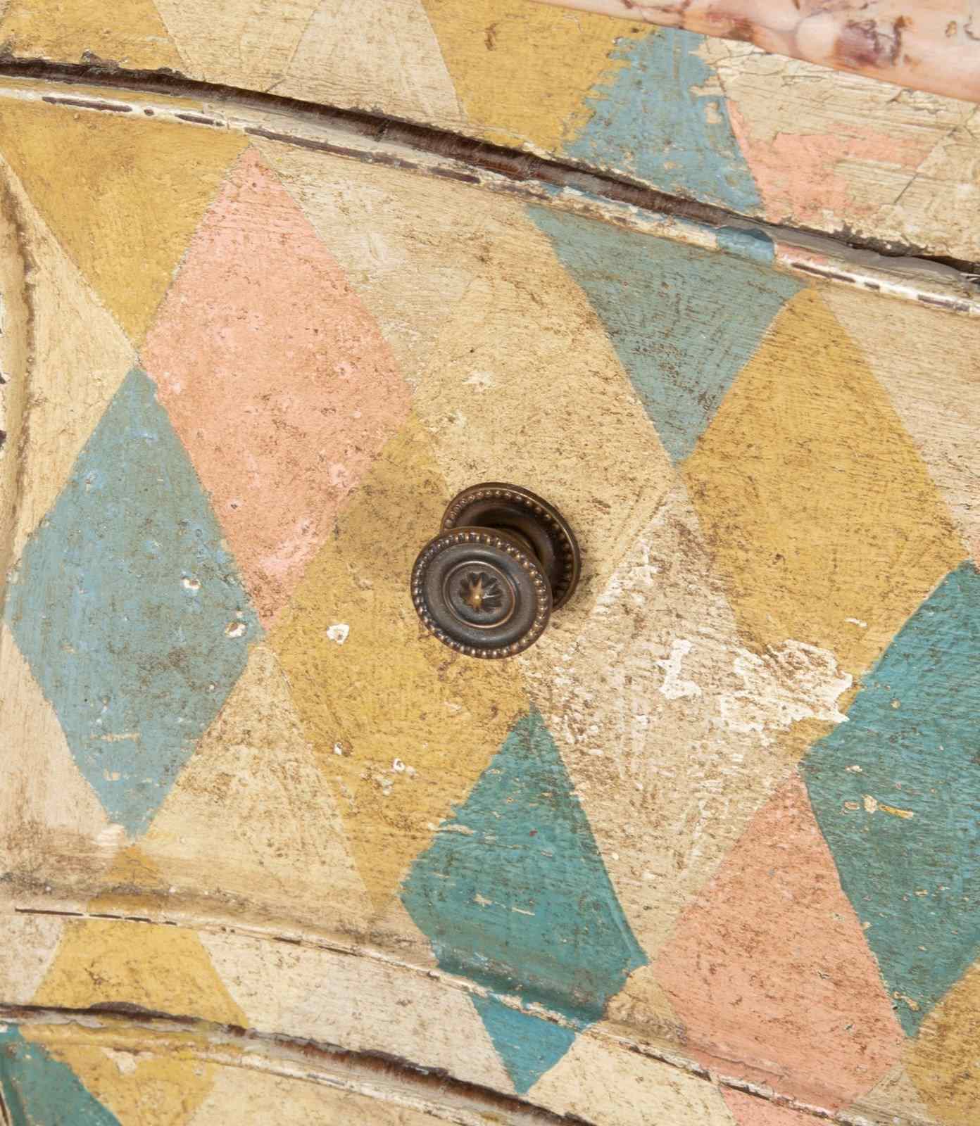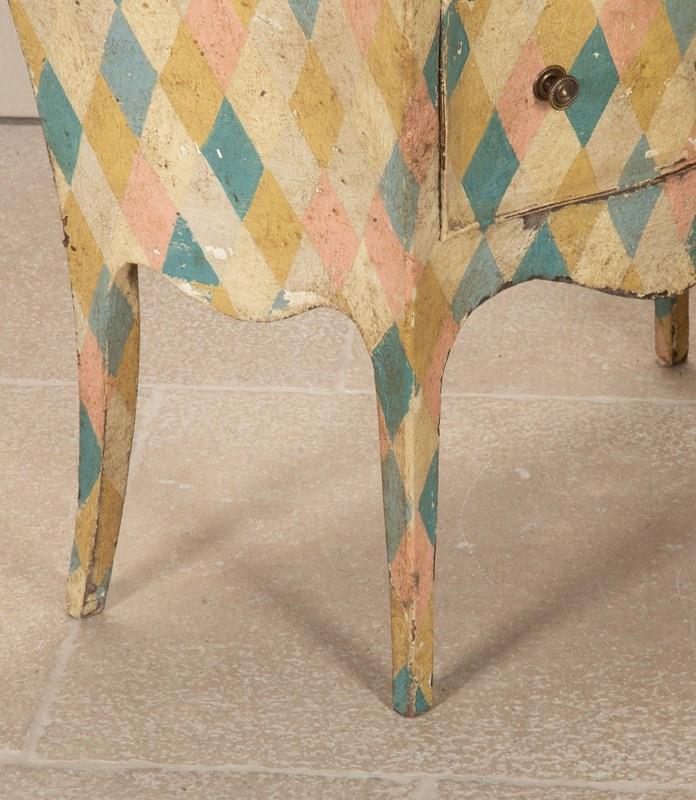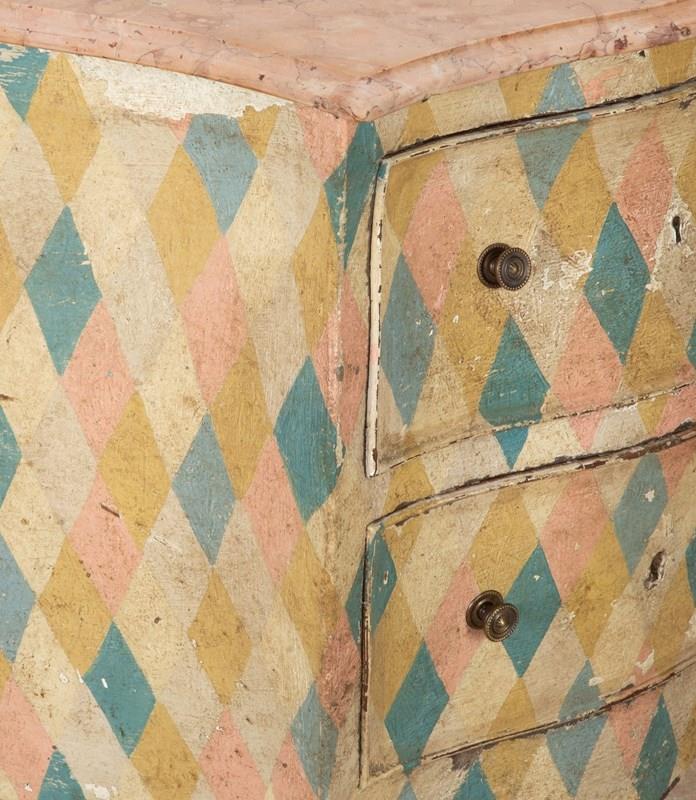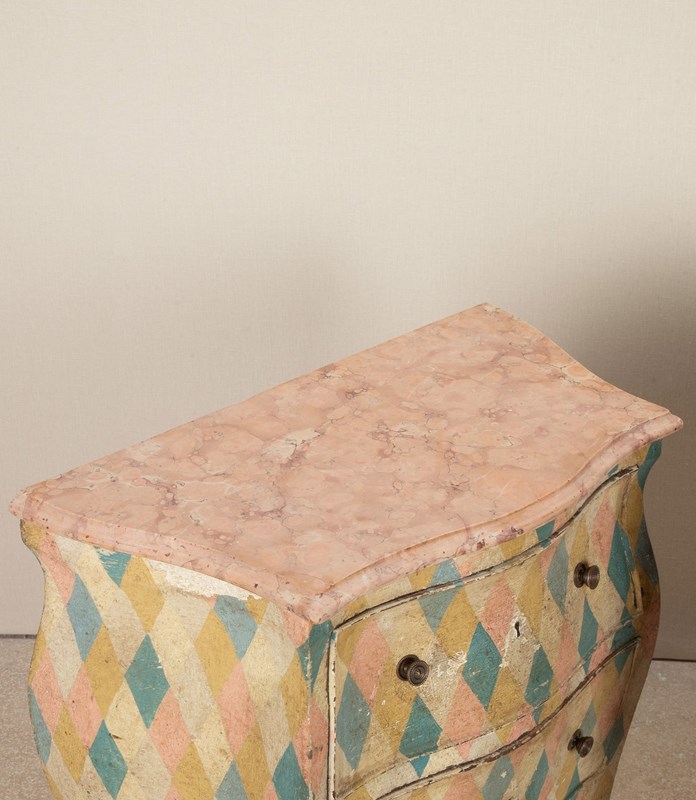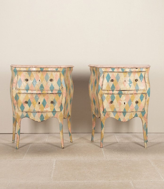 Each two drawer commode has a shaped pink marble top, brass fittings and later hand painted harlequin design.