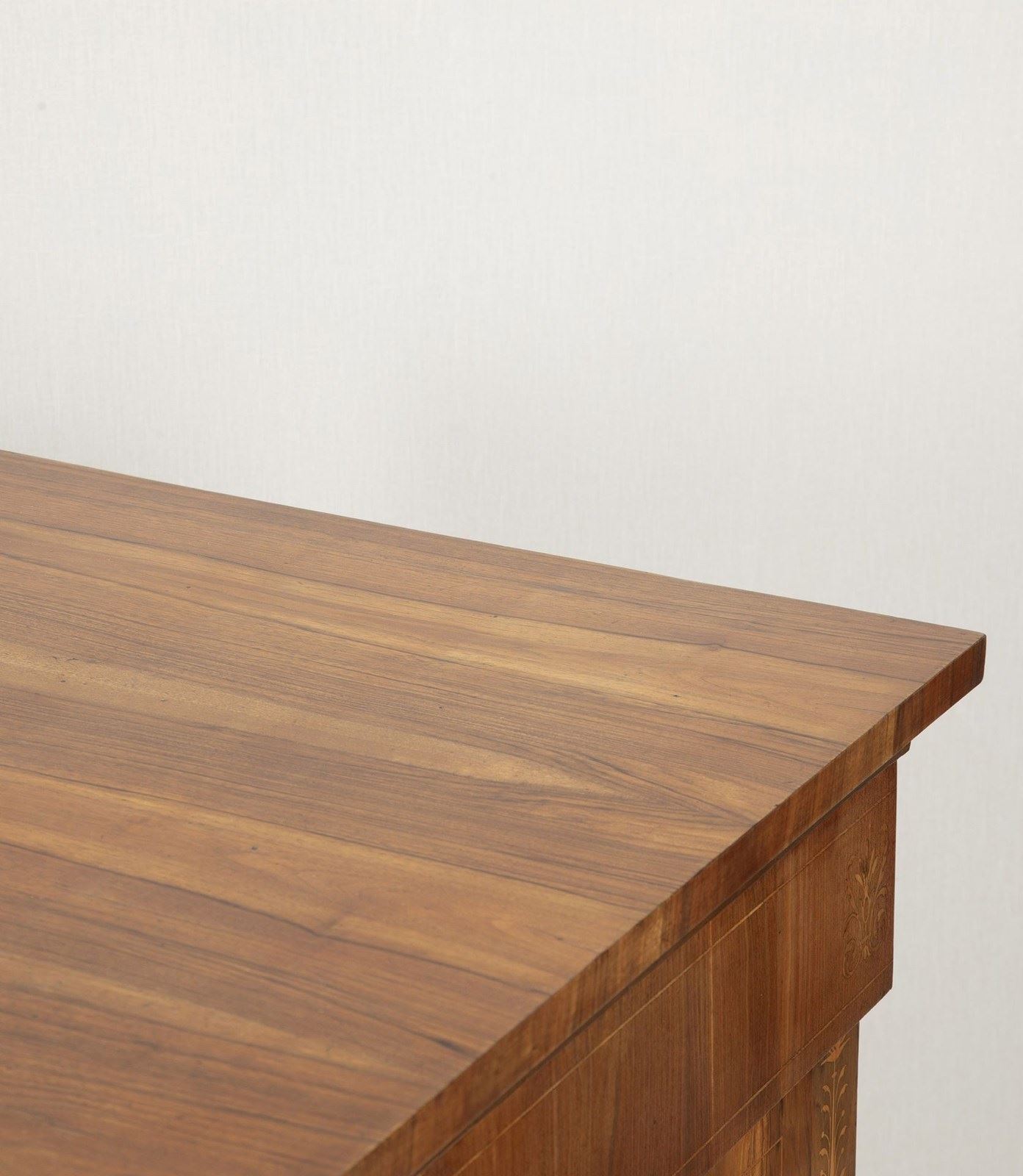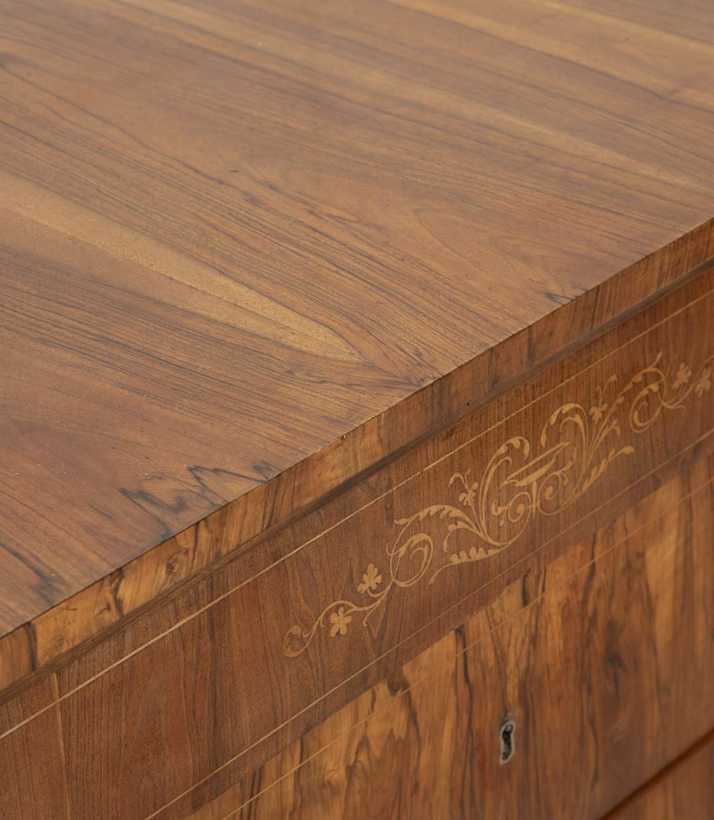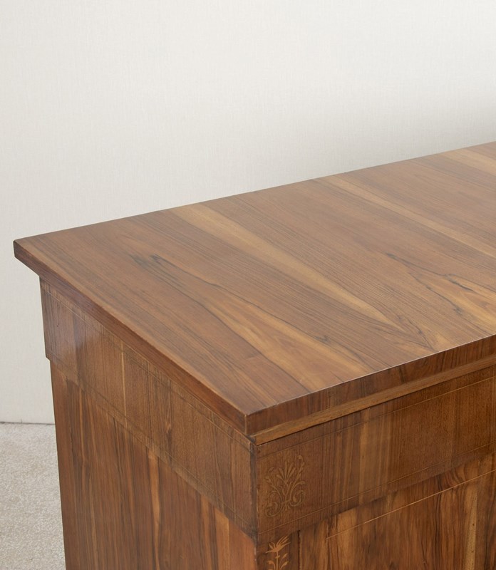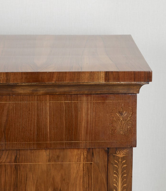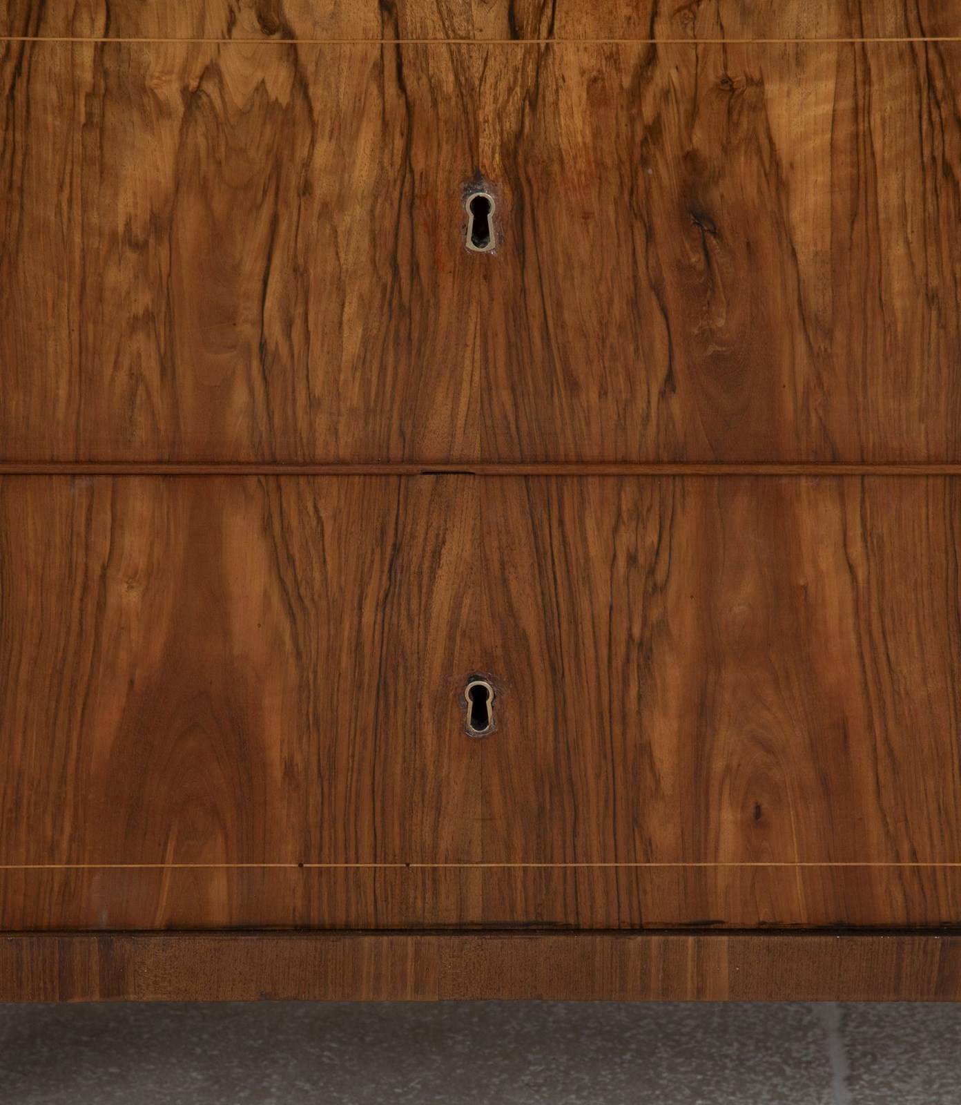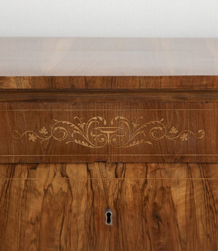 Matching walnut with boxwood inlay to the sides and top drawer. Both have being cleaned and polished to look their best.