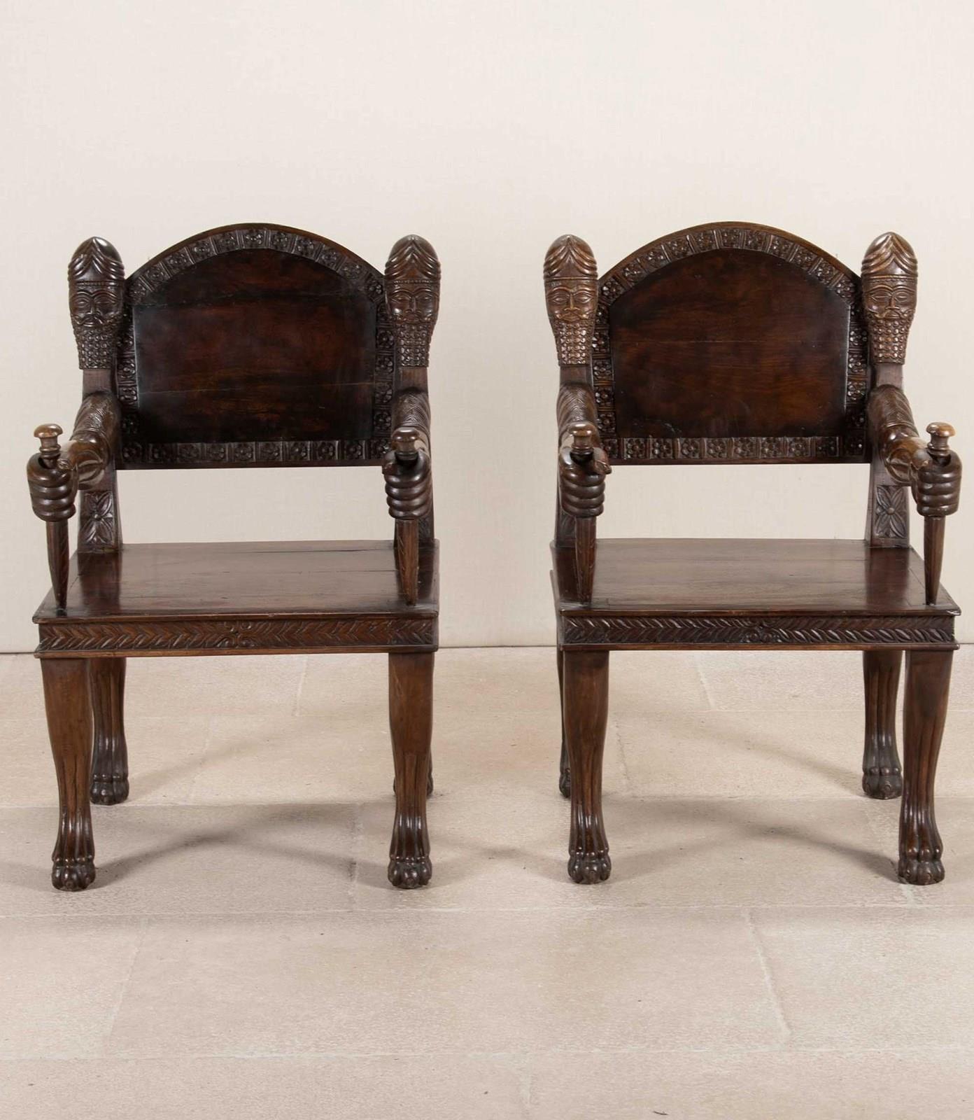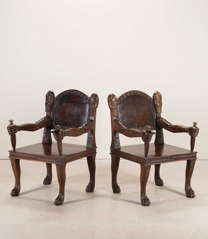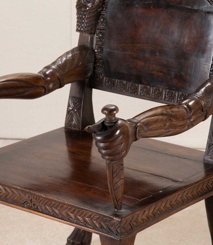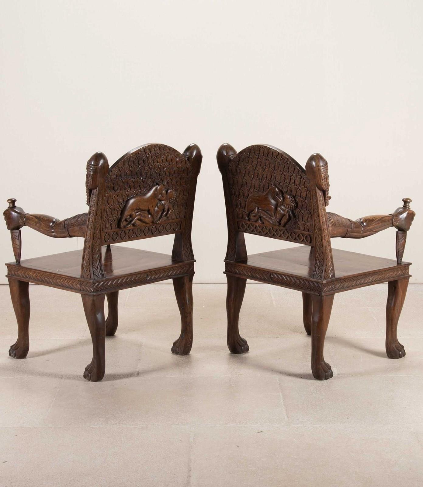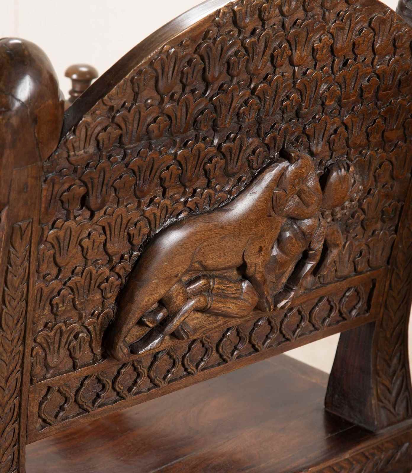 Very heavy wood with distinctively otherworldly look about them. The arms of the chair carved as actual arms holding a dagger which is the arm support. The back rest has a simple flower motive that repeats all the way around its front facing surface. The back of the seat has more detailed carving of a lion attacking a maiden. The backrest has the mask of a turbaned man with beard on either side.