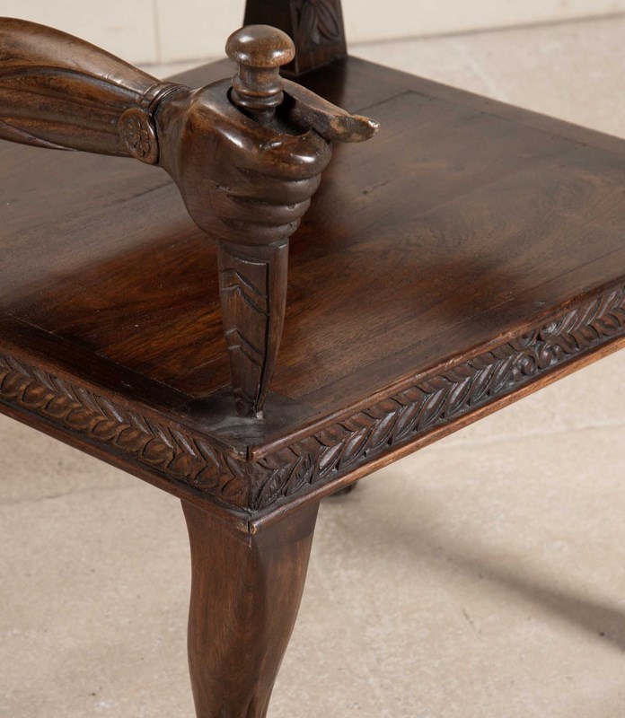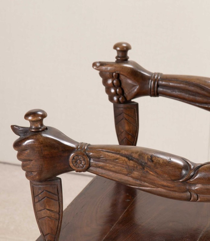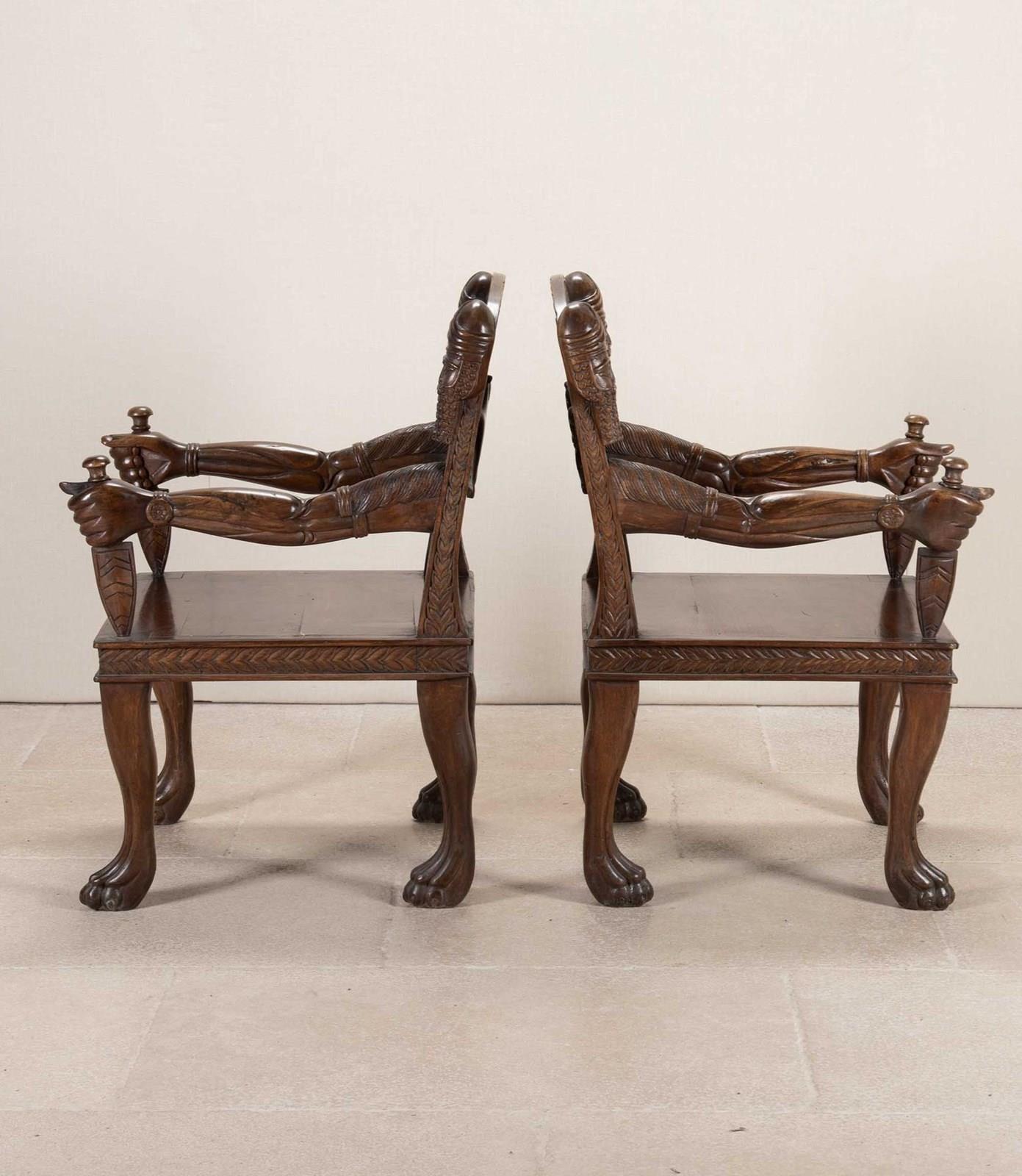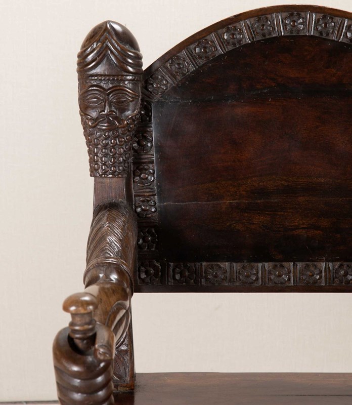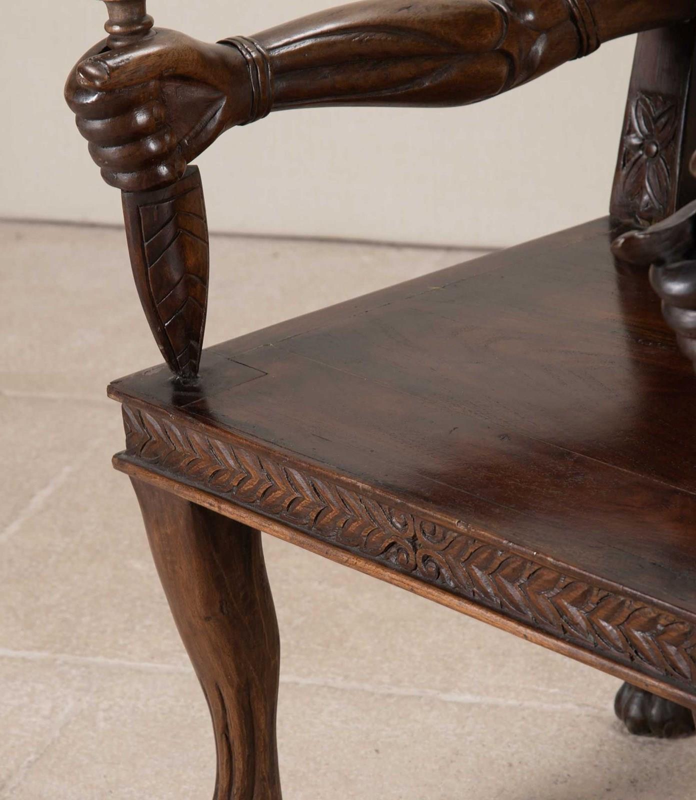 Very heavy wood with distinctively otherworldly look about them. The arms of the chair carved as actual arms holding a dagger which is the arm support. The back rest has a simple flower motive that repeats all the way around its front facing surface. The back of the seat has more detailed carving of a lion attacking a maiden. The backrest has the mask of a turbaned man with beard on either side.