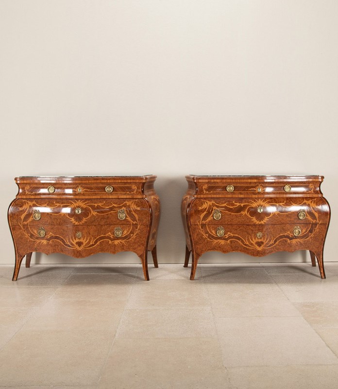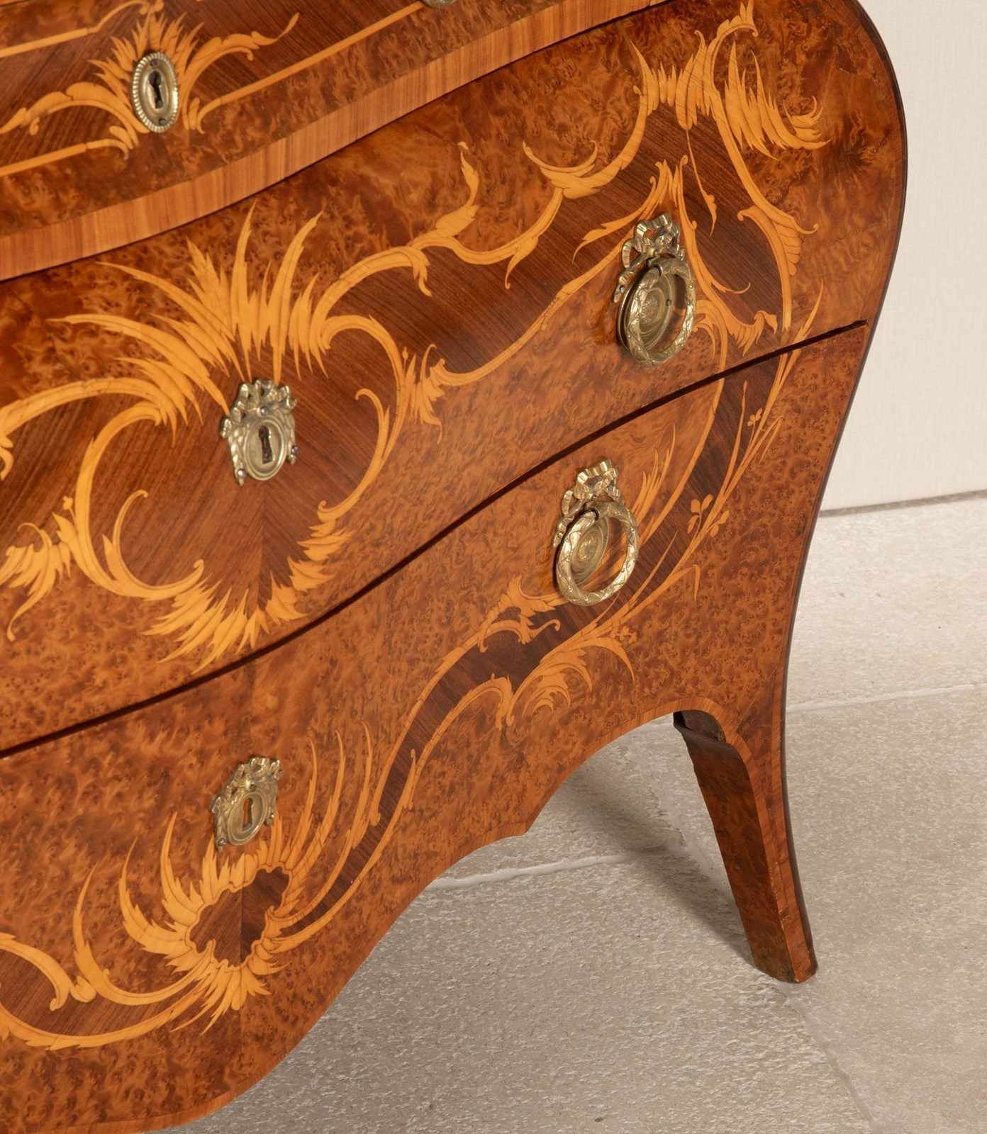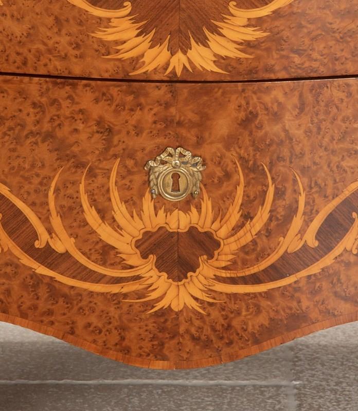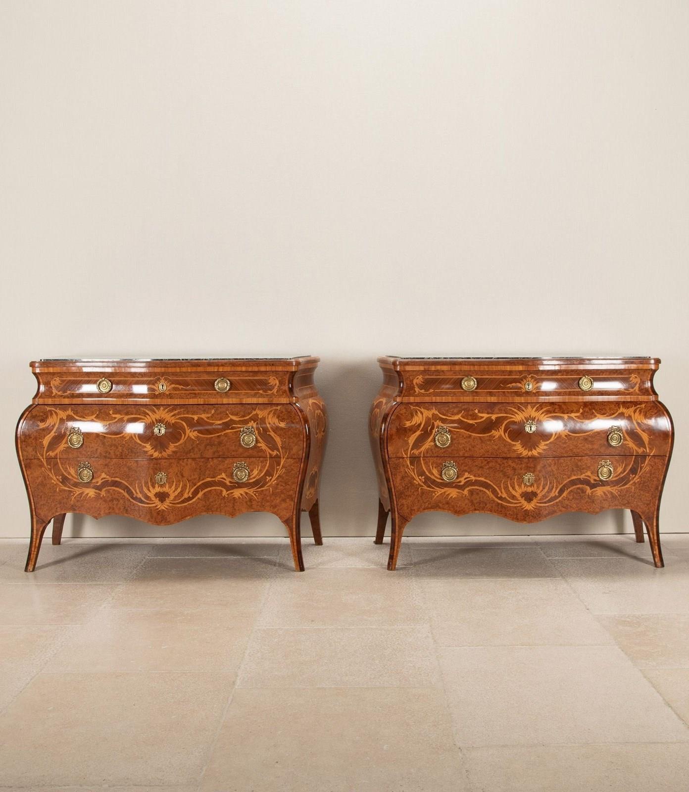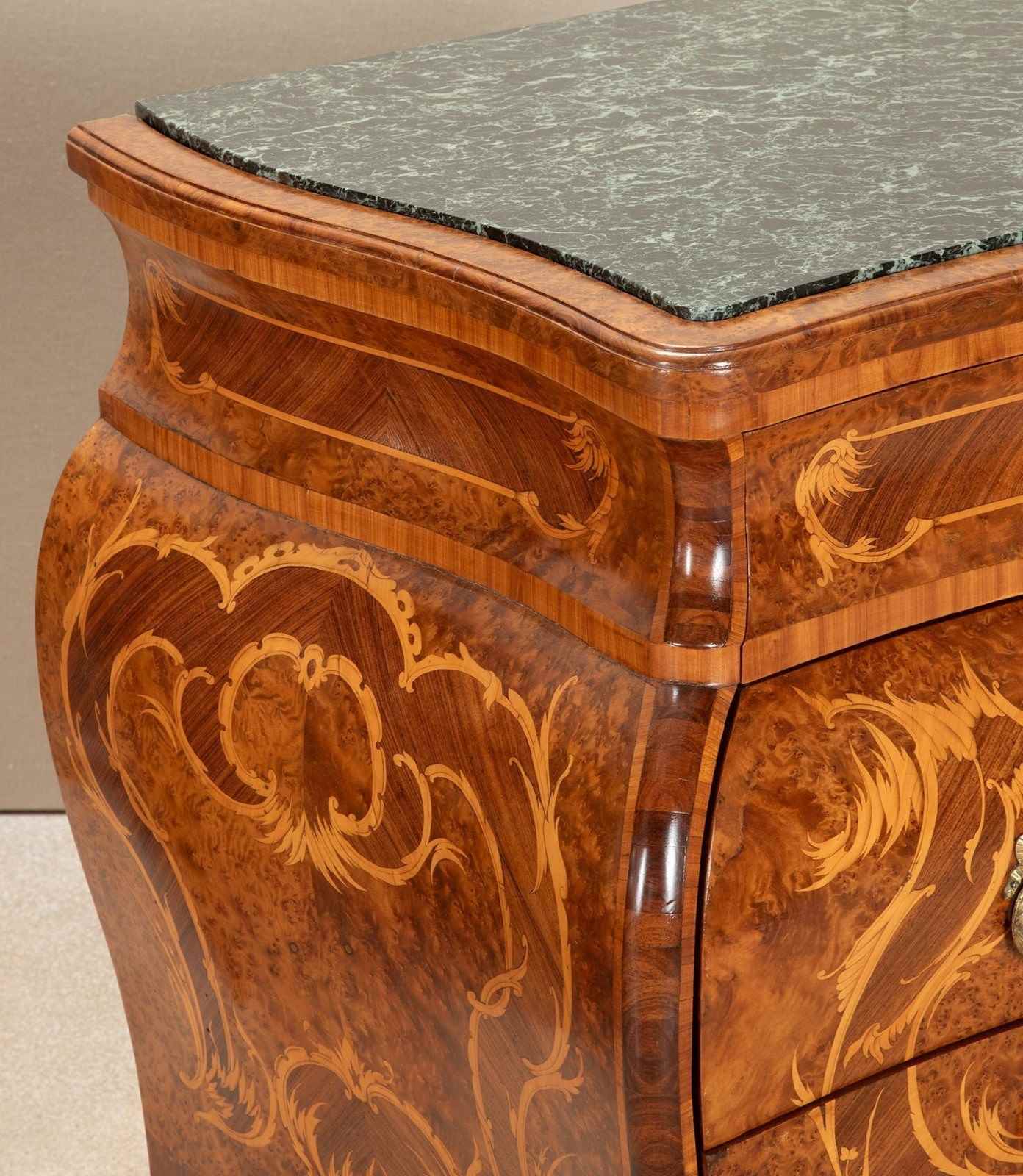 A pair of 20th Century Italian Bombe commodes featuring a display of burr walnut boxwood and kingwood.
