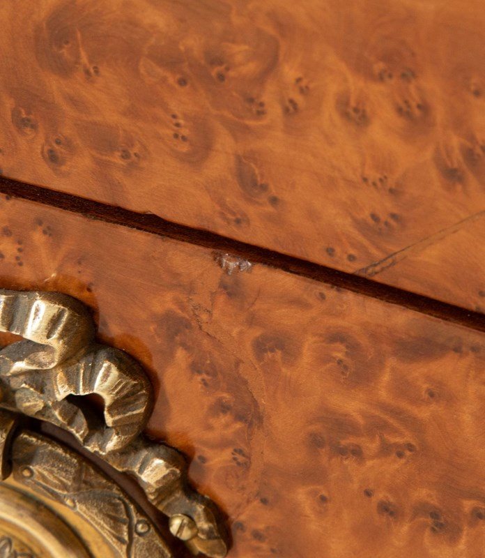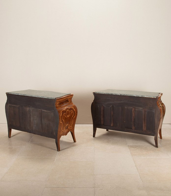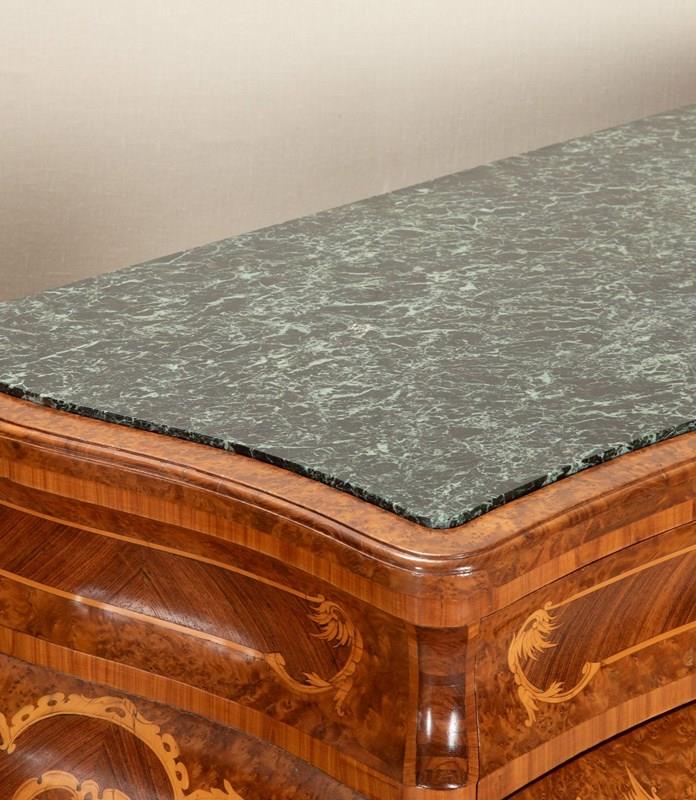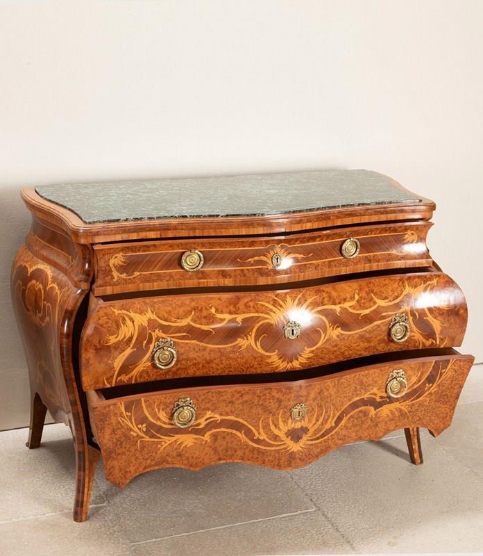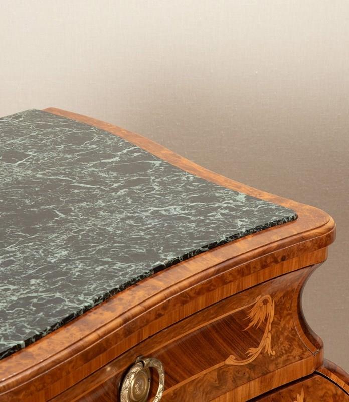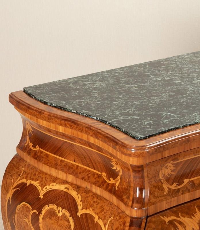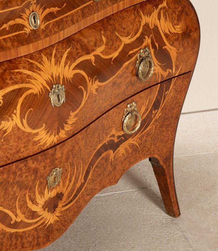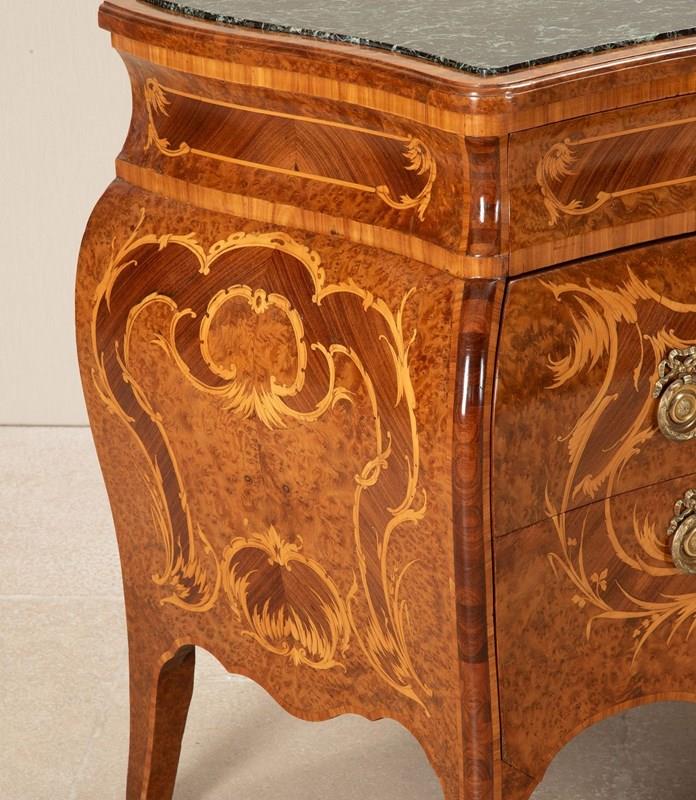 A pair of 20th Century Italian Bombe commodes featuring a display of burr walnut boxwood and kingwood.