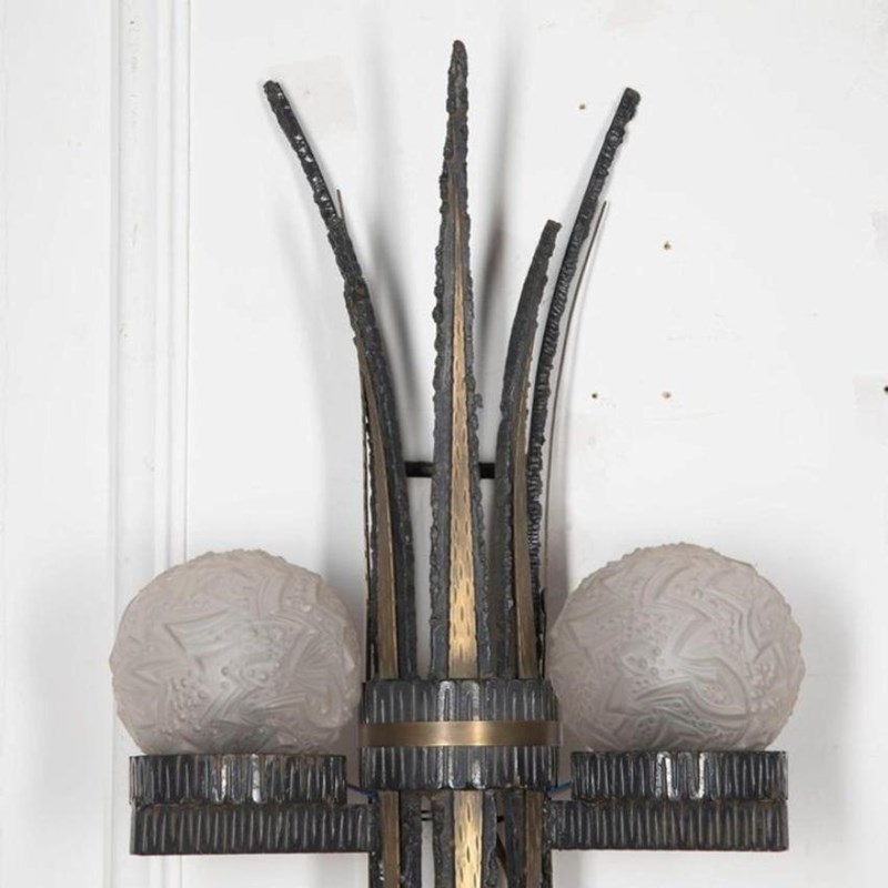 Fantastic pair of wrought iron wall sconces in the Brutalist style.