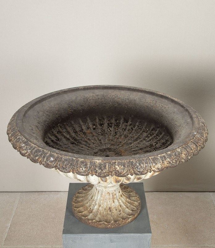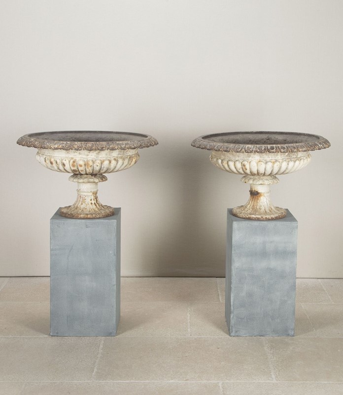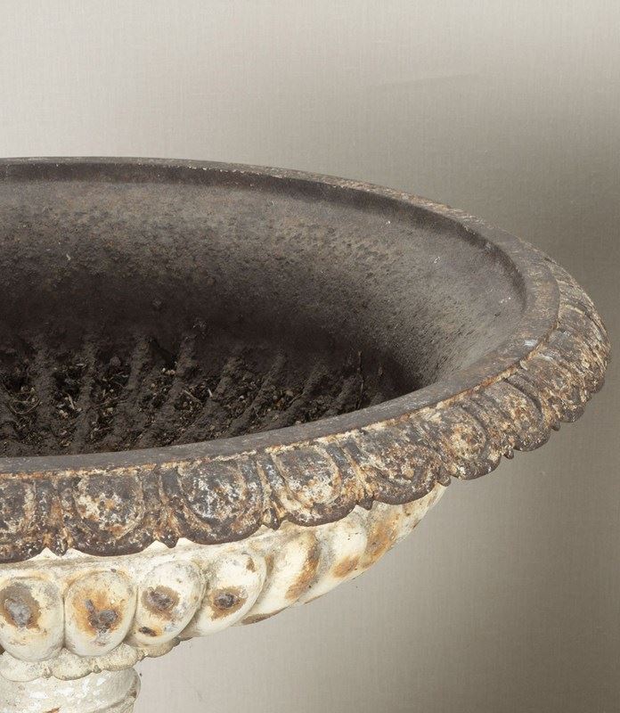 Large pair of late 19th Century English impressive cast iron urns, retaining the original paint. This size is not often seen definite statement pieces for the garden. Circa 1890.
