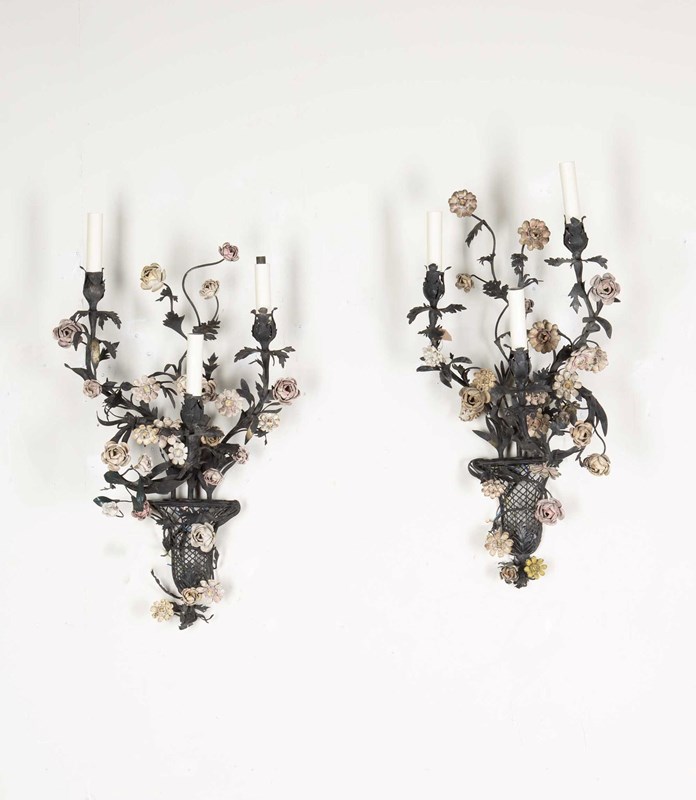A pretty and elegant pair of 19th Century French iron wall lights. Unusual model with multiple flowers and basketweave urns at the bottom.