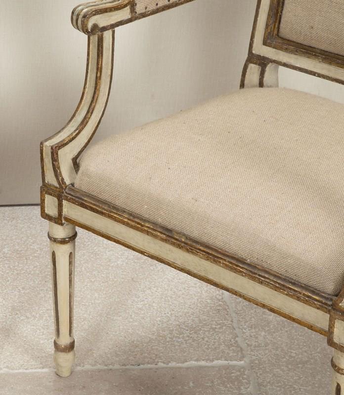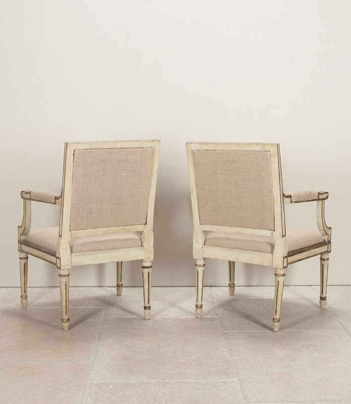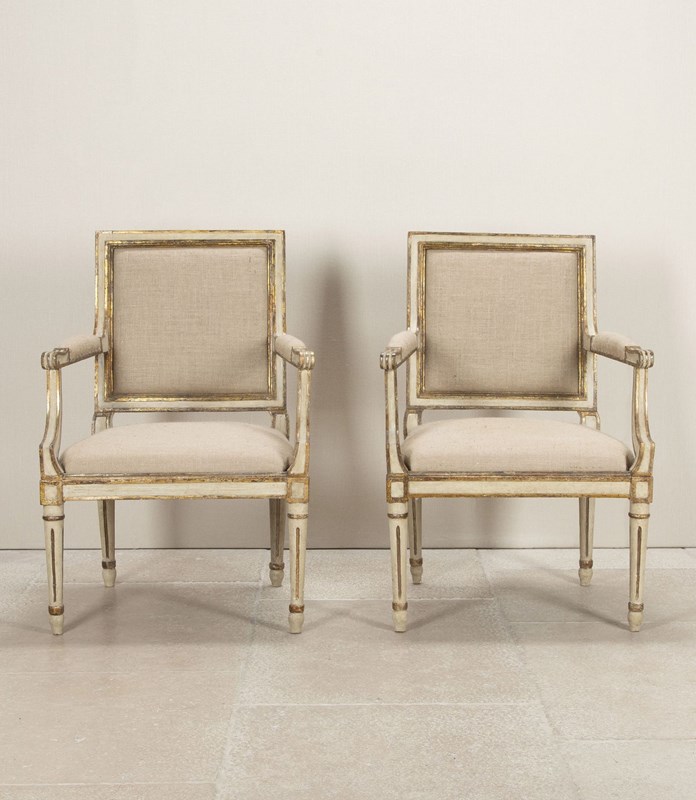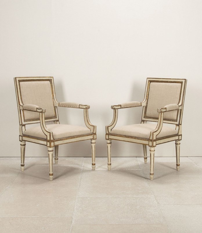 An elegant pair of late 18th Century Italian fauteuils retaining their original cream and gilt decoration. Inspired by the Louis XVI style emanating from France, the simple Neo-classical lines offer elegant and stylish simplicity. Recovered in a raw linen.
