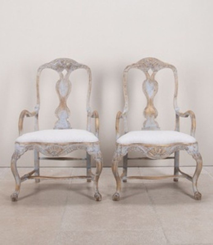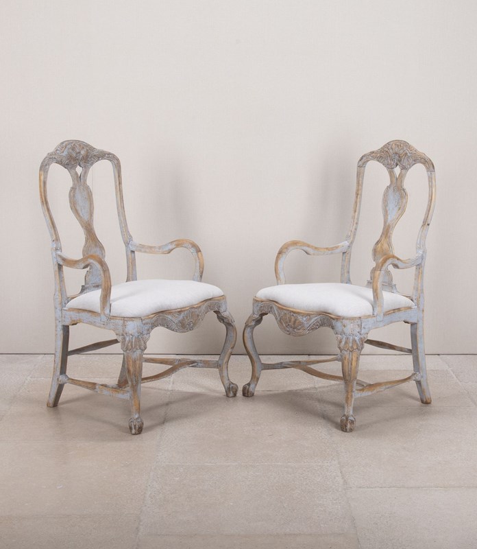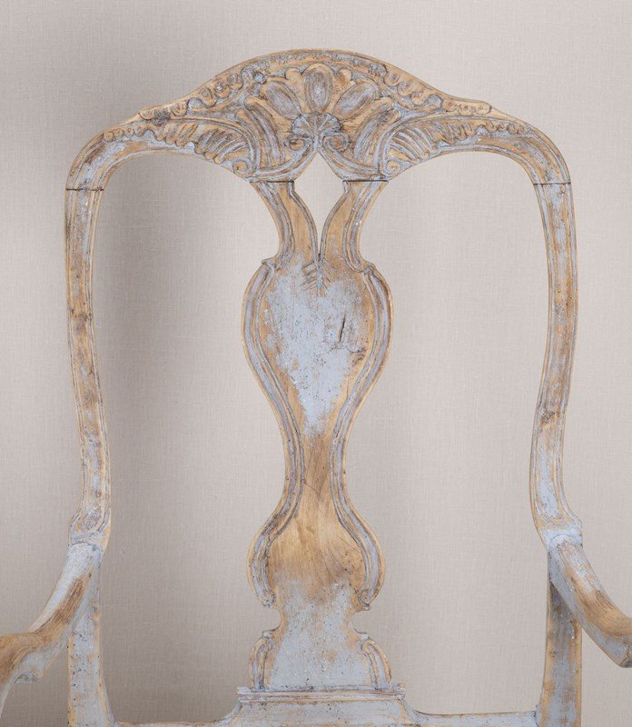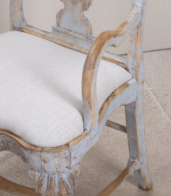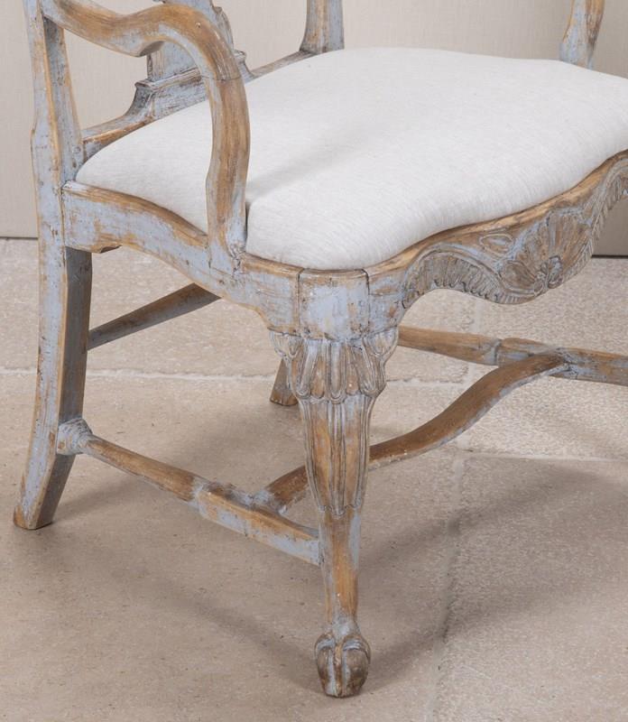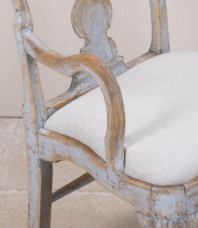 A fine pair of late 18th Century Swedish Lindome armchairs. Excellent carving and shape, in later blue paint. Circa 1770.