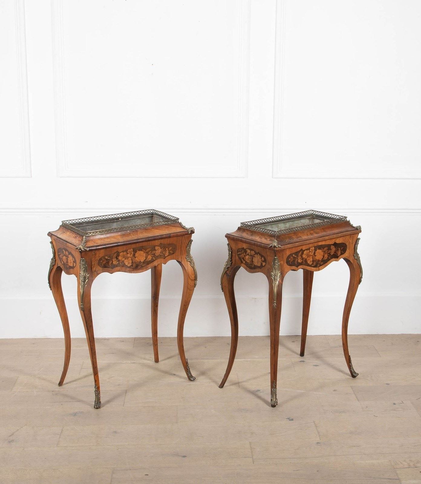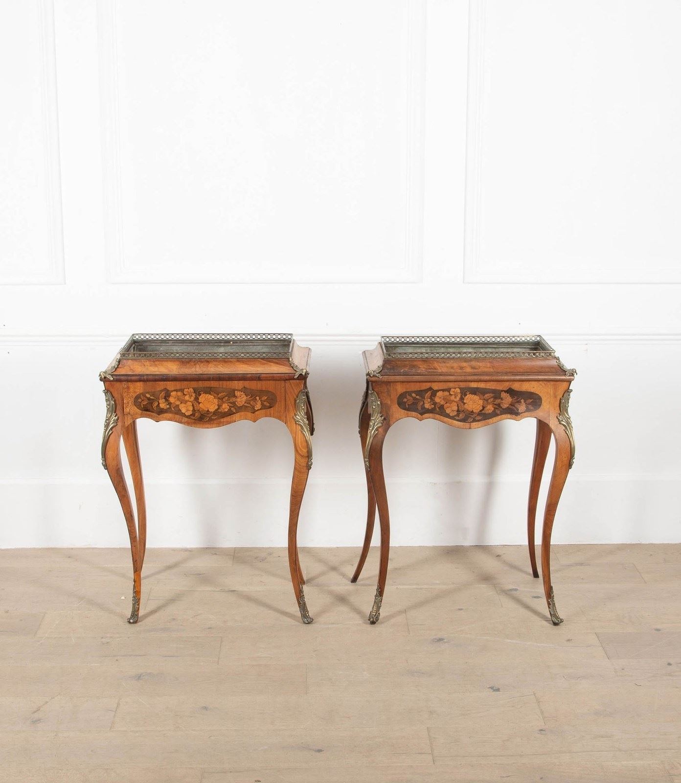 A fine pair of Victorian walnut and rosewood banding jardinieres tables in the French taste.