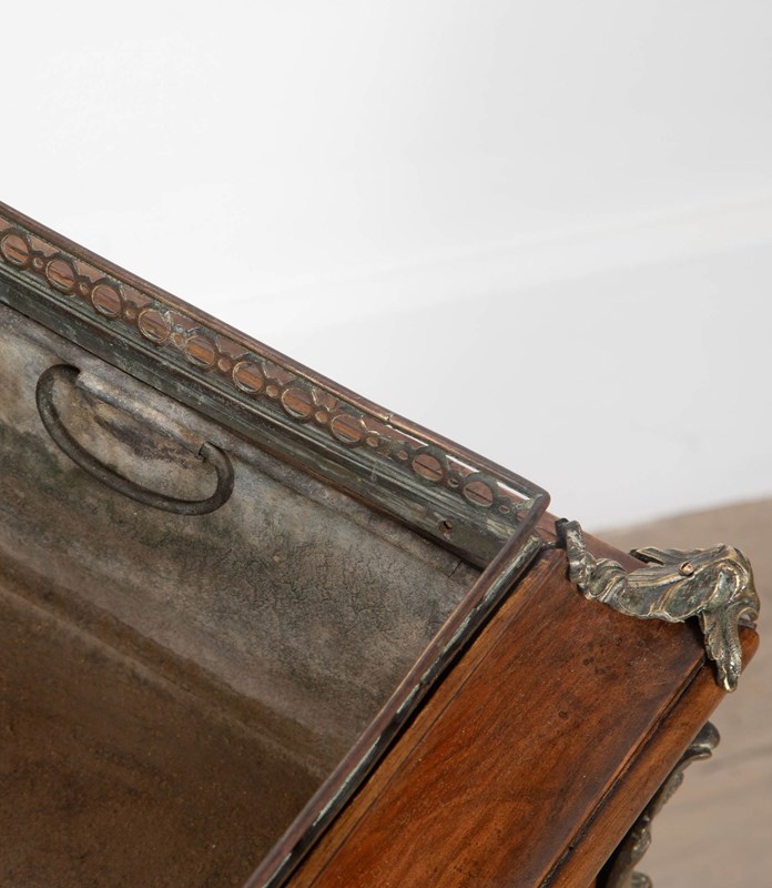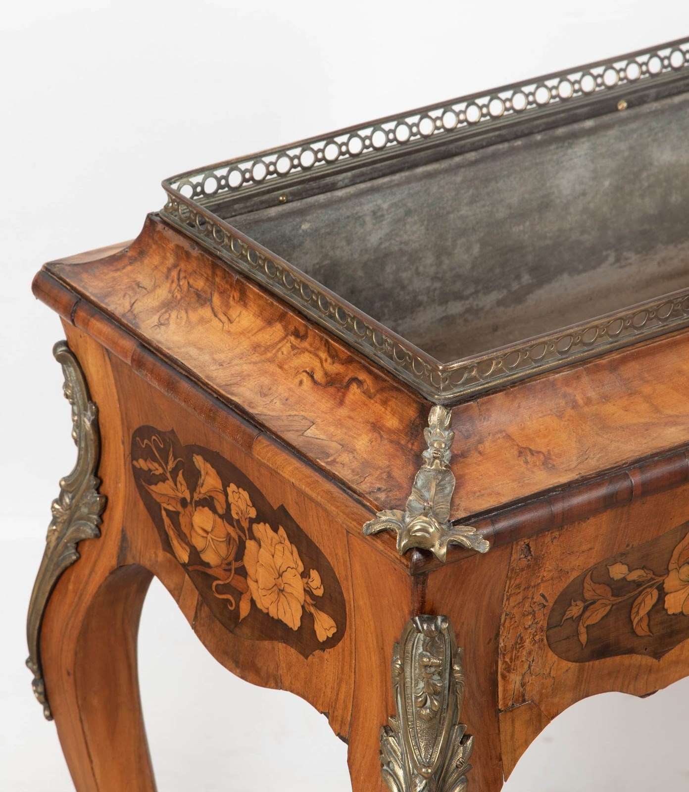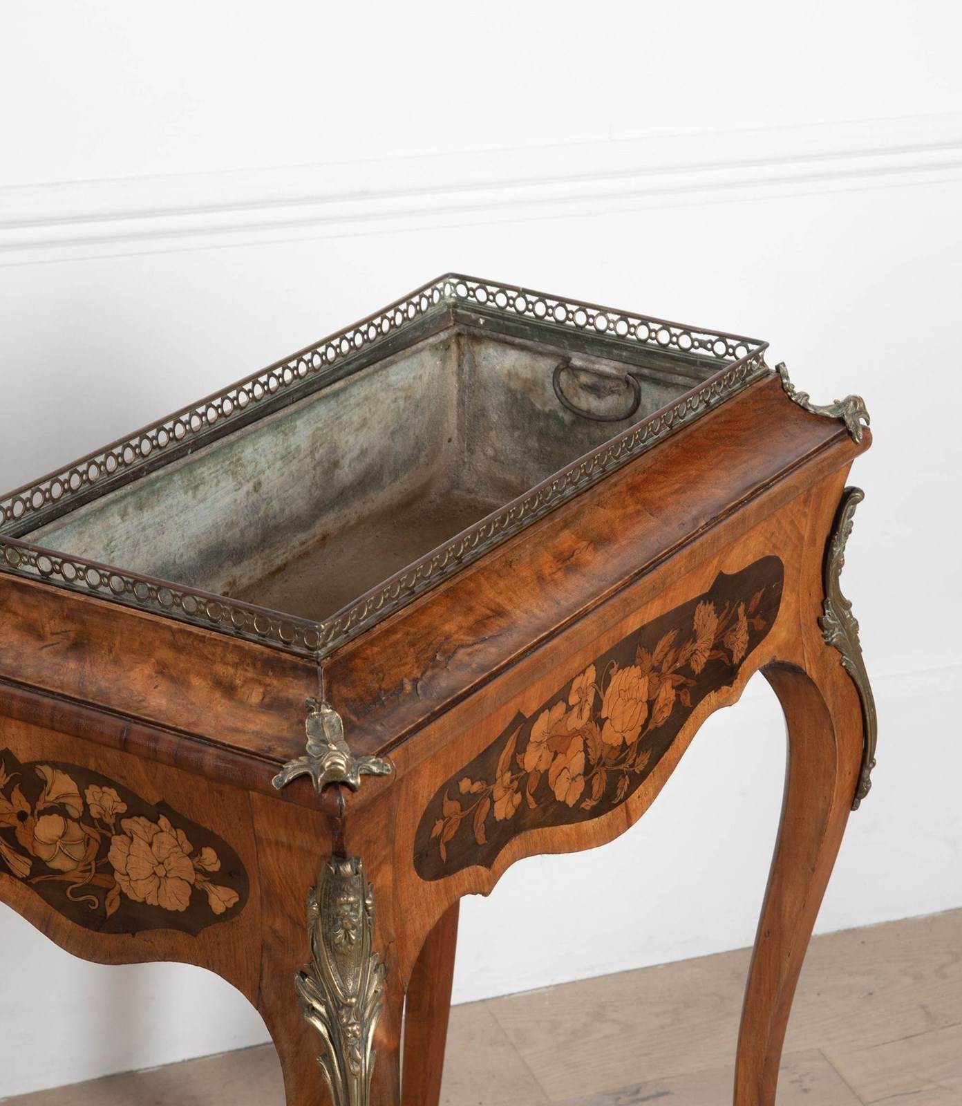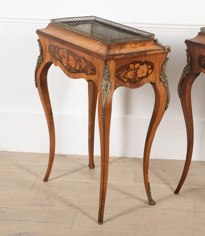 With gilt metal mounts and sabot feet, and a central fruitwood foliage inlay, on cabriole legs with original zinc planter holders.