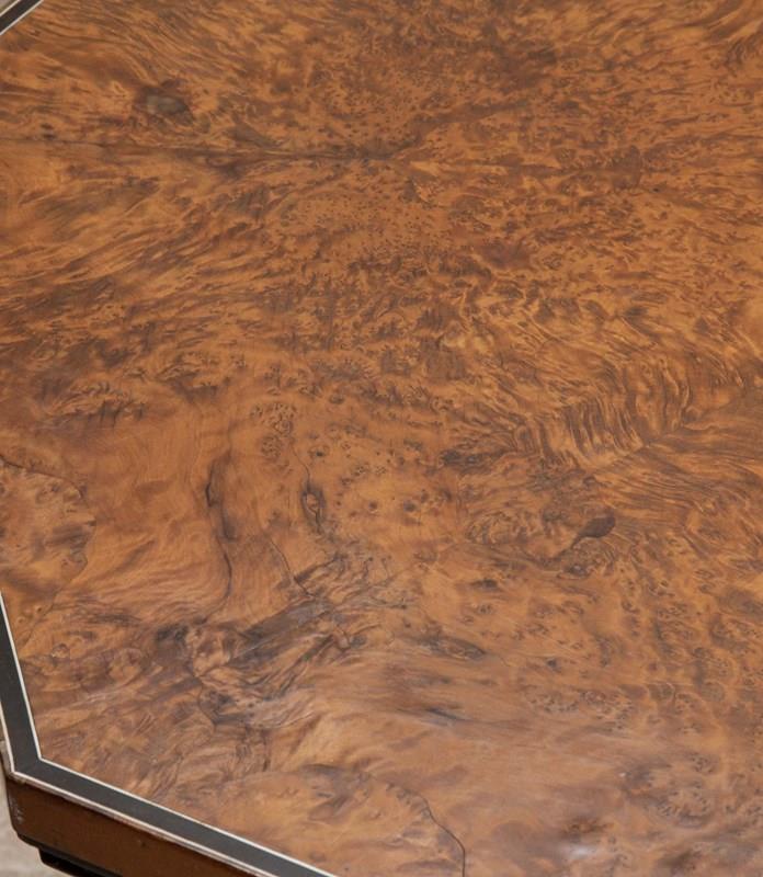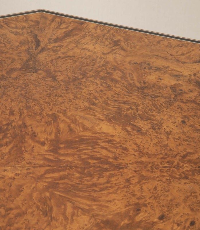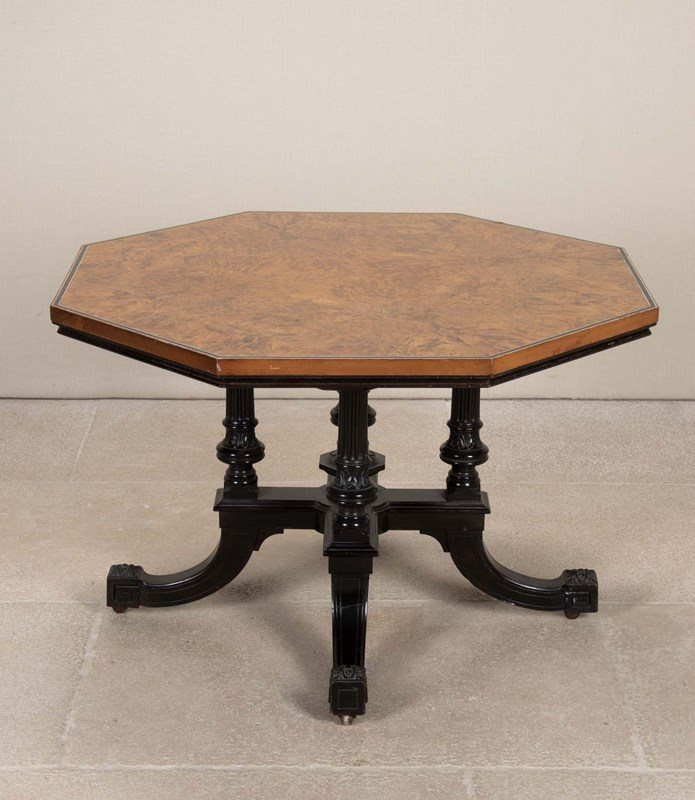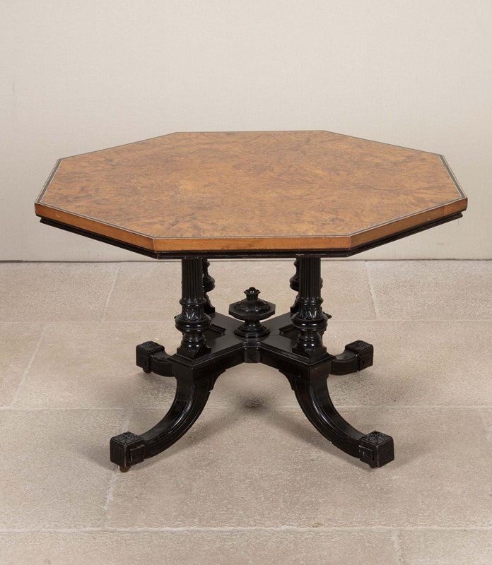 With segmented burr oak top with an ebony band around the top edge. Raised on an ornate ebony base consisting of four decoratively carved columns onto a X stretcher again raised on four kick curved square legs. On original castors.