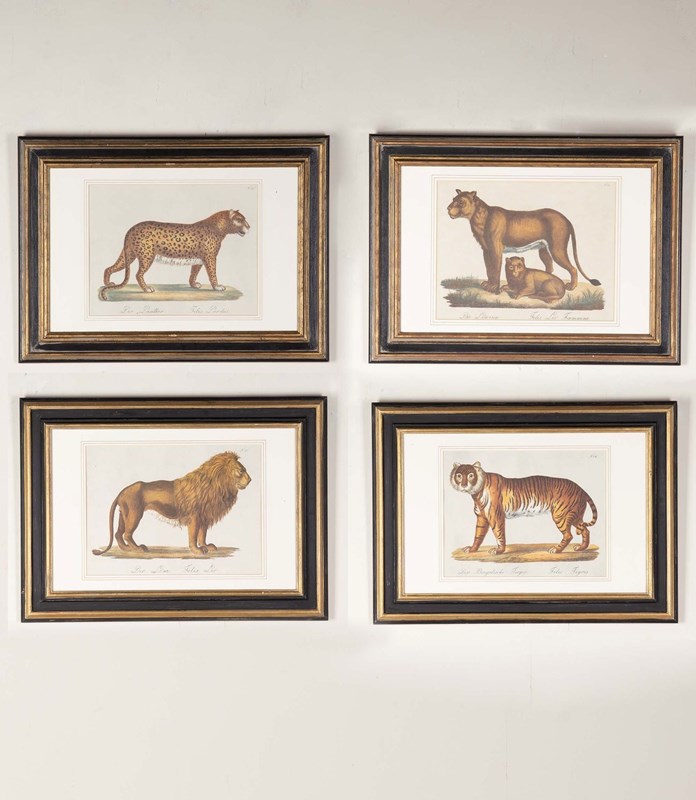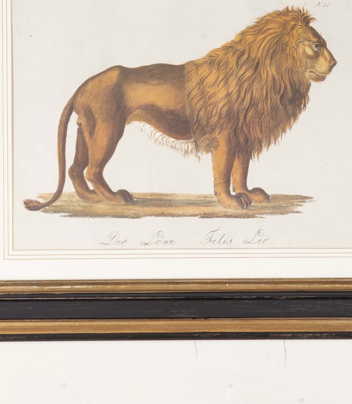 Set of Four Mid-19th Century, Brodtmann (Carl Joseph) hand-coloured lithographs from 'Naturhistorische Bilder-Gallerieaus dem Thierreiche'.Including: The Lion; The Lioness; The Bengal Tiger; The Panther, all framed and glazed. 1816.