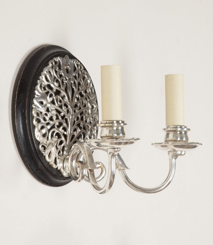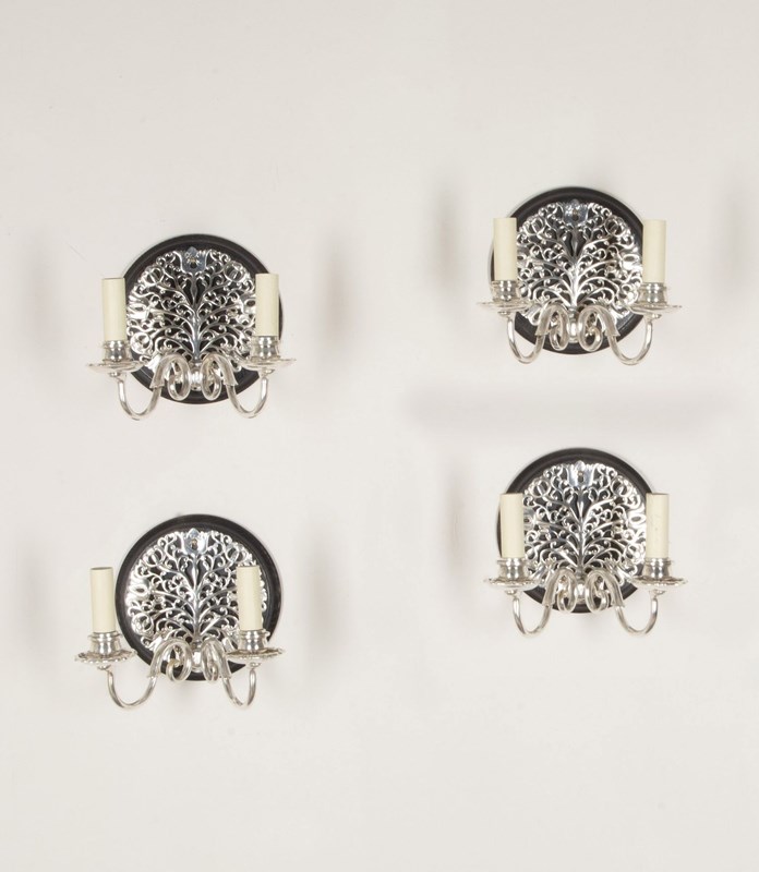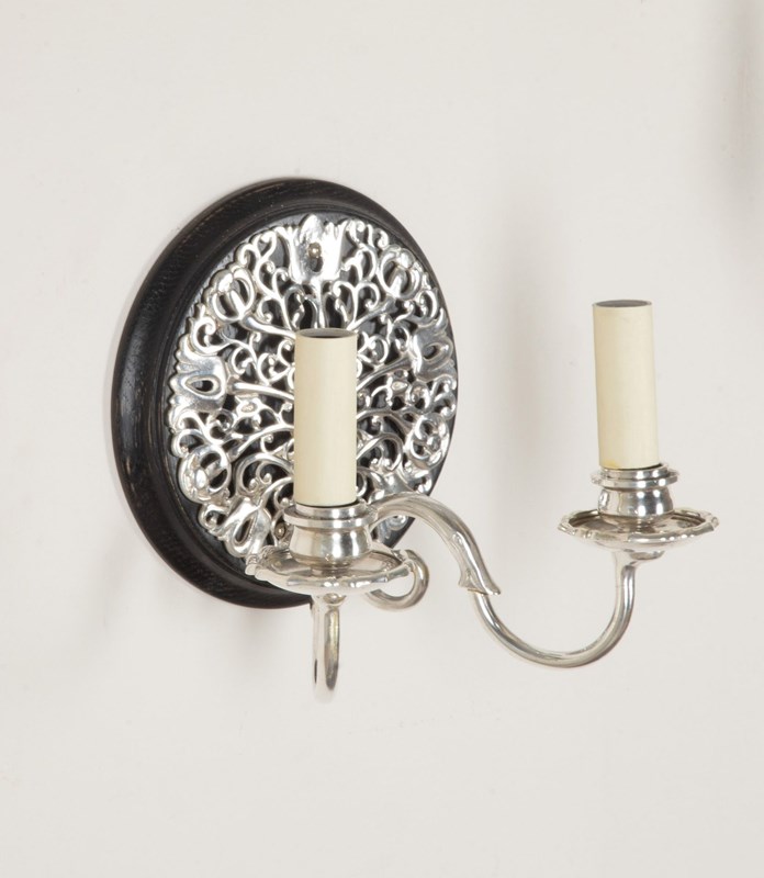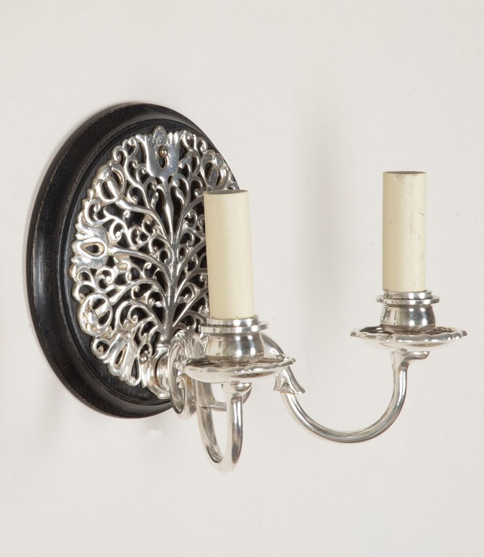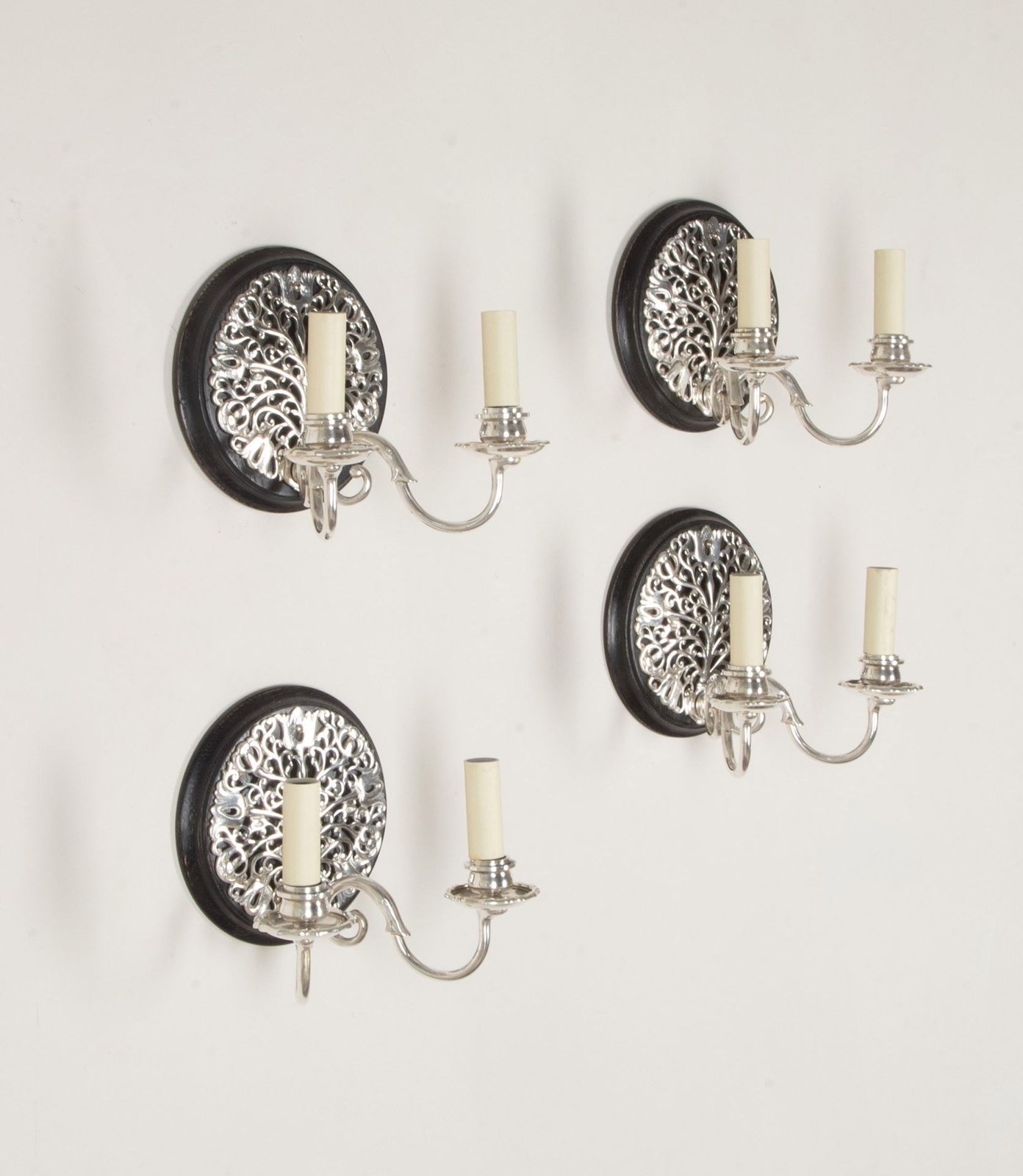 Lovely set of four early 20th Century English Arts & Crafts wall sconces on ebonised oak backplates. Pierced foliage design. In the style of Earnest Gimson and the Cotswold School. A matching chandelier is also available. Un-laquered silver plate on cast brass. Fully rewired and PAT tested to UK standards.