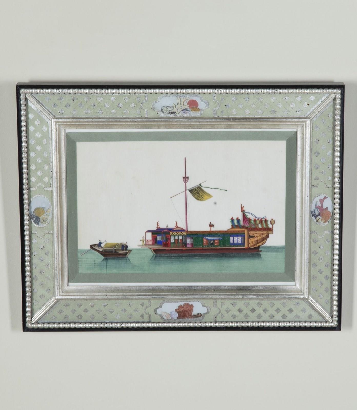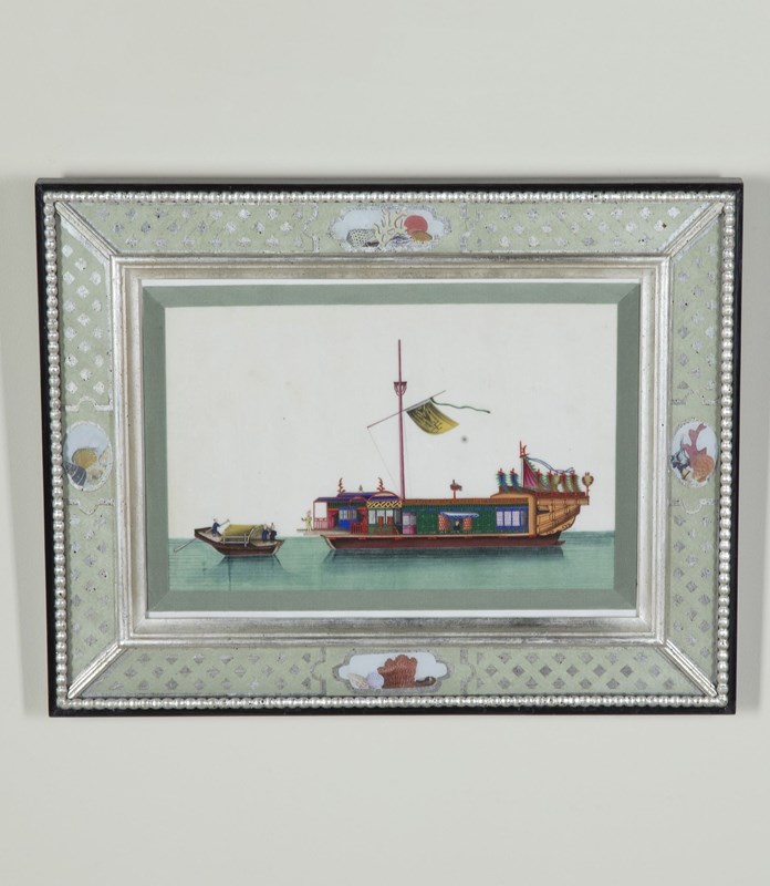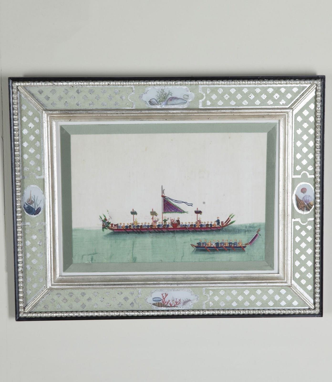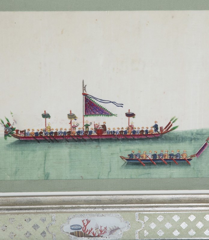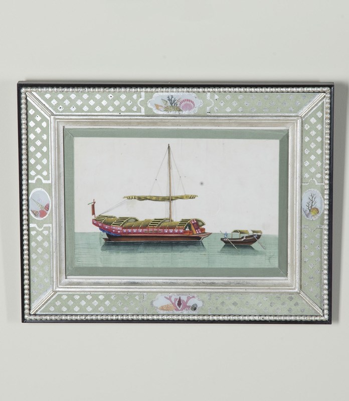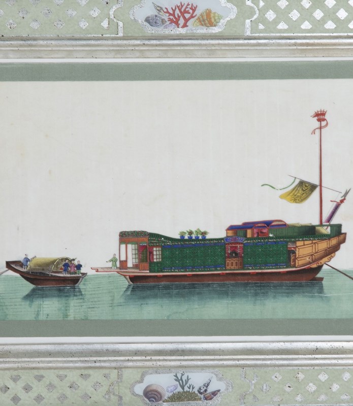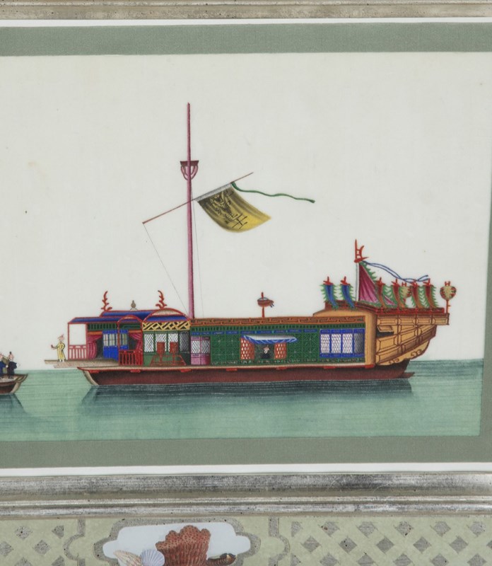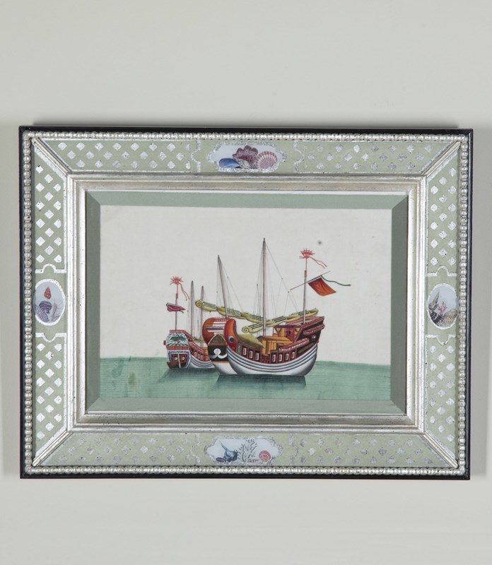 There are minor restorations to two of the paintings. Presented in a hand decorated chinoiserie frames with shell and coral motifs.