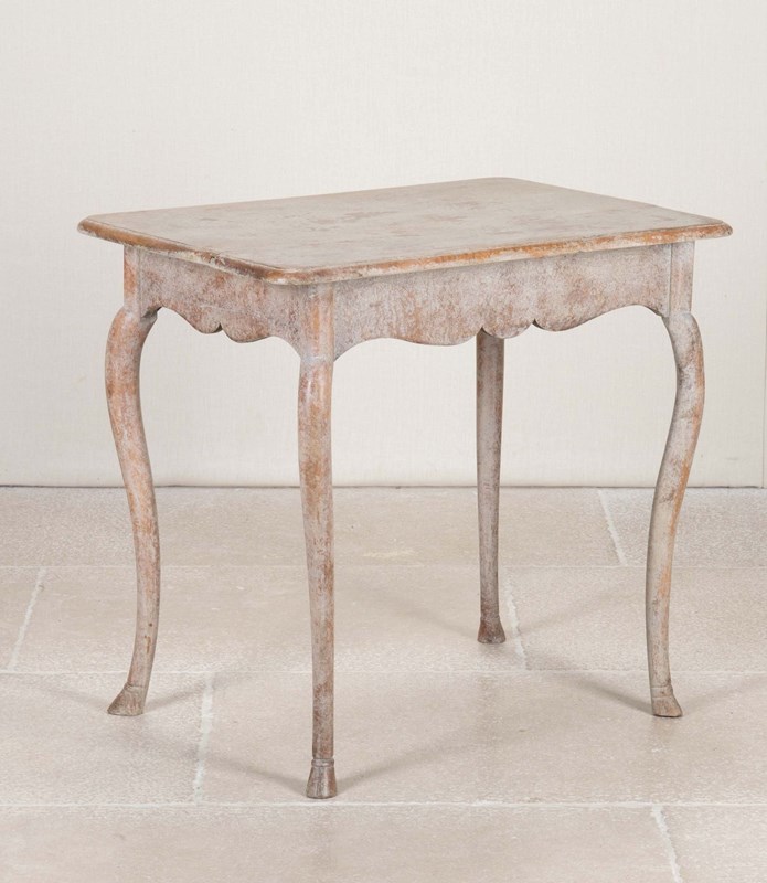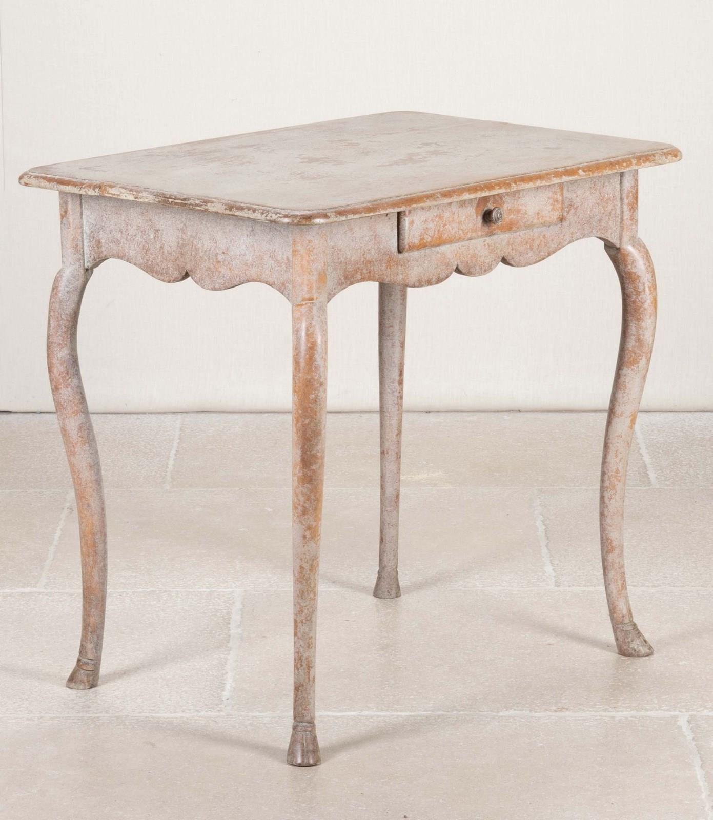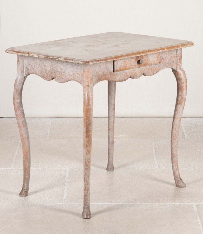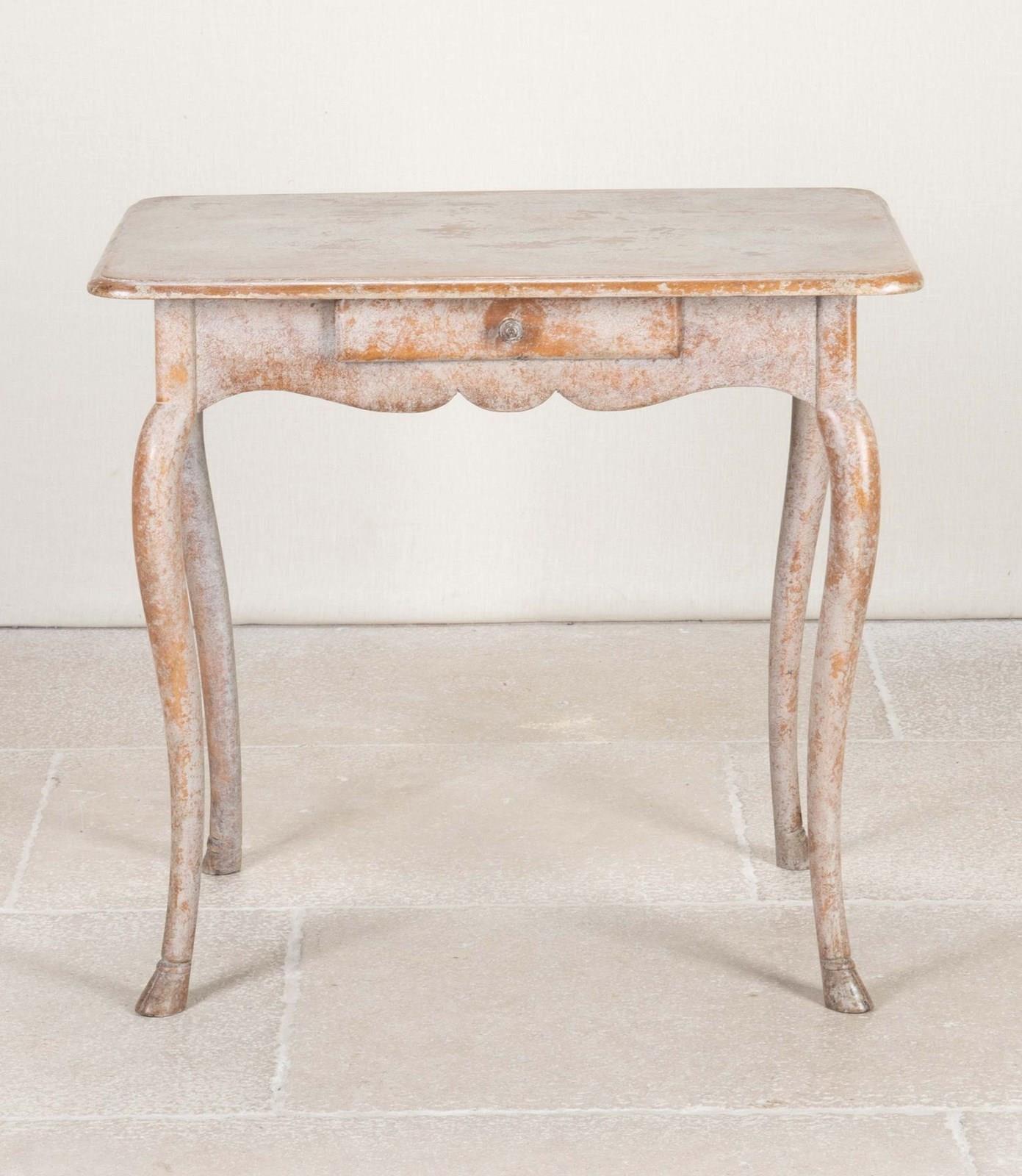 With small drawer and scalloped detail, the shaped legs end with carved hoof feet. Later repainted.