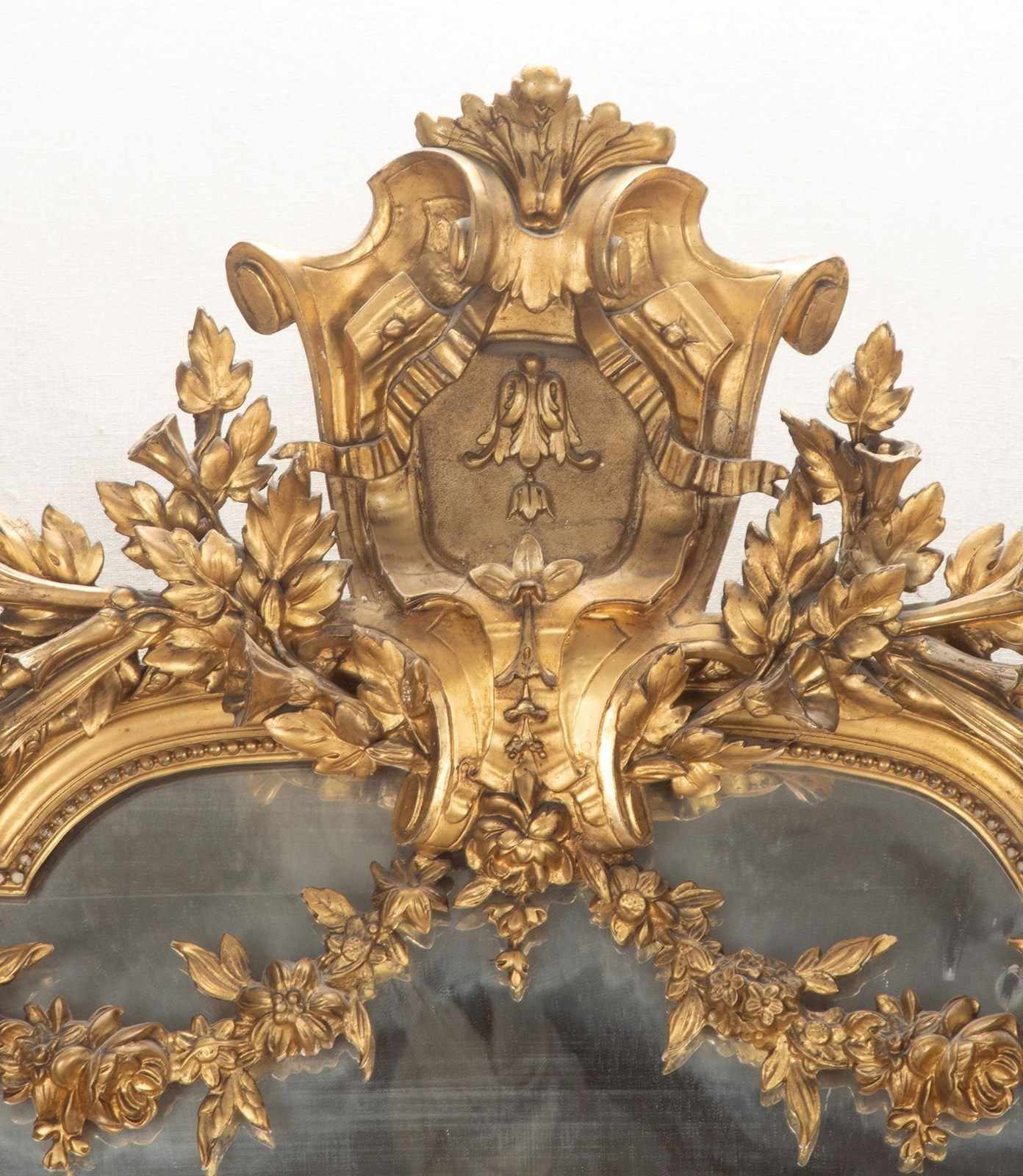 Tall and decorative 19th Century English gilt mirror with a crested top.